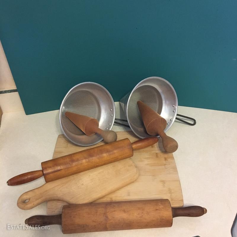 LOT 68- Cutting Boards, Rolling Pins, Metal and Wood Cone Set