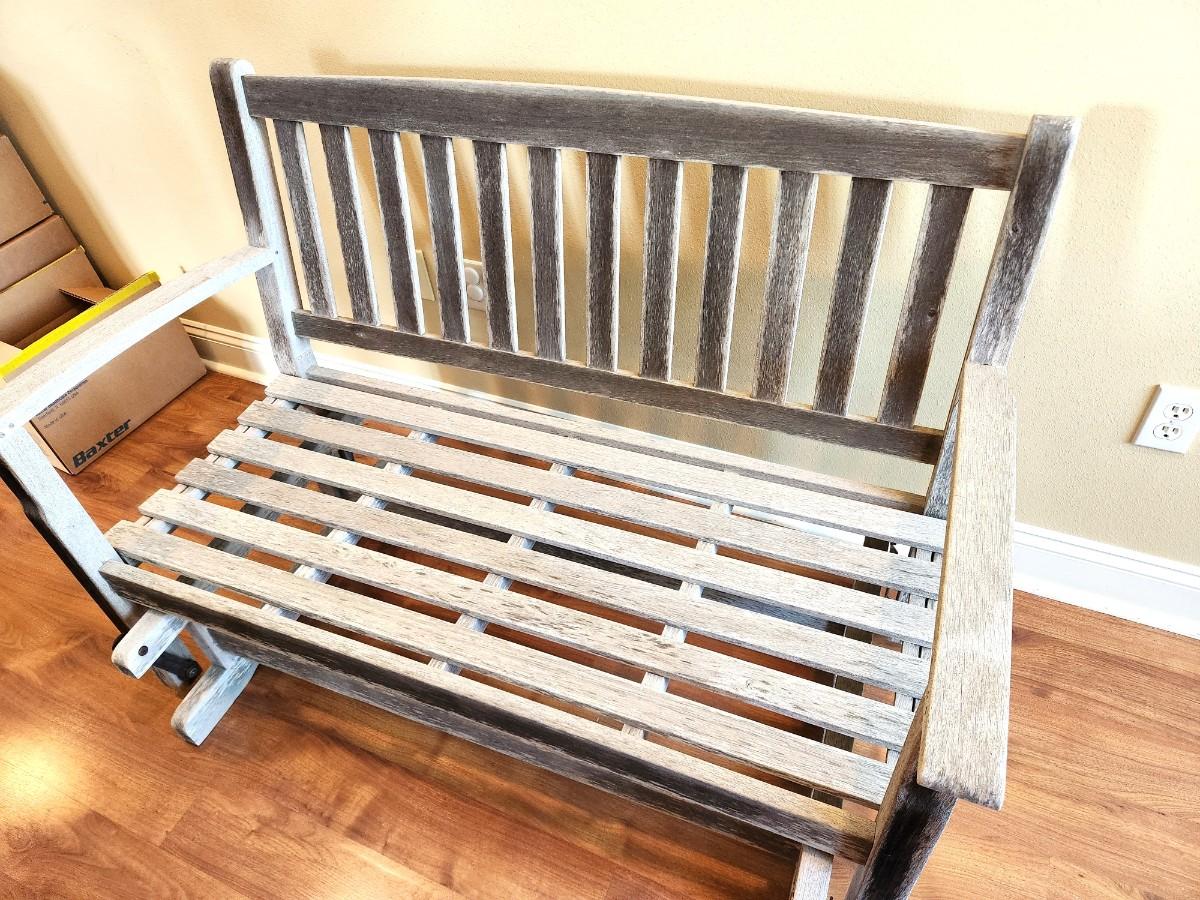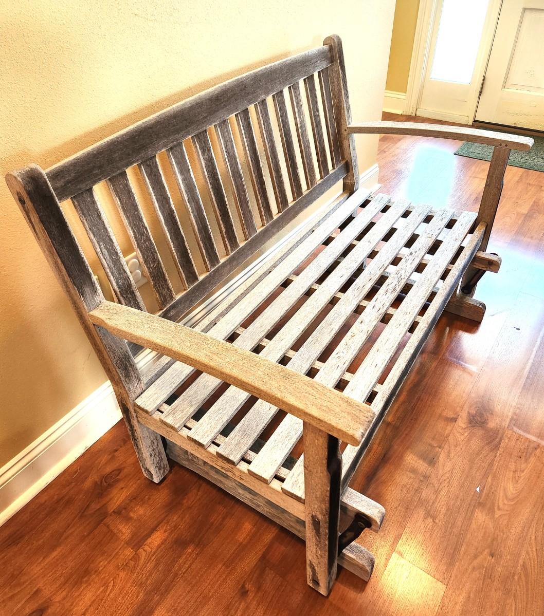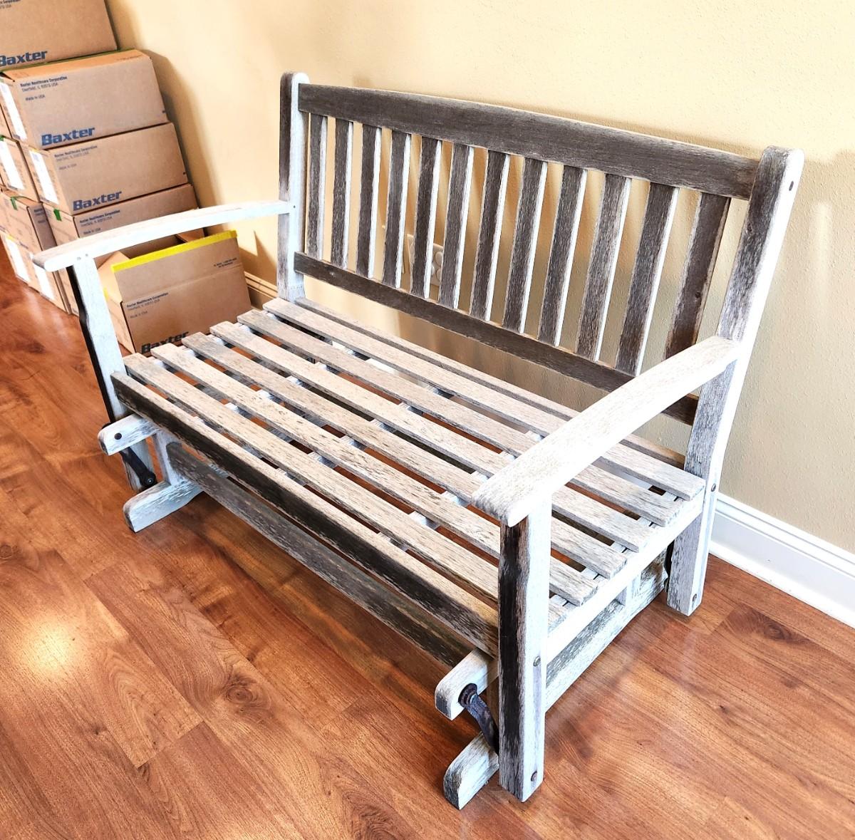 Great cypress (at least that's what we think it is) porch/patio glider. Good condition - action is smooth. 49" across, 25" deep, 34" tall. This item is upstairs.
