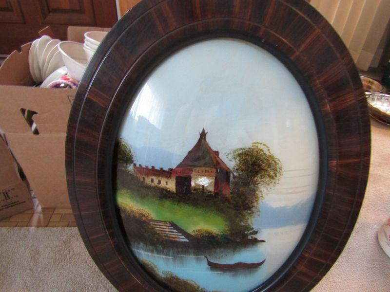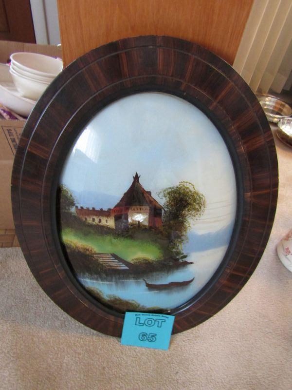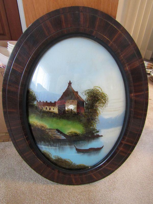 REVERSE PAINTING ON CURVED GLASS IN AN ANTIQUE FRAME