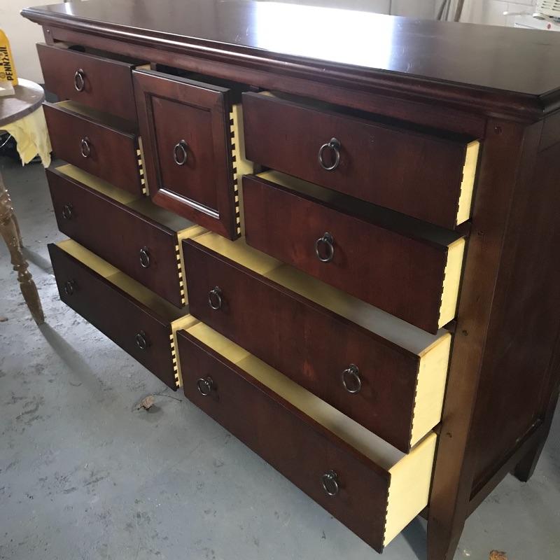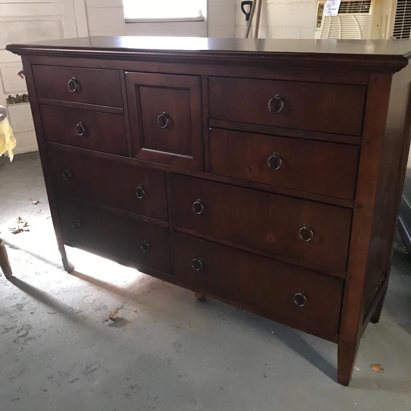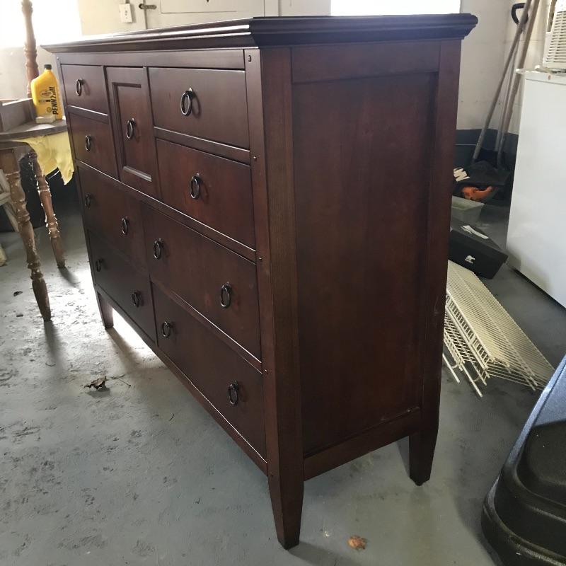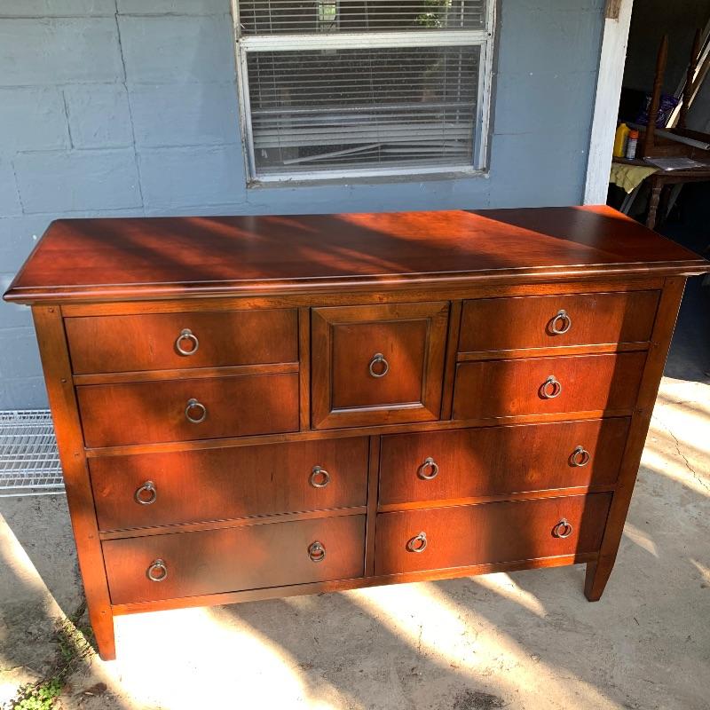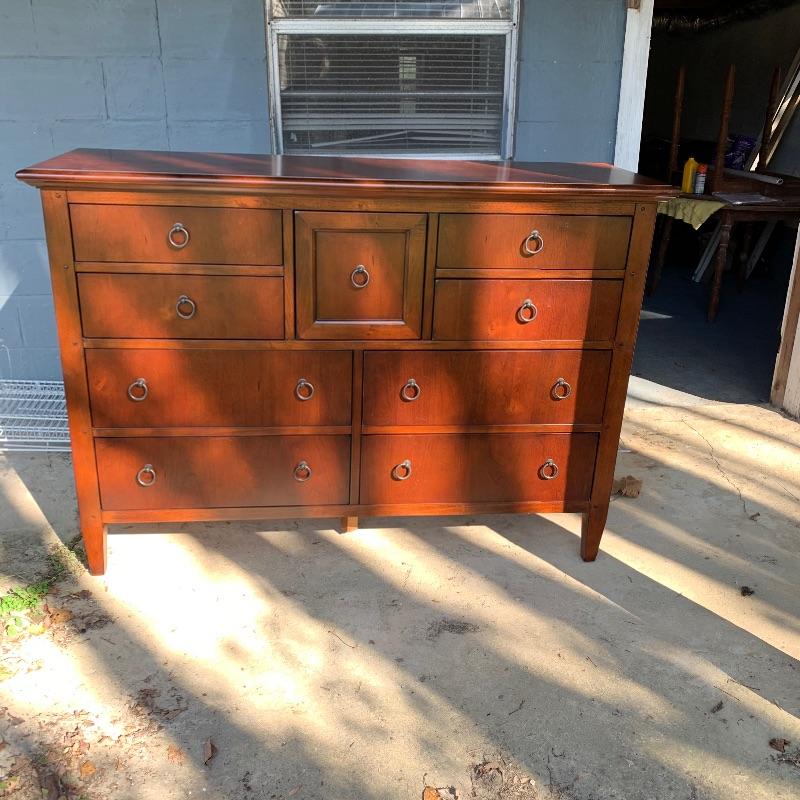 Stunning nine drawer dresser by Hooker Furniture in the Albany Park Collection. Piece has beautiful dovetail drawers and slate-gray metal pulls. Piece is hardwood/cheery veneer with pressed wood back panel. So much storage, this mule chest can work perfectly in any room in the house. Dresser measures approximately 60” x 19” x 43”. Please bring help to load. Local pick up only.