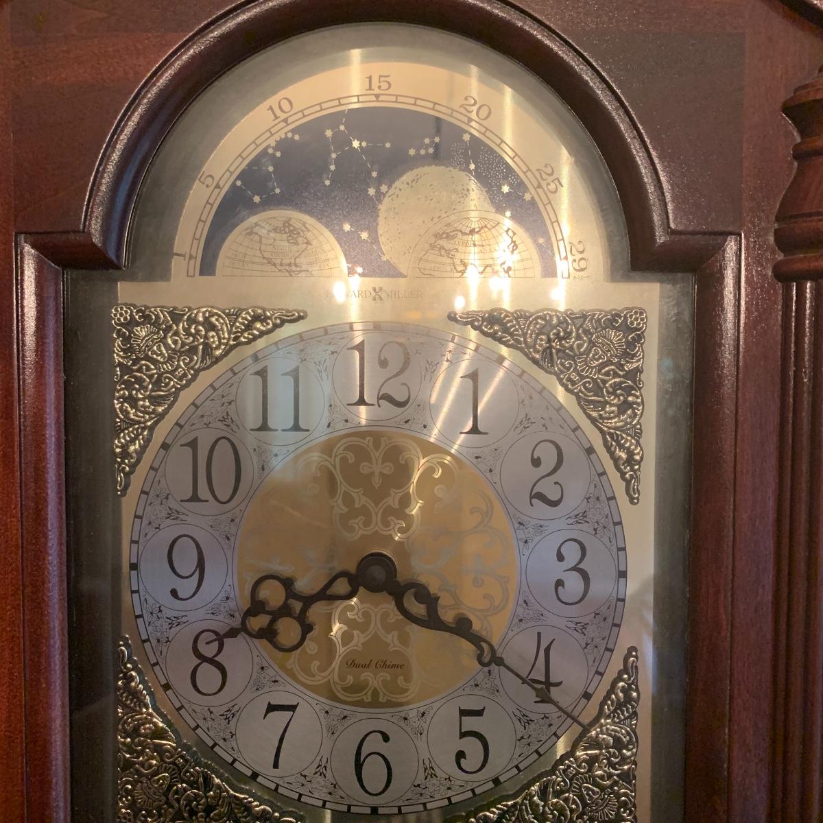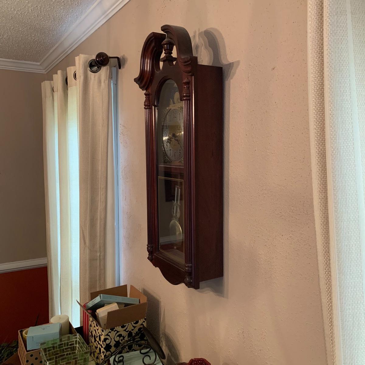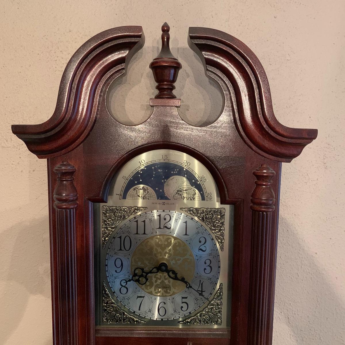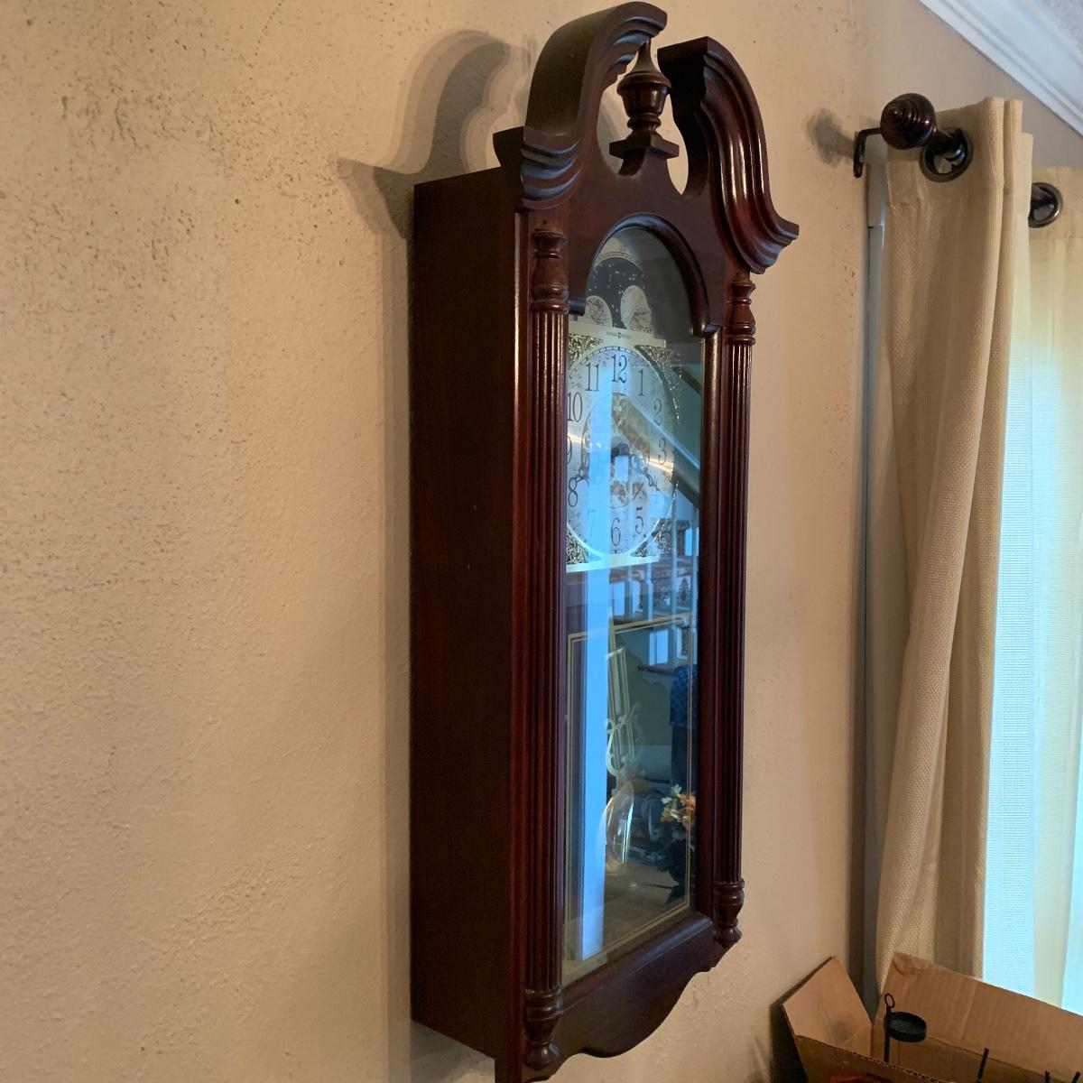This is one handsome clock. Manufactured by Howard Miller, this classic time piece is in beautiful condition! The clock features gold colored accents and dark stained wood with dual chimes. It operates off batteries and the pendulum is working but we cannot make any guarantees on it’s time accuracy. It measures 11” wide X 29” tall X 5” deep.