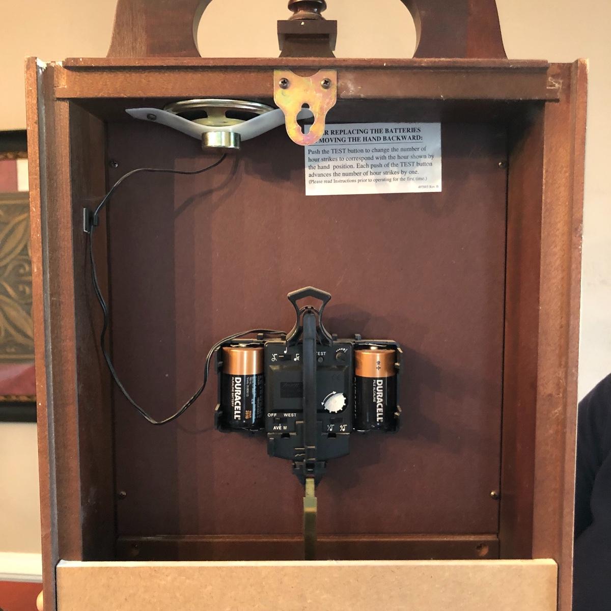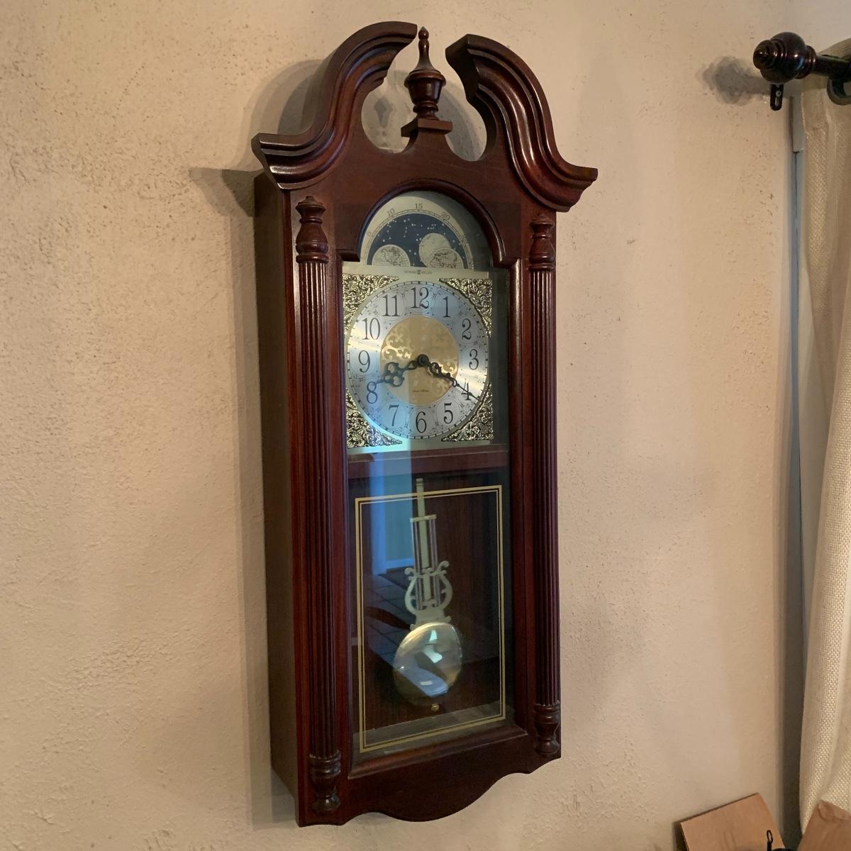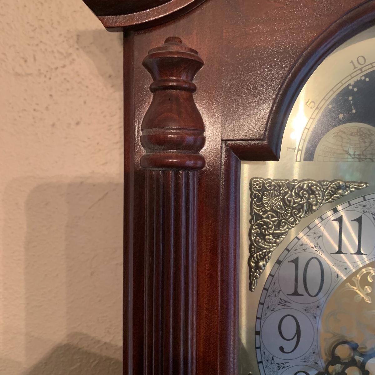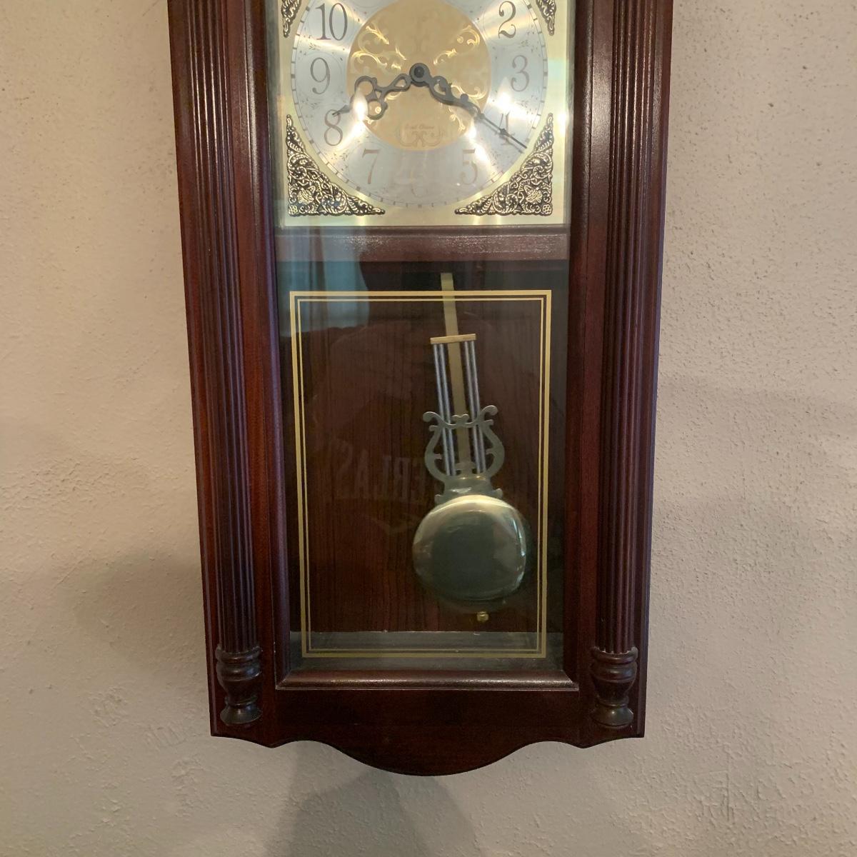 This is one handsome clock. Manufactured by Howard Miller, this classic time piece is in beautiful condition! The clock features gold colored accents and dark stained wood with dual chimes. It operates off batteries and the pendulum is working but we cannot make any guarantees on it’s time accuracy. It measures 11” wide X 29” tall X 5” deep.