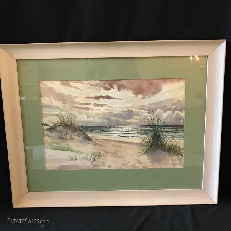 Watercolor beach scene in light wood frame. Signed Kenneth Harris '49. Great piece of art that makes you long for the beach. Measures 30.5" l x 23.5"w.