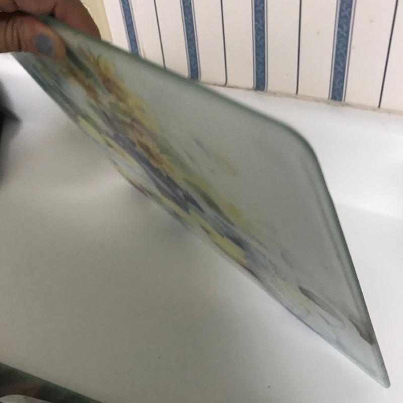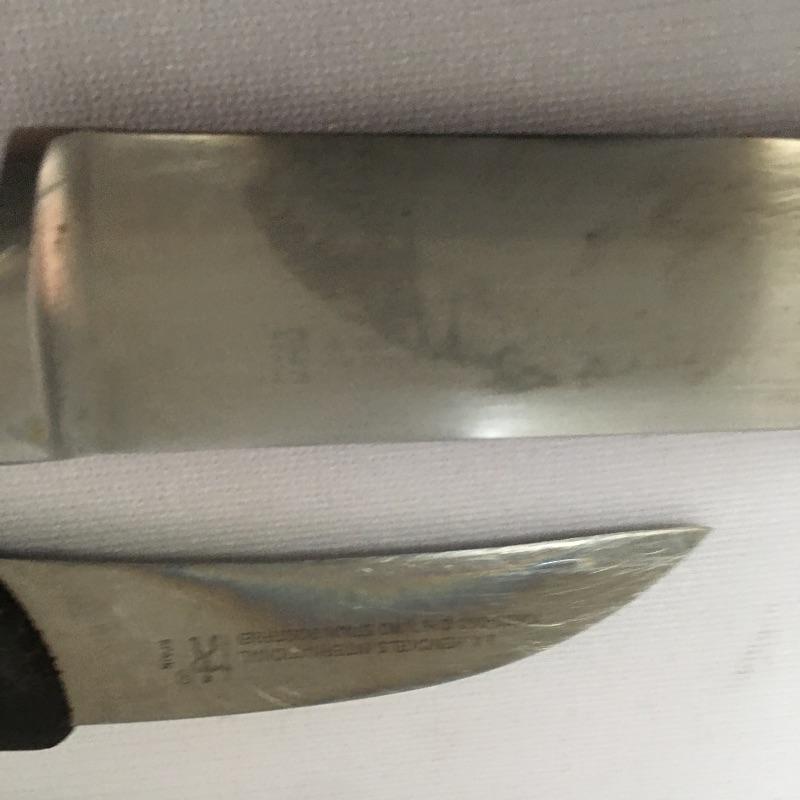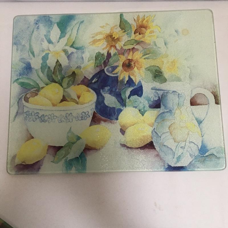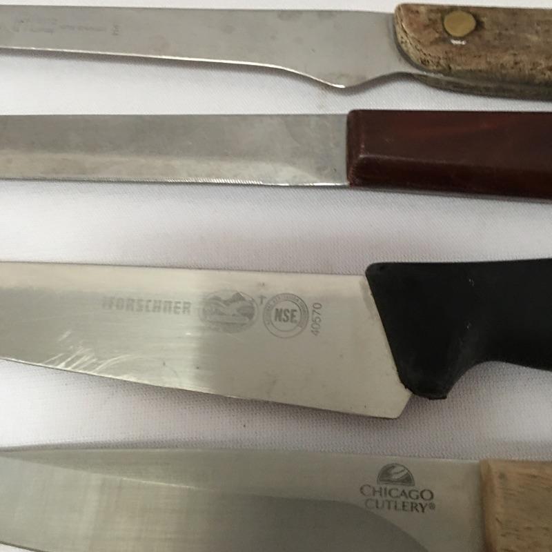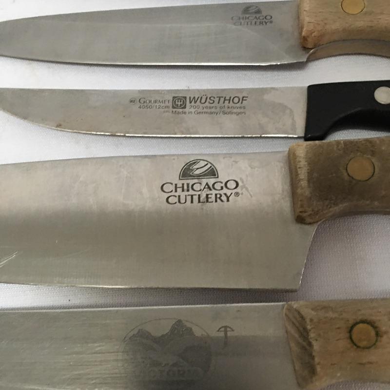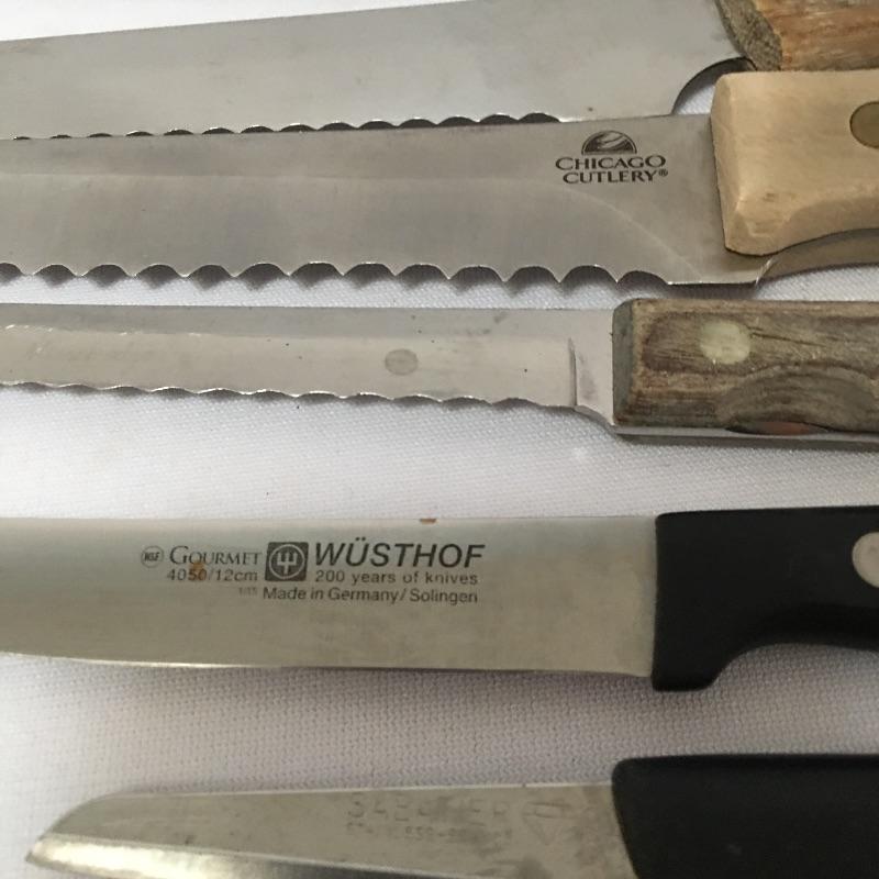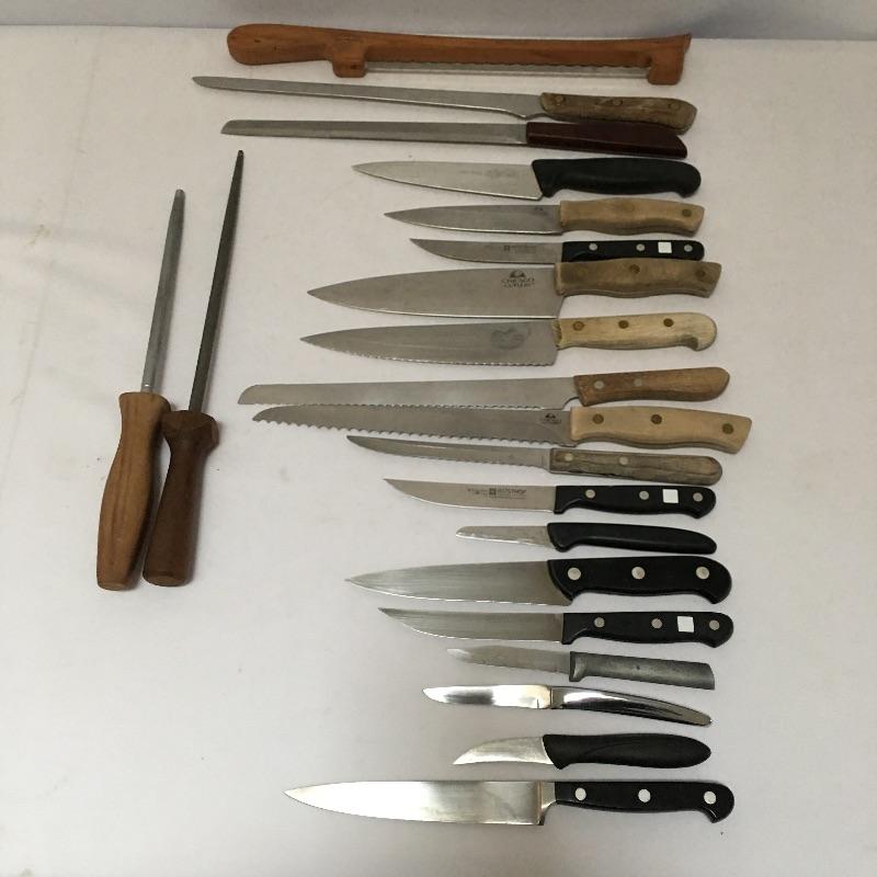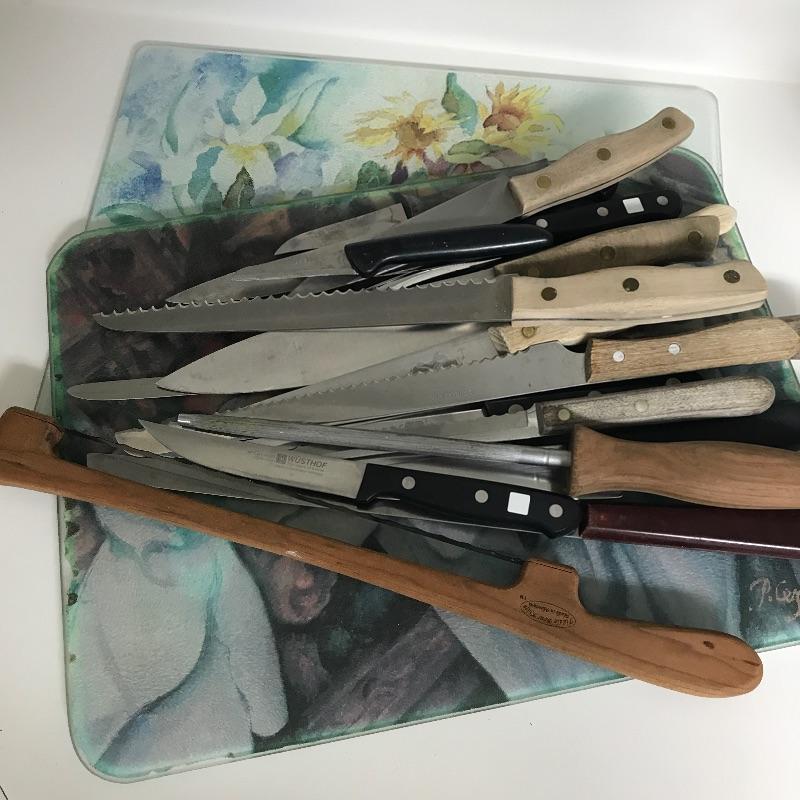 Array of twenty knives in a variety of sizes and styles by makers Chicago Cutlery, Victoria, Wusthof, Forschner, JA Heckles. Longest knife measures 16.5” long. There are also two floral glass cutting boards.