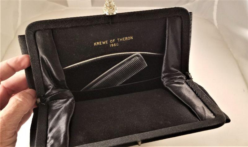 Nice peau de soie evening bag - krewe favor, Krewe of Theron, 1960 - stamped inside. Still has the original comb, etc. Looks as though never used. SCARCE.
