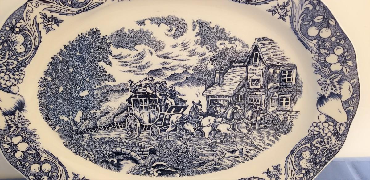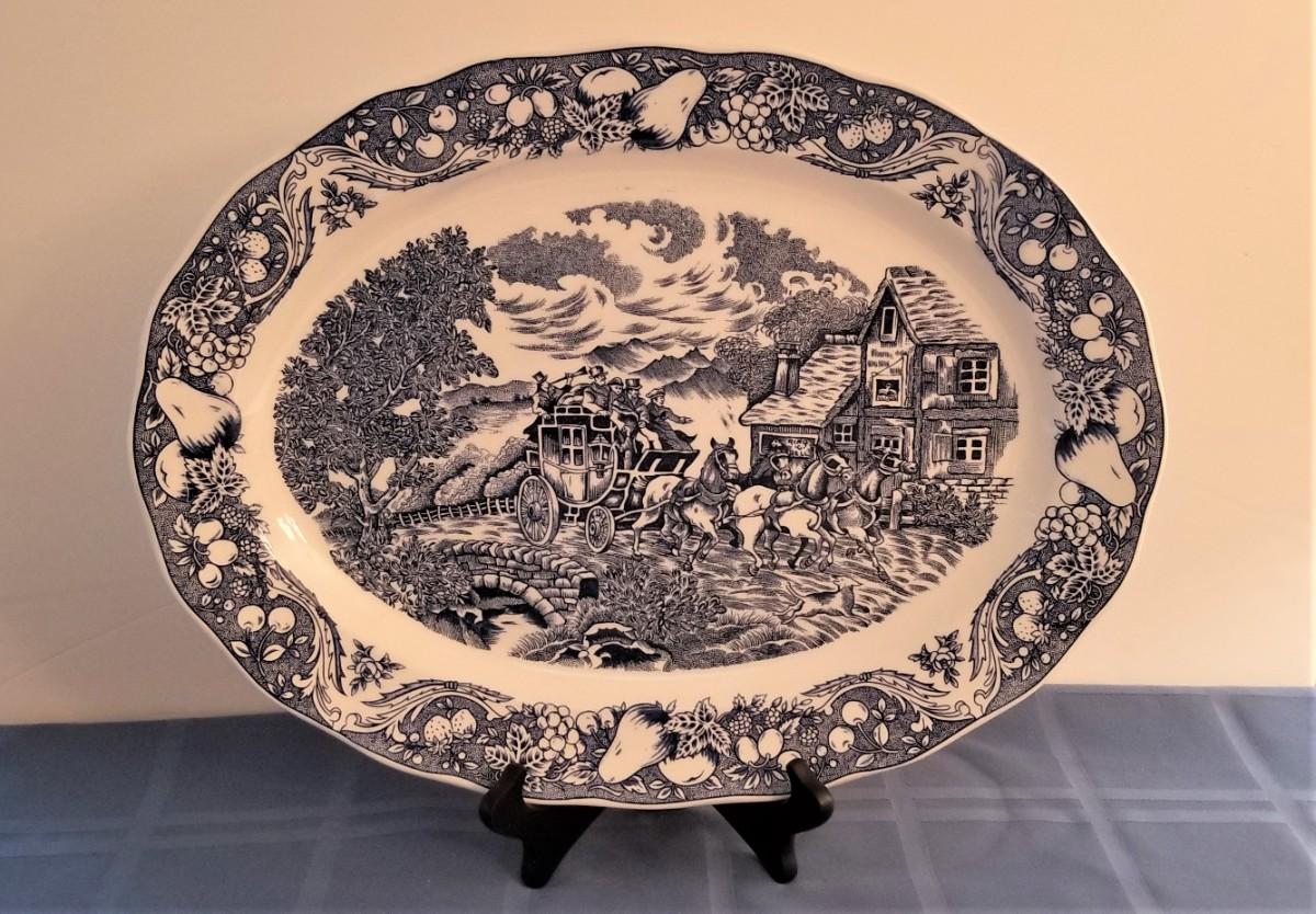 Large Blue/white platter marked "Sanyei, Japan" on reverse. Measures 18" across, 13.75" tall. Excellent conditioin.