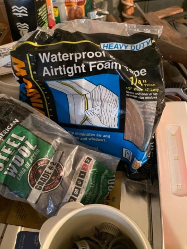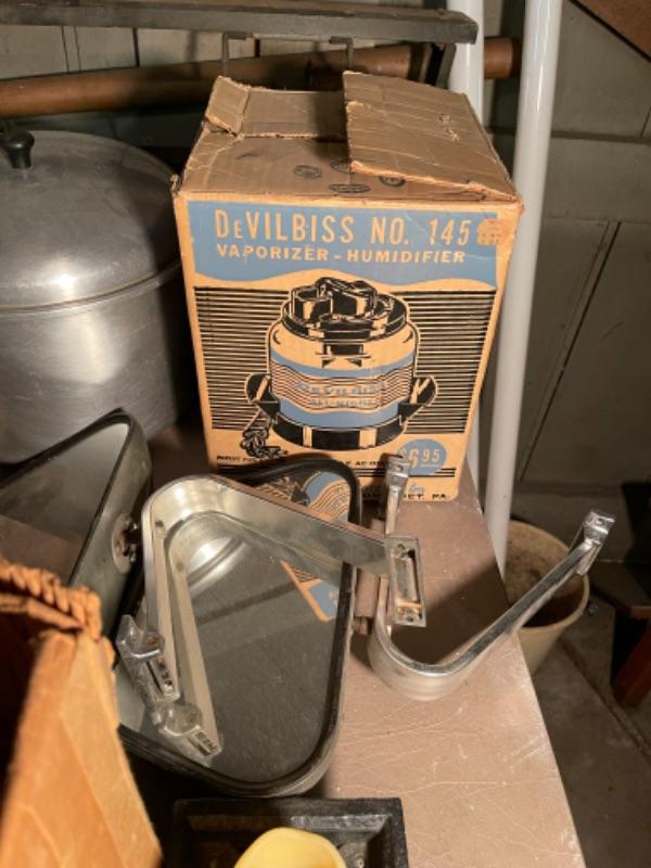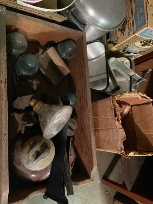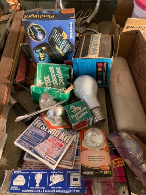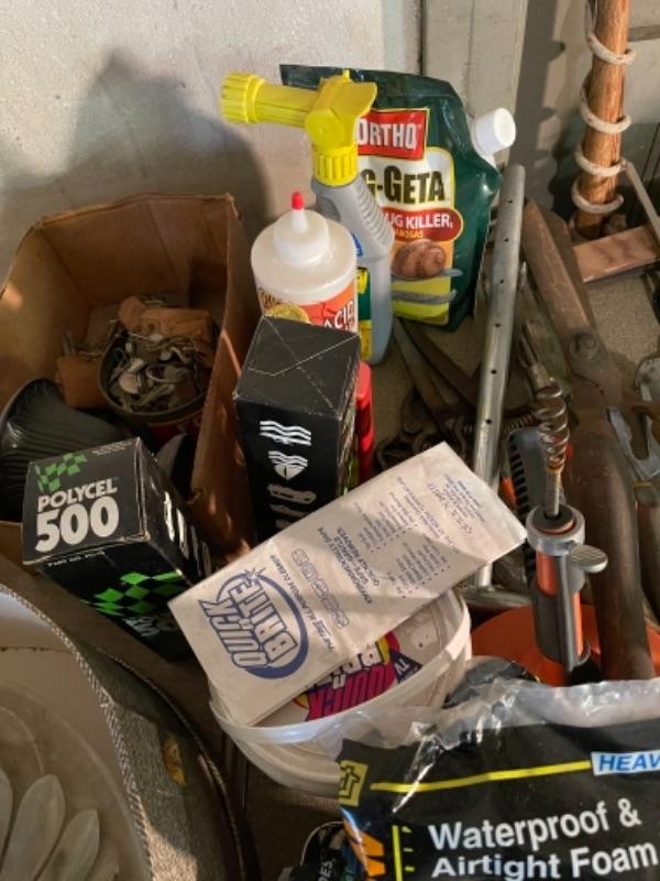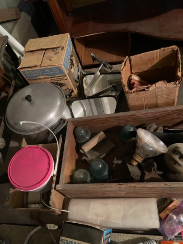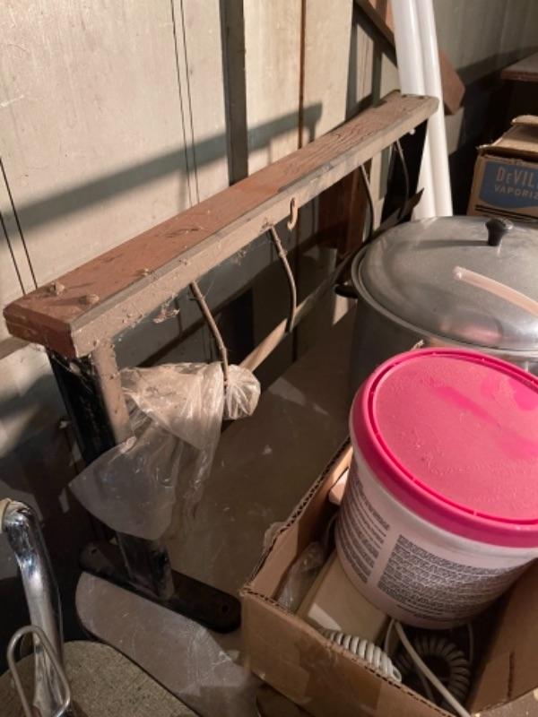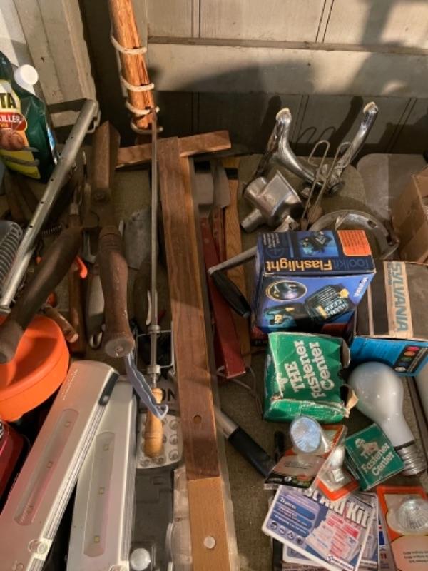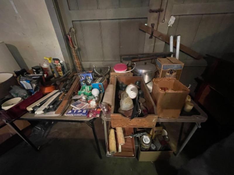 Lot 168. Large lot of hardware, cookware, vintage paper roll, BBQ utensils, plumbing snake--$40