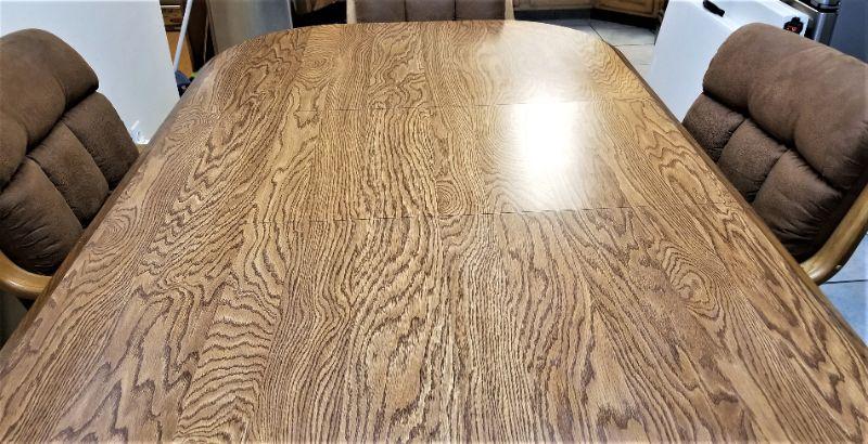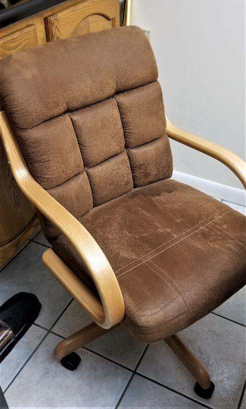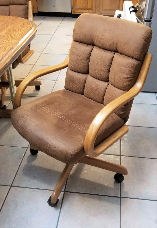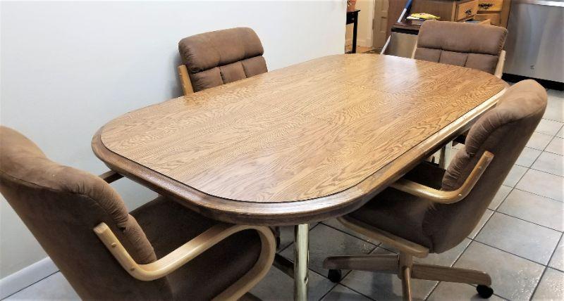 This set probably dates from the early 1970's - shown with leaf inserted. Four suede chairs on casters. Table is in good used condition - 70.5" x 42" (with leaf) - 30" tall. Chairs are 22.5" wide, 27" deep, and 36" tall. Three chairs in good condition, one could use a cleaning.