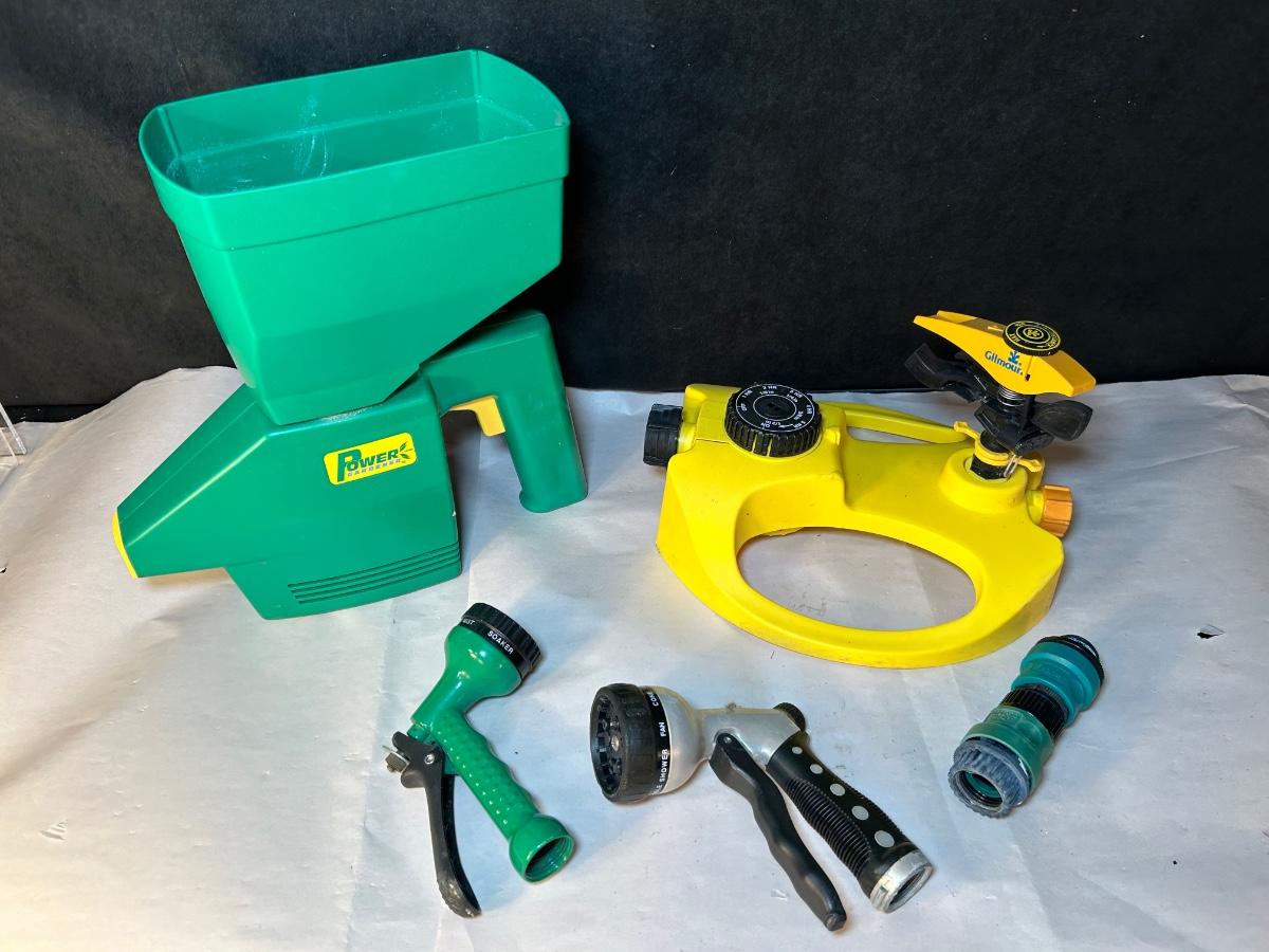 includes hand spreader, 3 hose accessories and lawn sprinkler