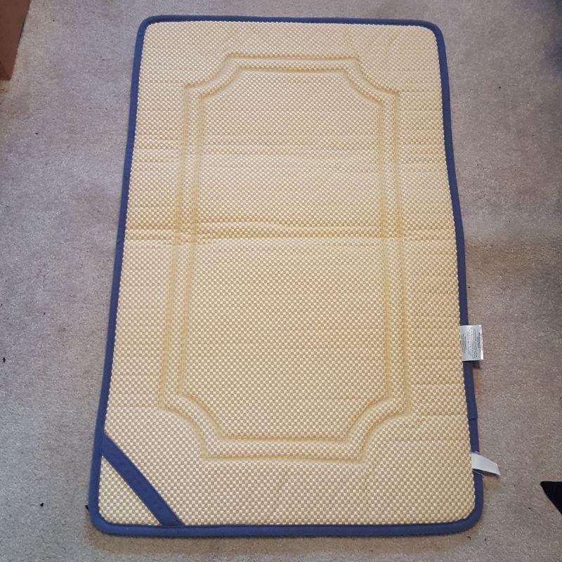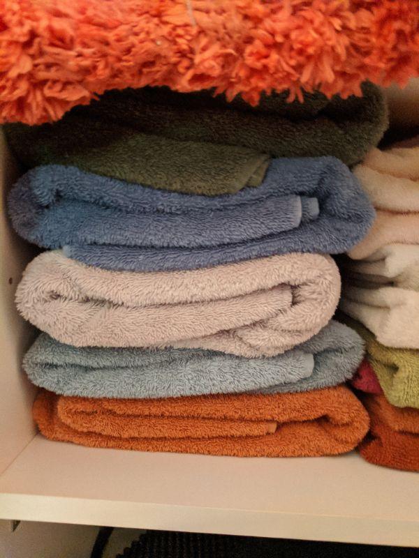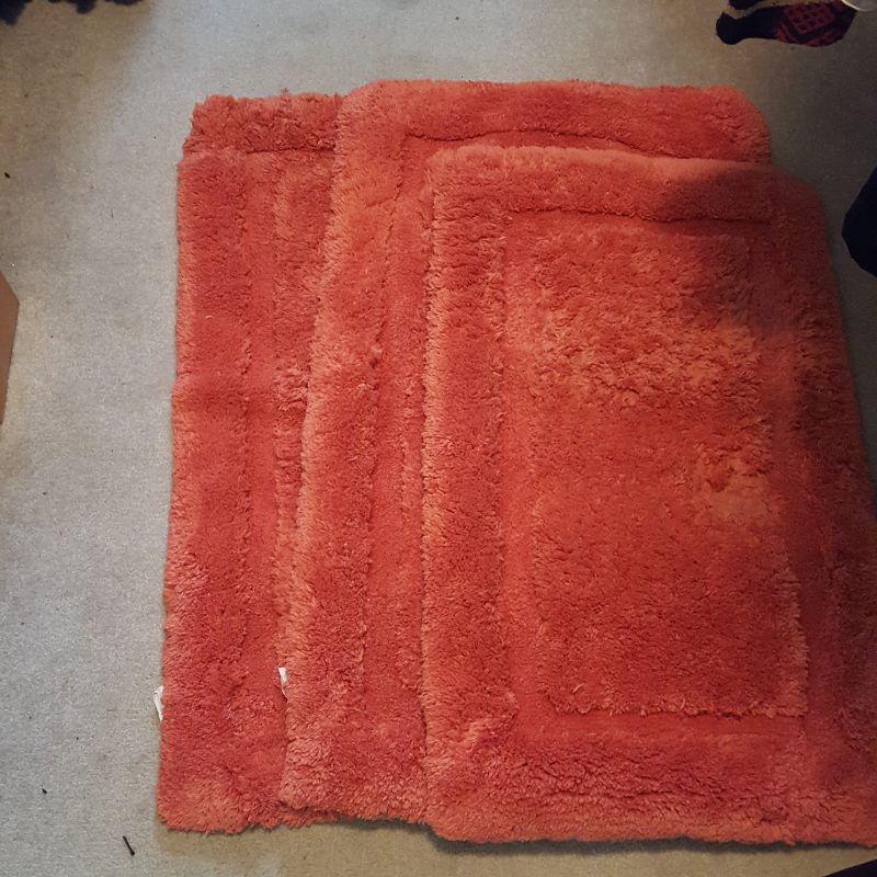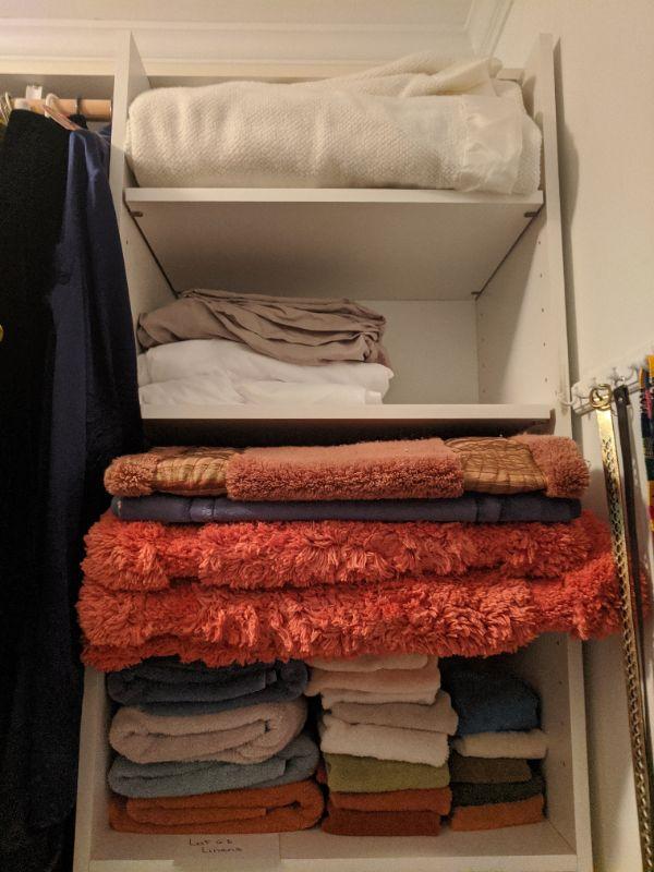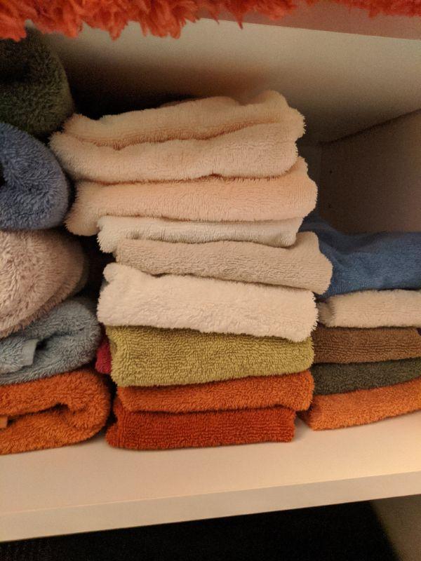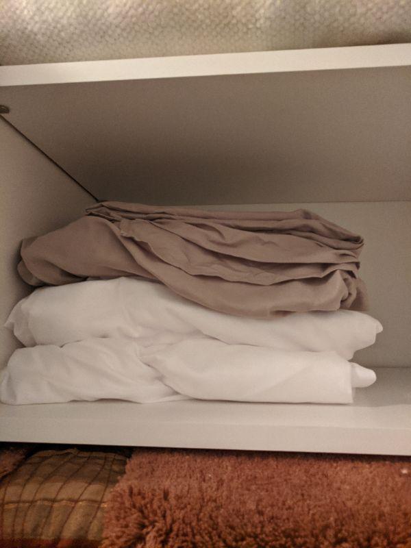 Nice assortment of towels, linens and a blanket here. The tan sheets with a fitted, flat sheet and pillow case are a twin size.The white full size sheets have a fitted, flat and two pillow cases. The white acrylic Ralph Lauren blanket measures 90"x90". The white cotton blend blanket measures approximately 86"x100". This lot also includes towels in a good range of sizes and colors that includes washcloths, regular sized towels, and 4 bath mats. The peach/rose colored 3 bath mats have two the same size (39"x25") and one smaller one. The blue bath mat has a rubbered bottom.