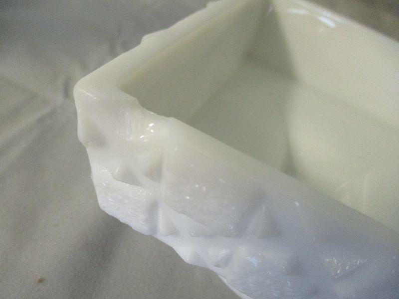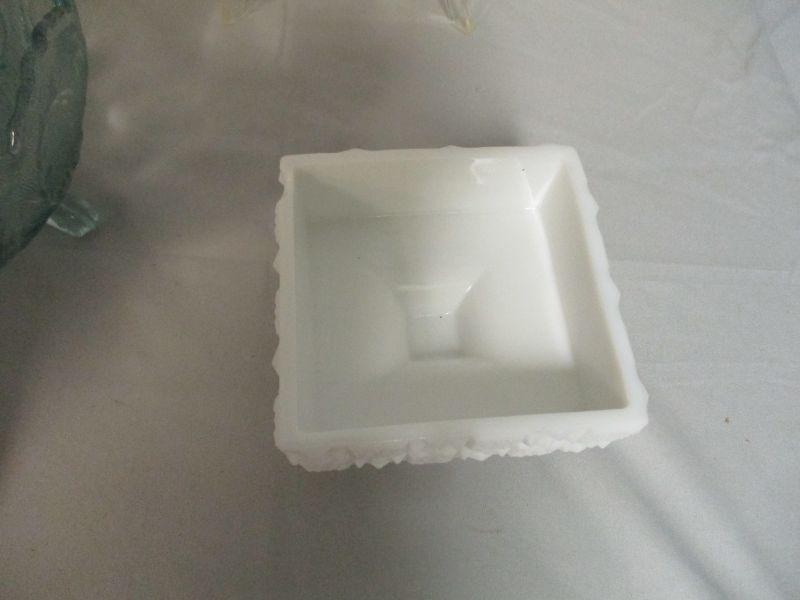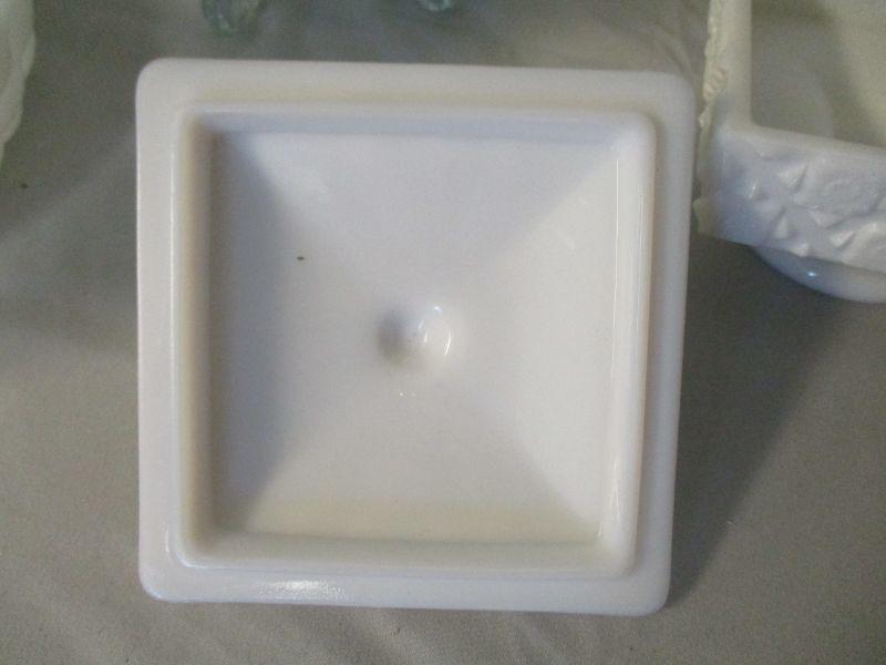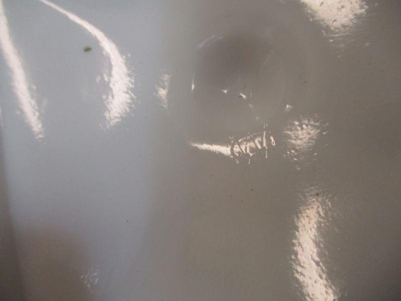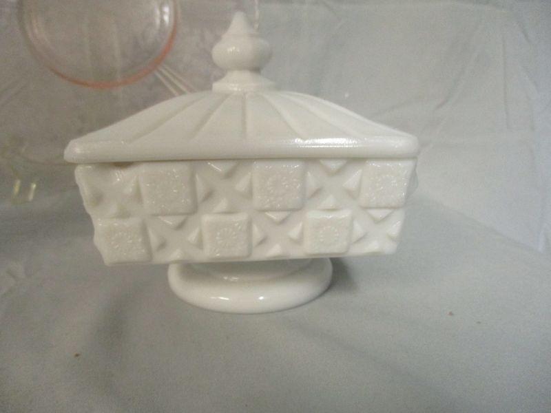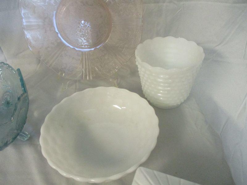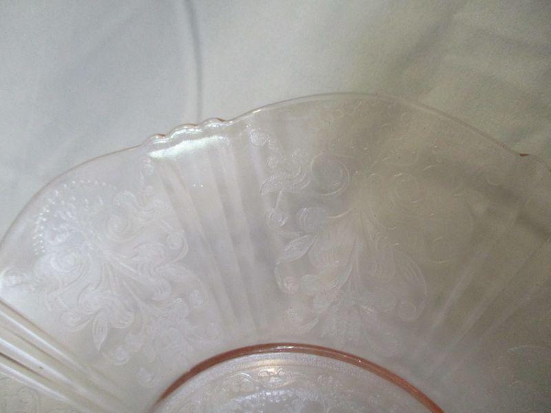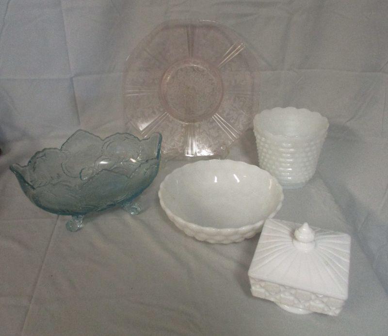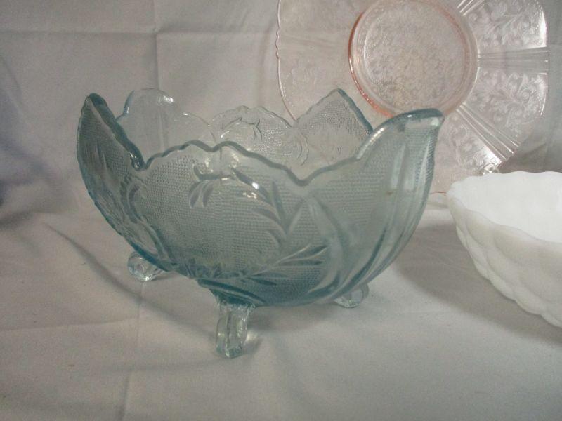 Two of the milk glass pieces are MCM pieces by Anchor Hocking, while the candy dish is marked Westmoreland and the Old Quilt pattern. Notice that there is a chip on the rim of the piece. The pink platter is about 11.75" in diameter and is the American Sweetheart pattern by MacBeth Evans made between 1930-1936. I didn't find any issues with this platter. The bluish-green bowl is about 10.25" long and I don't know the pattern, but it is also in fantastic condition.