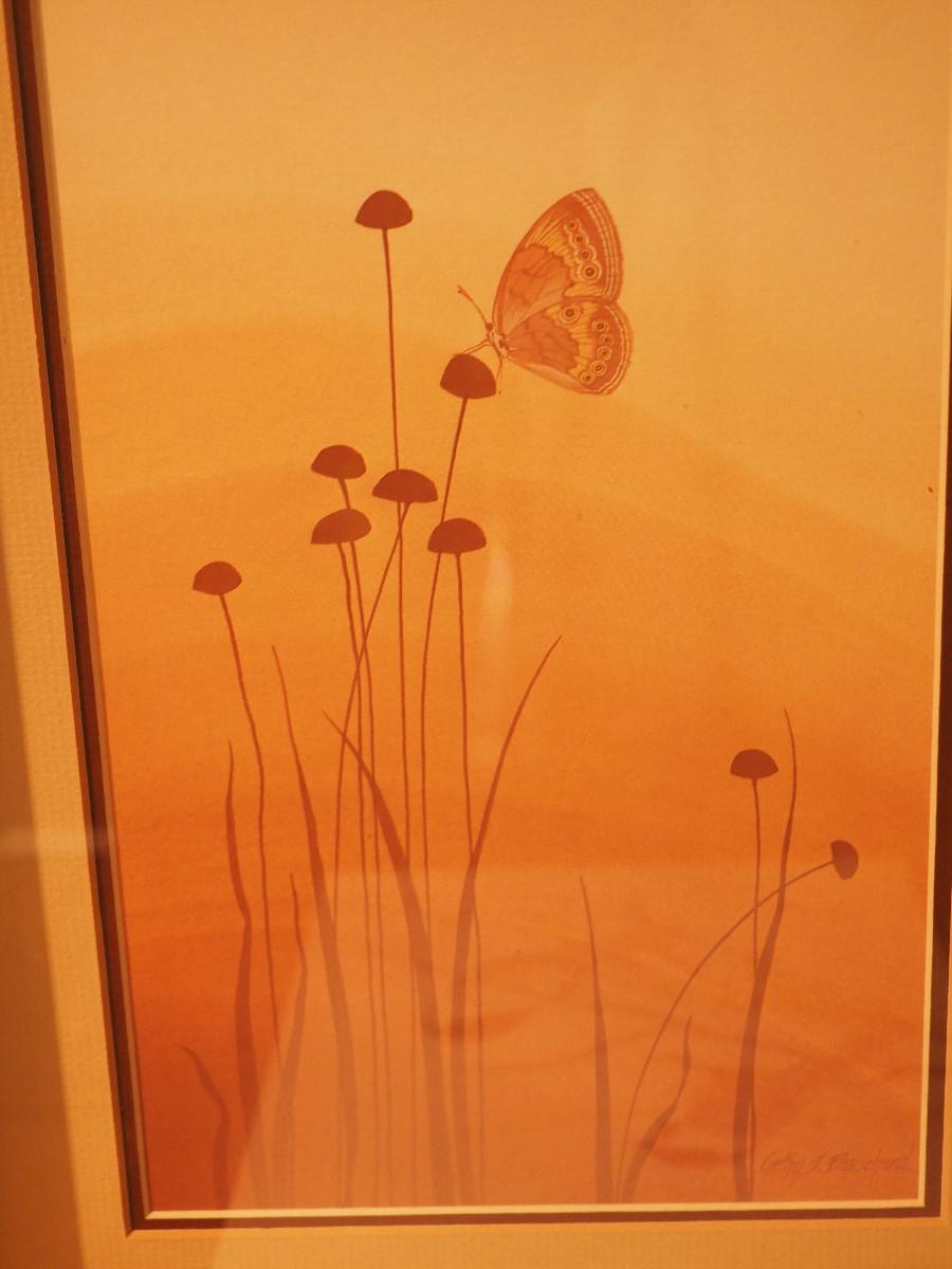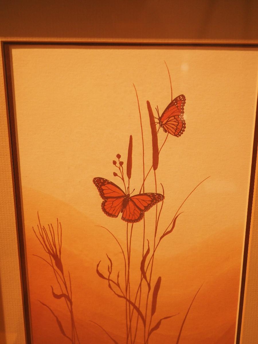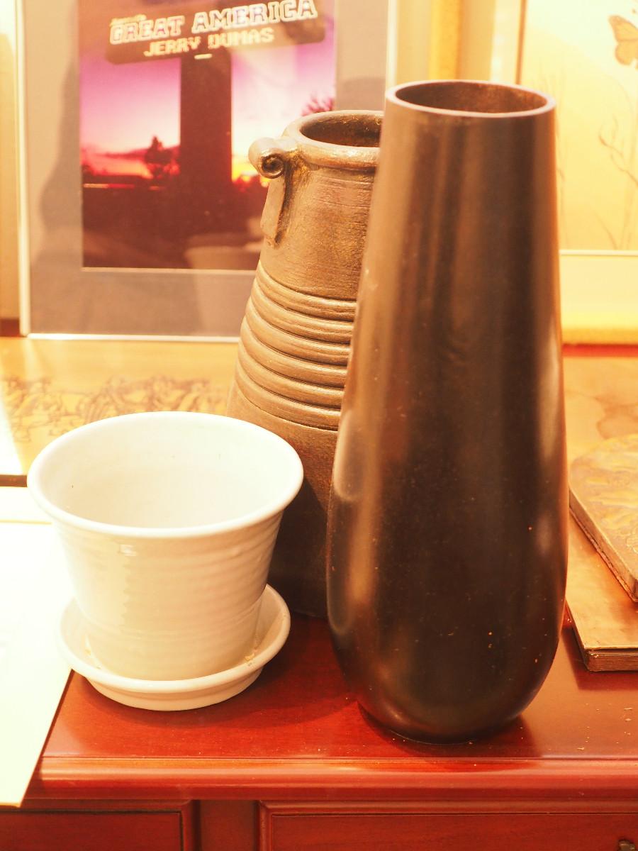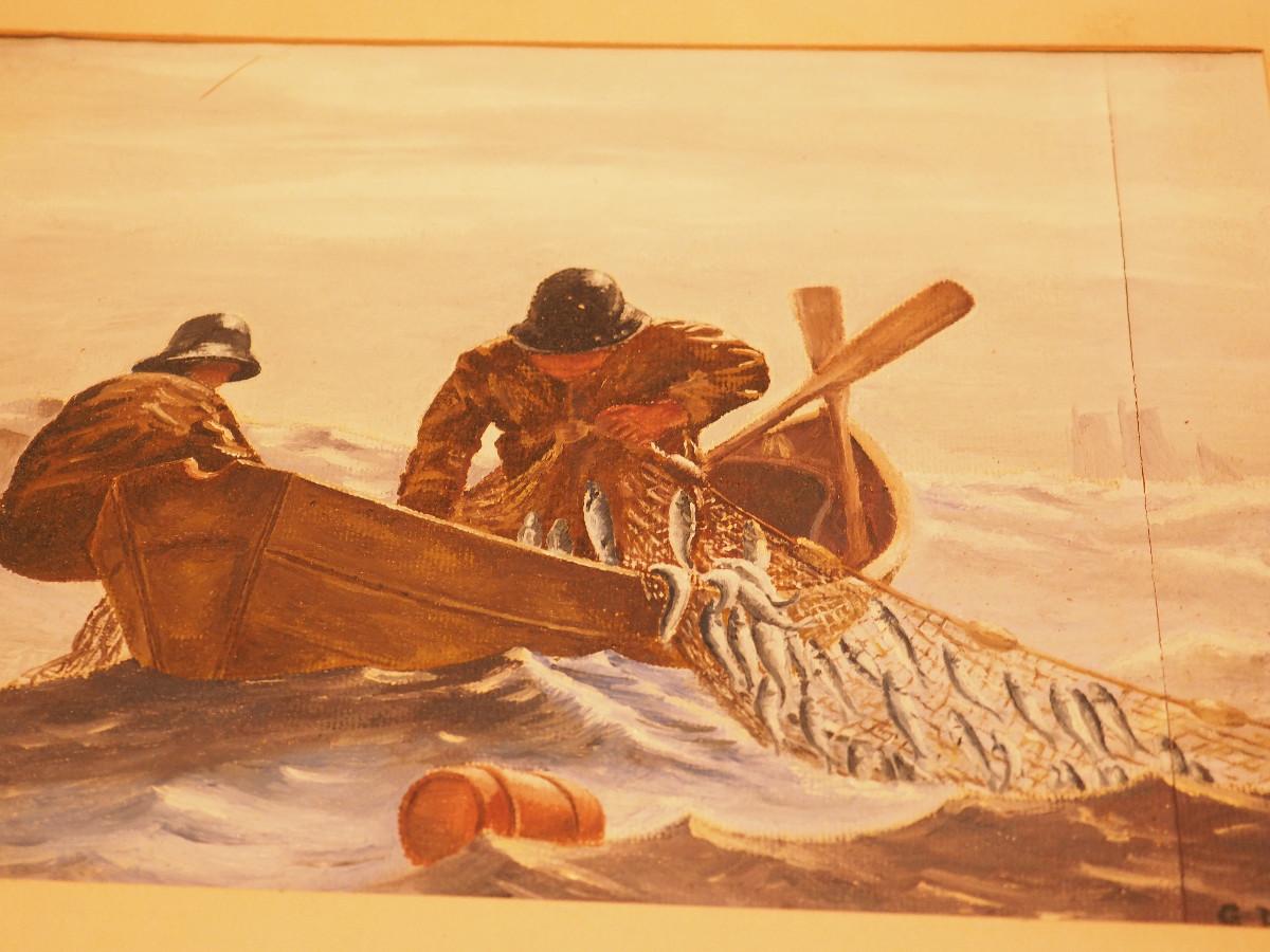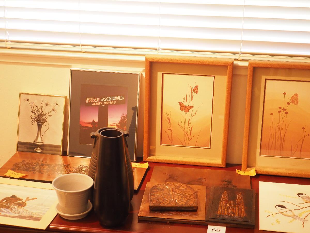 Includes wood-framed nature art, 2 vases, small planter. Framed fisherman art.