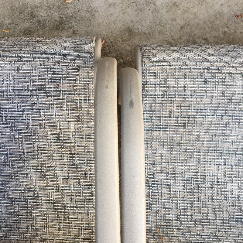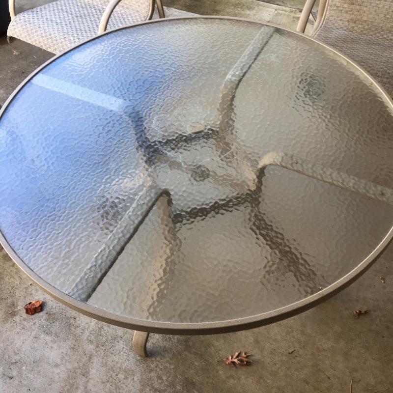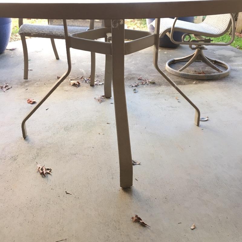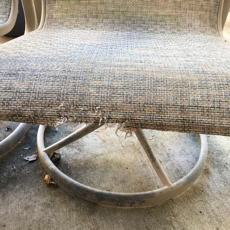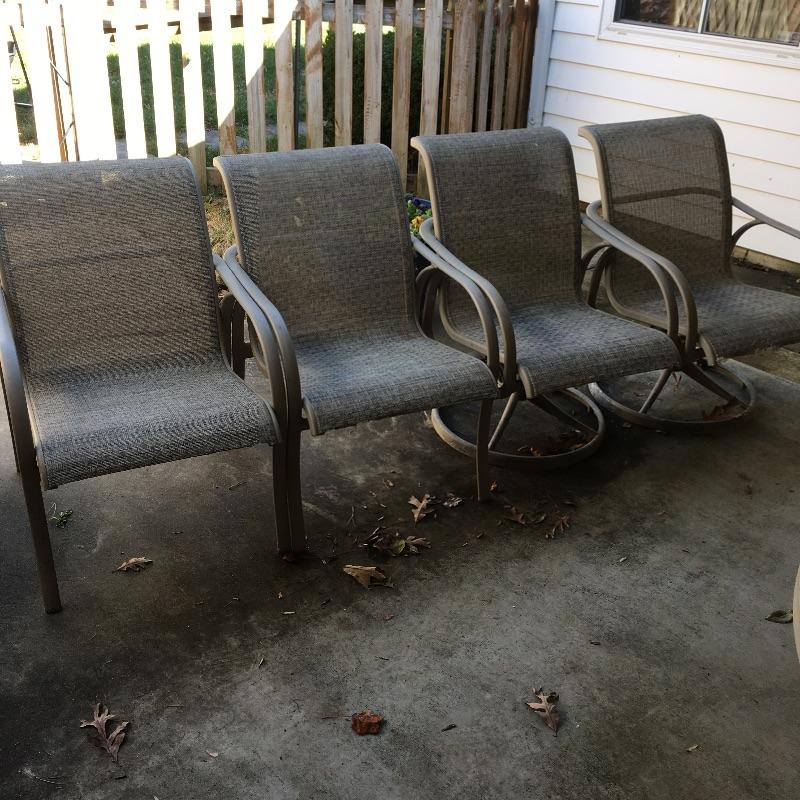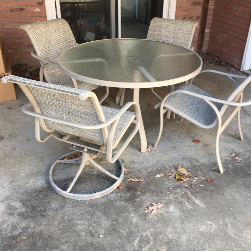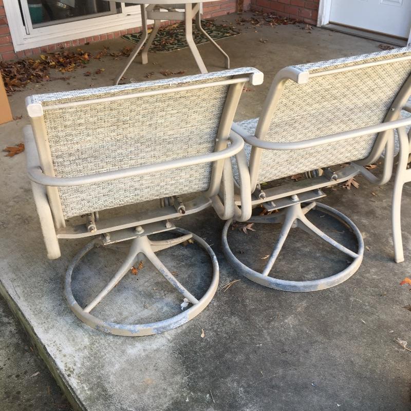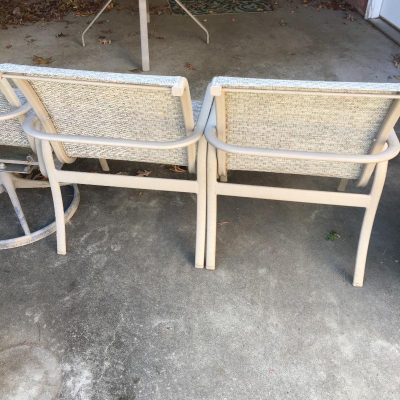 Patio table with four chairs including two that swivel and rock. One chair has some fraying at front and paint is a little rough in places, see pictures. Table measures 48”D x 27” tall.