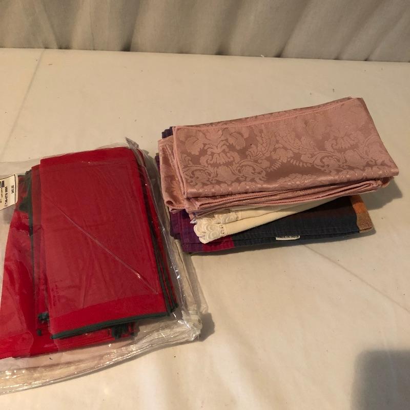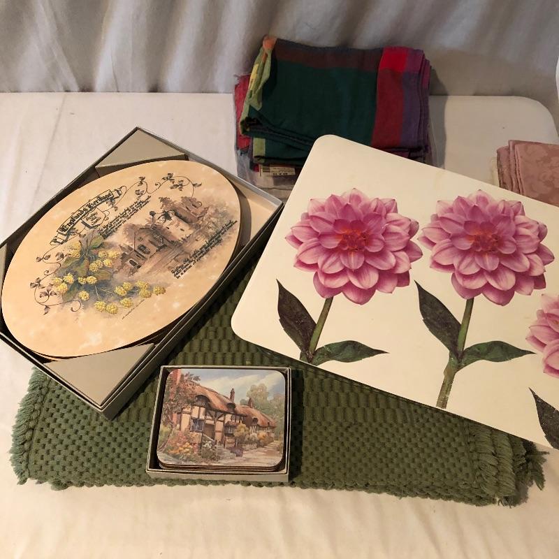 Multiple placemat sets here that includes some striking pink flower mats, light green fabric mats and Kelsey English Heritage mats as well as the same brand in coasters also included is a variety of napkins.