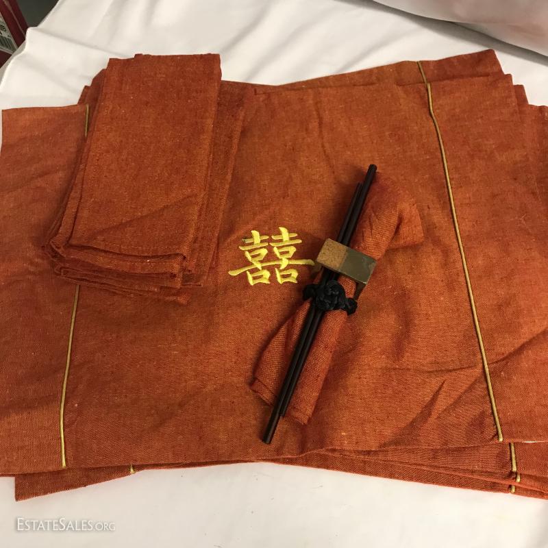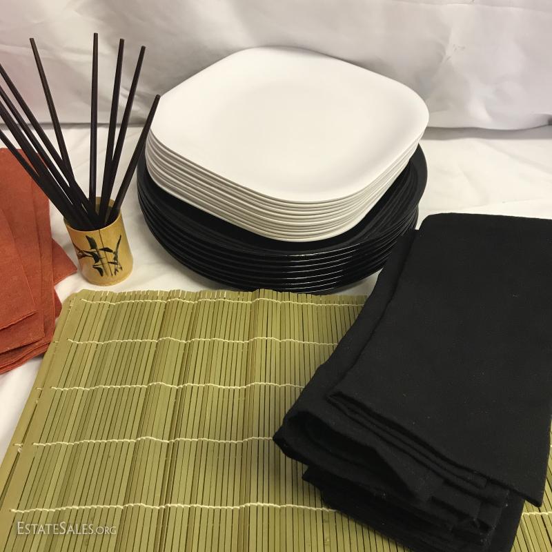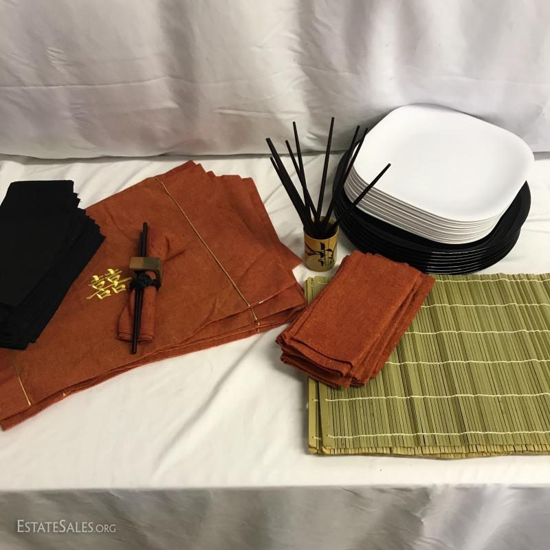 Eight charger plates. Twelve square plates. Napkin sets. Placemat sets (one set is bamboo). Six sets of chopsticks and holder.