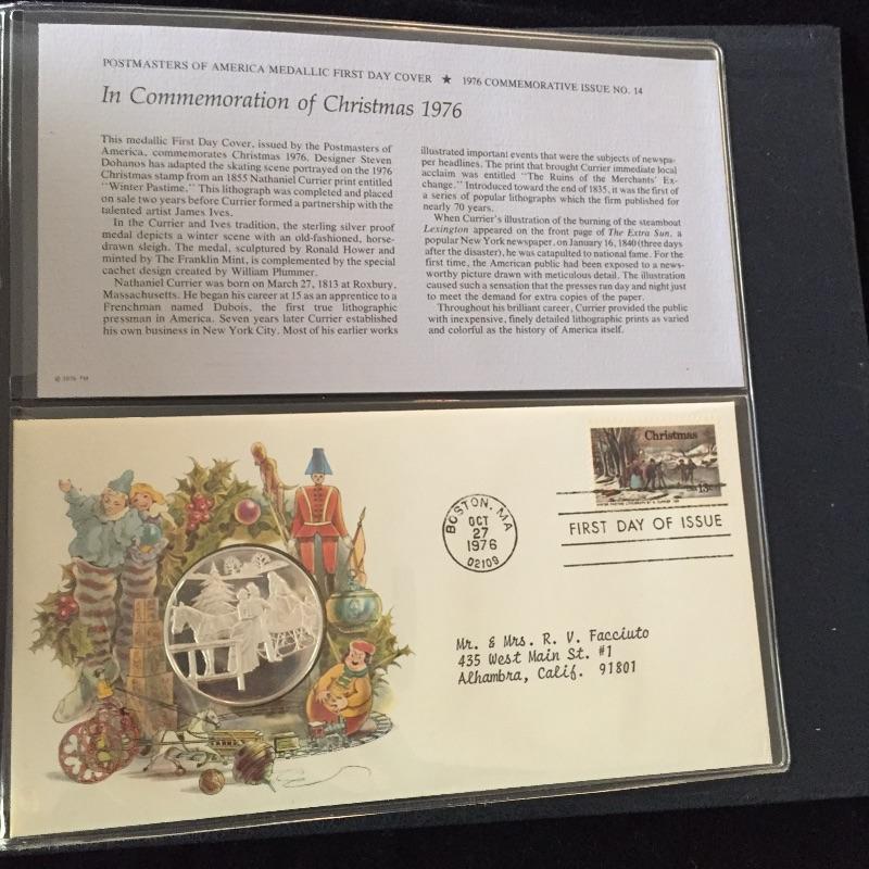This lot contains 1975 20 pages (1 -20 ) and 1976 (1 -14 ) and 1977 ( 1 - 23 )each containing a different philatelic first day of issue stamp on original envelopes addressed to the original owner (unused) with information page as well as a limited edition .925 sterling silver proof coin.