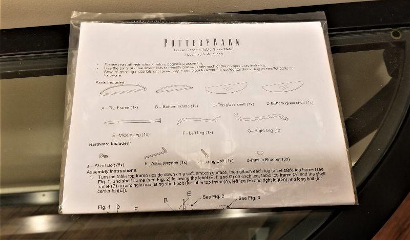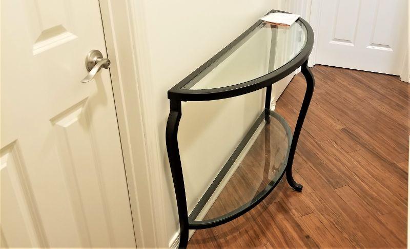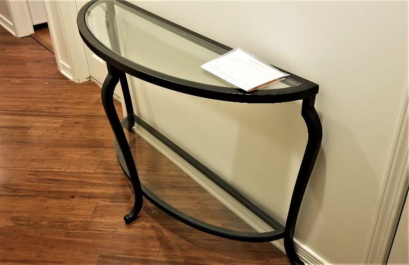 Nice glass and metal demi lune side table from Pottery Barn. Book/instructions come with it. 4 feet wide, 16" deep, 30" tall. Excellent condition. Top and bottom shelving.