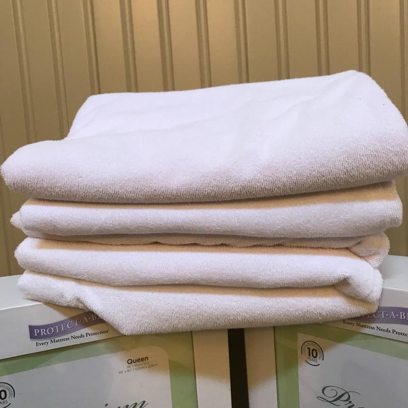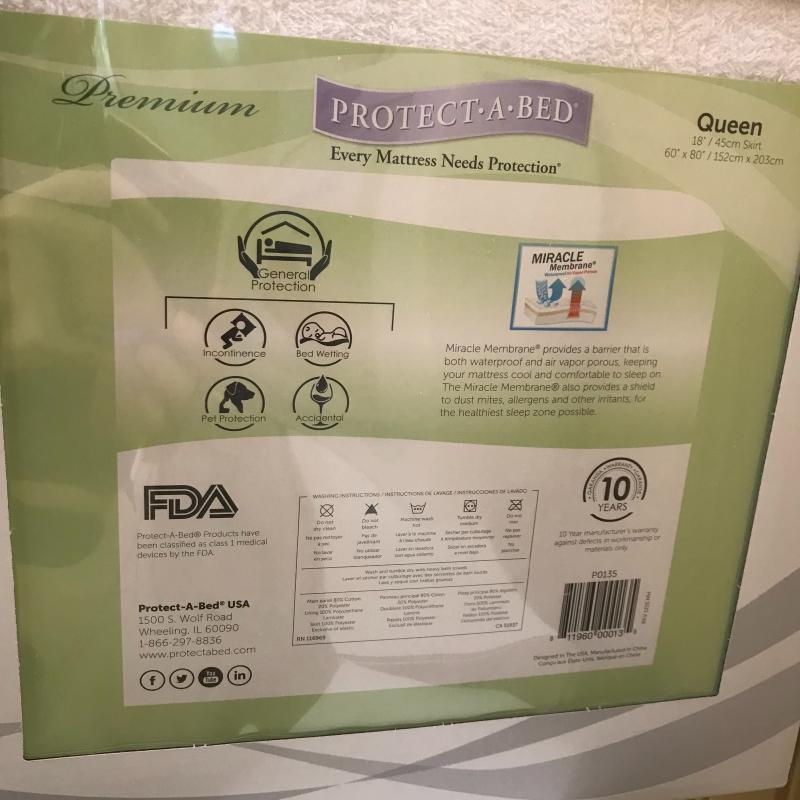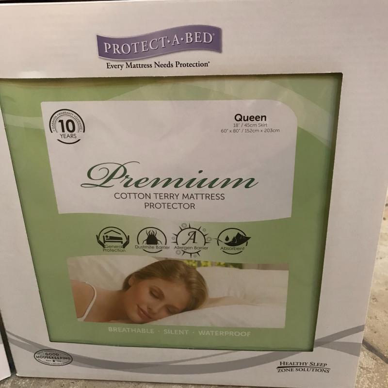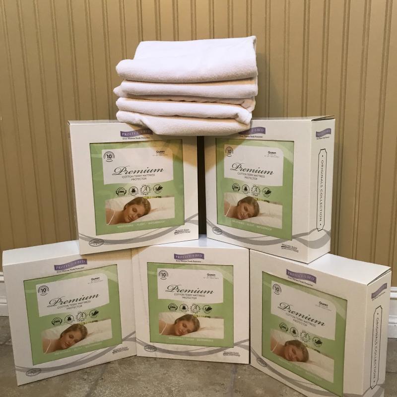 Five new-in-box Queen Protect“¢A“¢Bed matress protectors. Box boasts 10 year warranty, waterproof, allergen barrier and more! See photos. Lot also includes five Sureguard pillow cases. Small stain found on one case, and a couple have a pink hue. All pillowcases appear to be lightly used. No shipping.