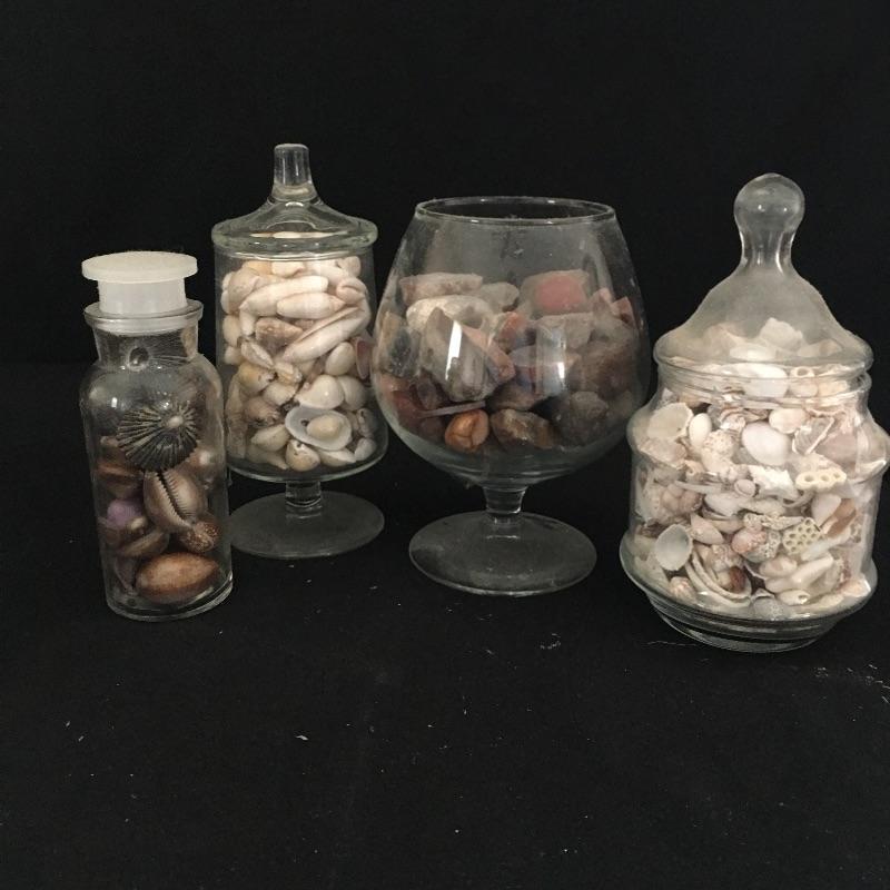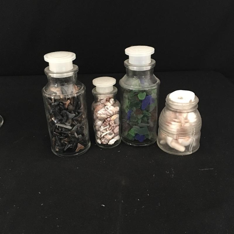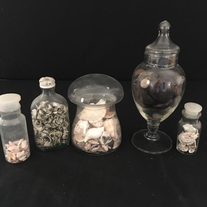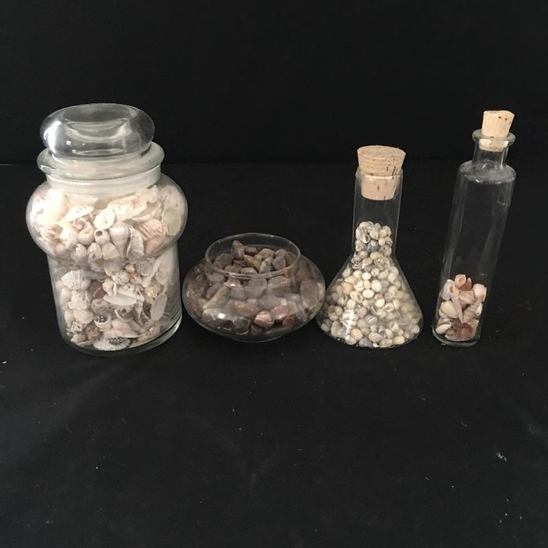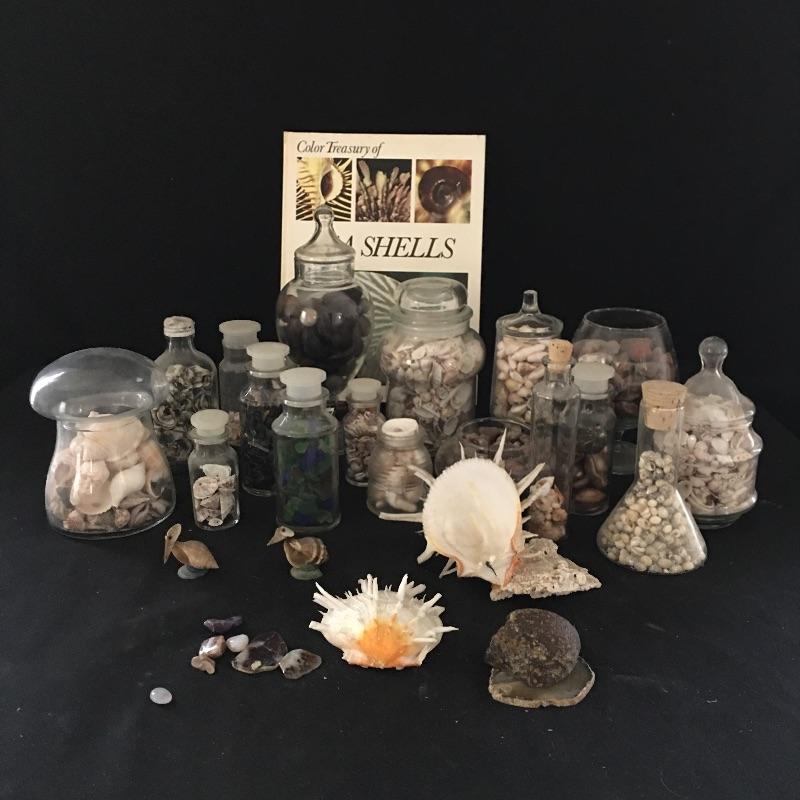 As close to the beach as you can get these days! Lot includes bag of loose sea shells, 16 bottles and jars with a assortment of shells inside, book on sea shells and some larger loose shells. Bottles are jars are a fun variety with large and small apothecary styles. A great way to relax and imagine you are at the sea with this soothing collection. Tallest jar measures 4”D x 10.25”.