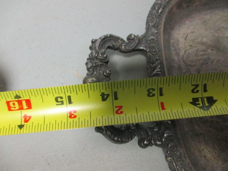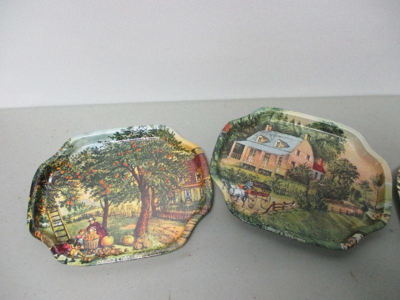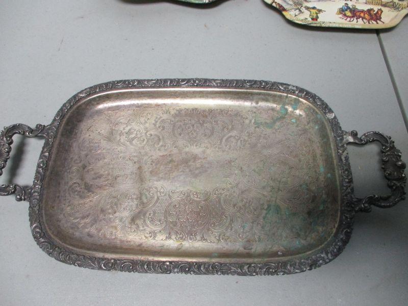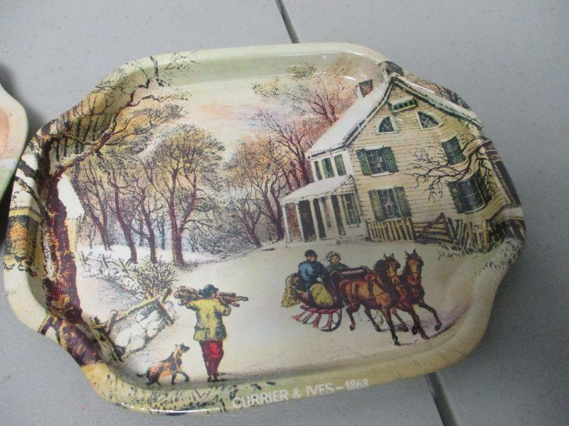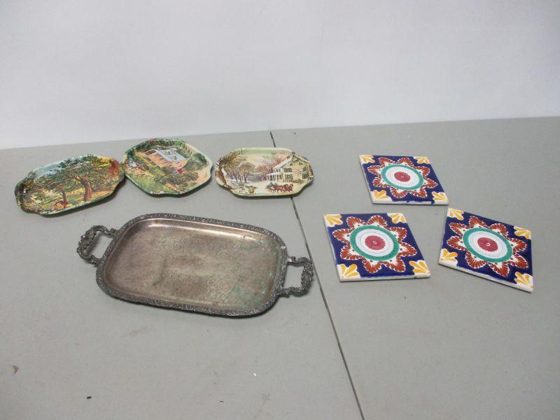 Lot 68 - Currier & Ives Hand Trays, Tile Trivets, and Silver Plate Serving Tray