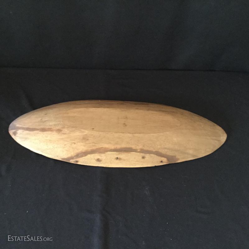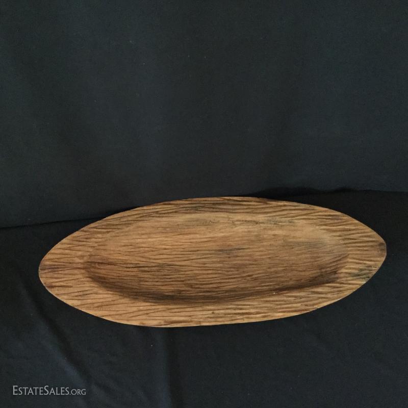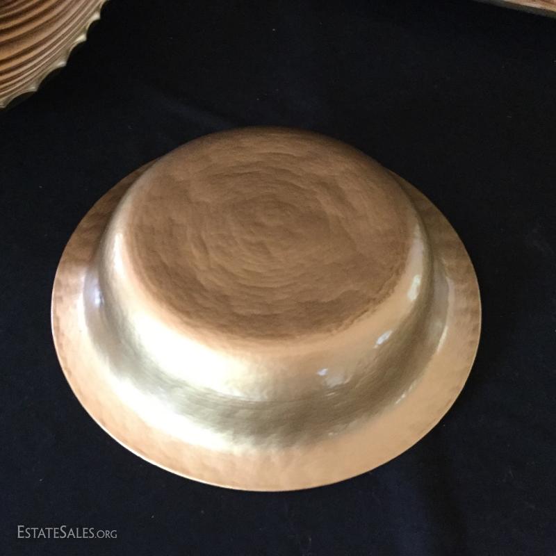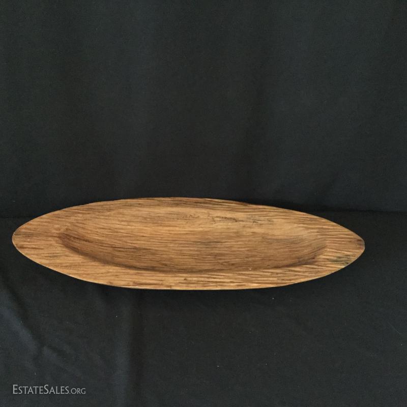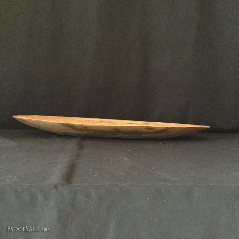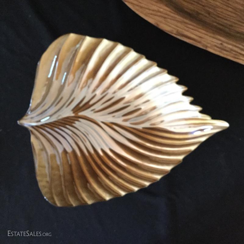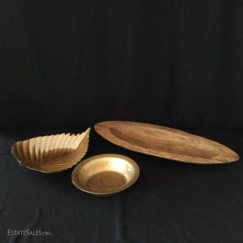 Three decorative bowls. Two gold-colored bowls and one long wooden bowl (27.5" l x 11"w).