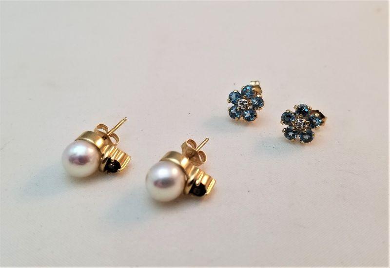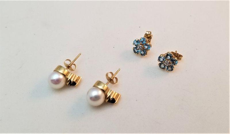 Lot #68  Two Pair of 14kt Gold earrings - pearls/blue topaz