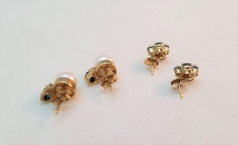 You get both pairs - nice 14kt gold pierced earrings set with cultured pearl and tiny sapphire - another pair in 14kt gold (floral design) with blue topaz and tiny diamond. Good, gently used condition.