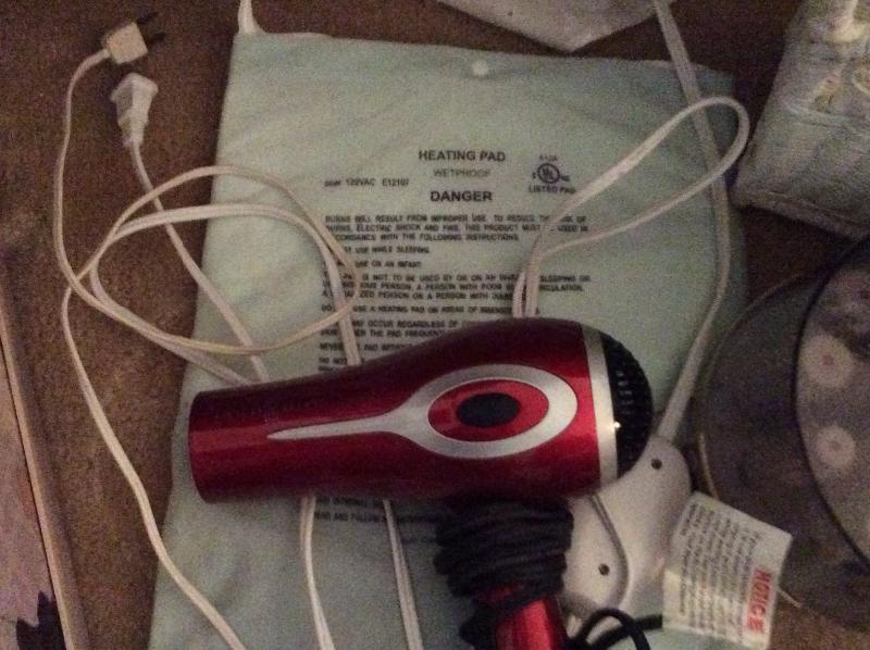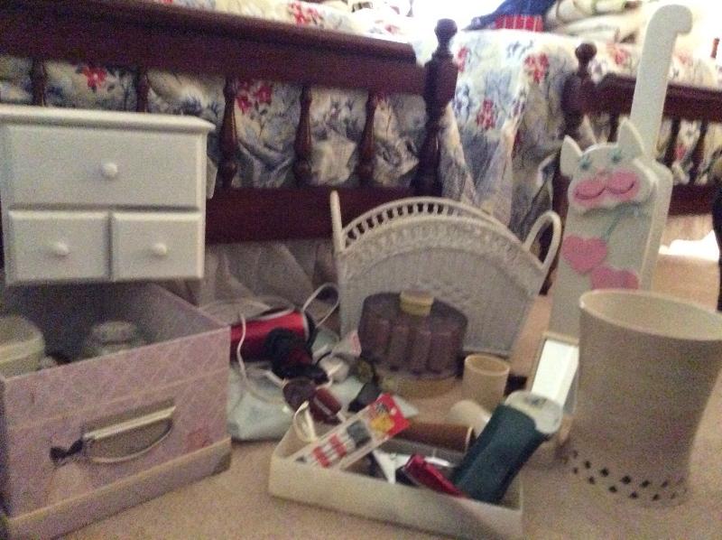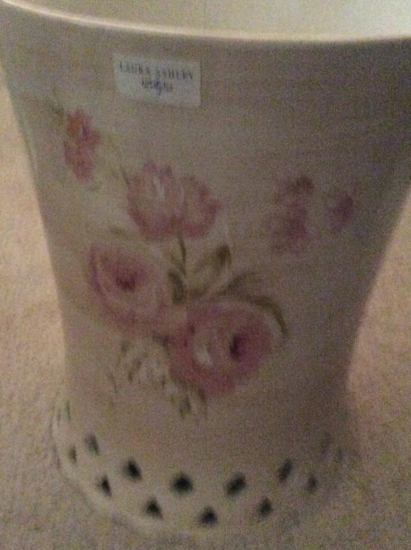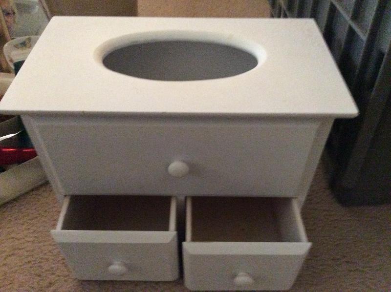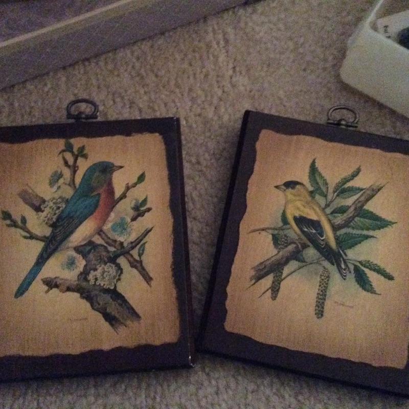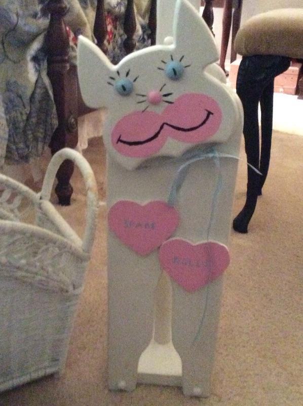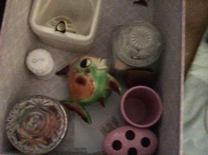Bathroom storage items, wooden cat tissue paper holder, hair dryer and heating pad, untested, ceramic waste container, a vintage, ceramic fish, wooden plaques painted with birds, and more. Bring box for packing.