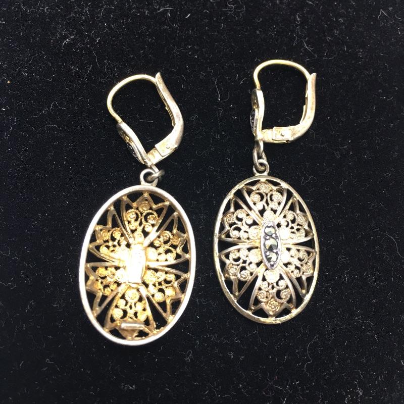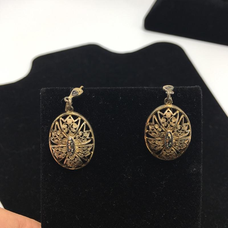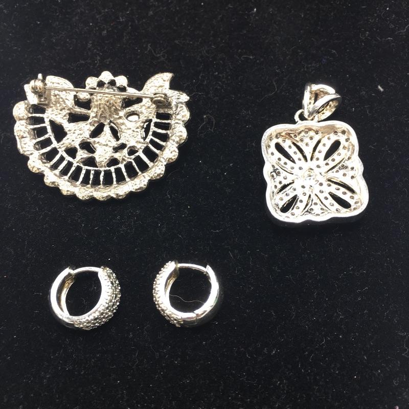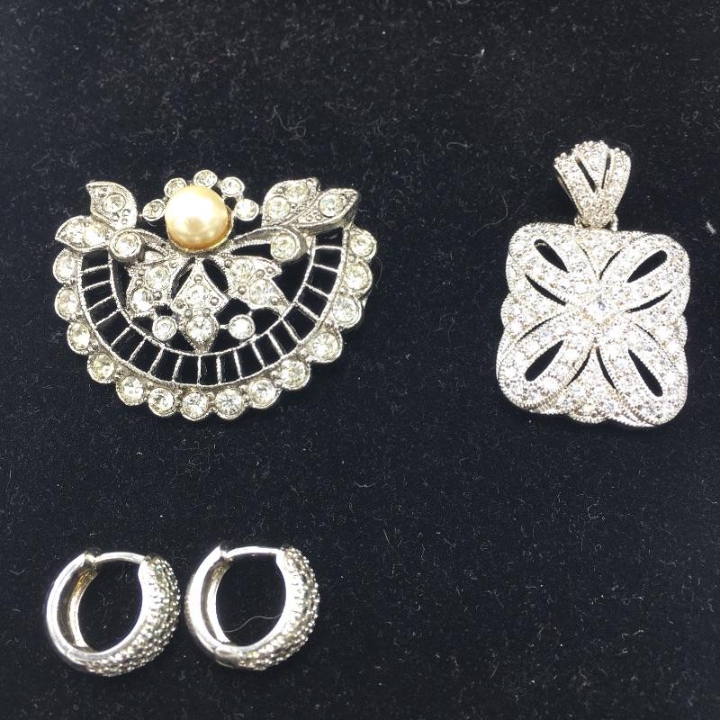 Array of vintage fashion jewelry includes earrings, bracelet, broach and pendant.