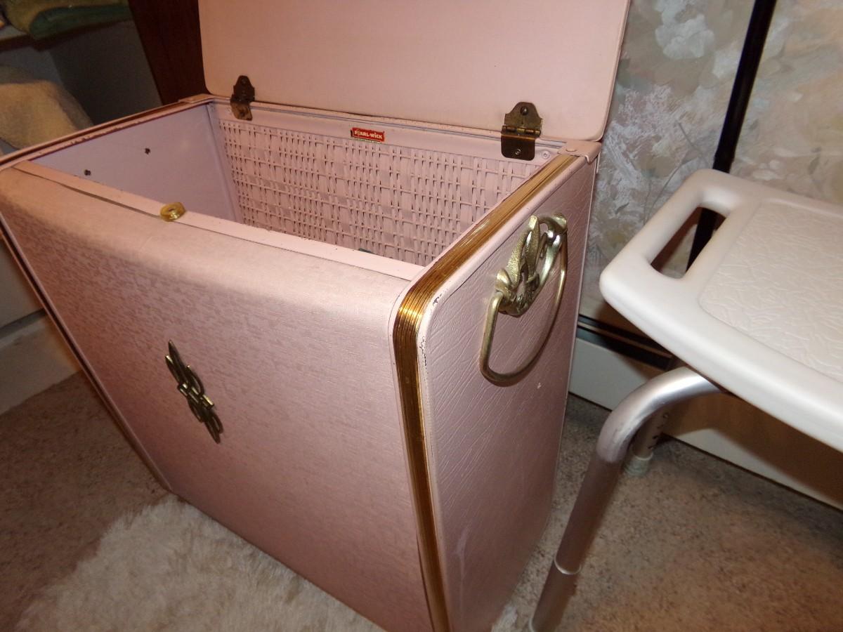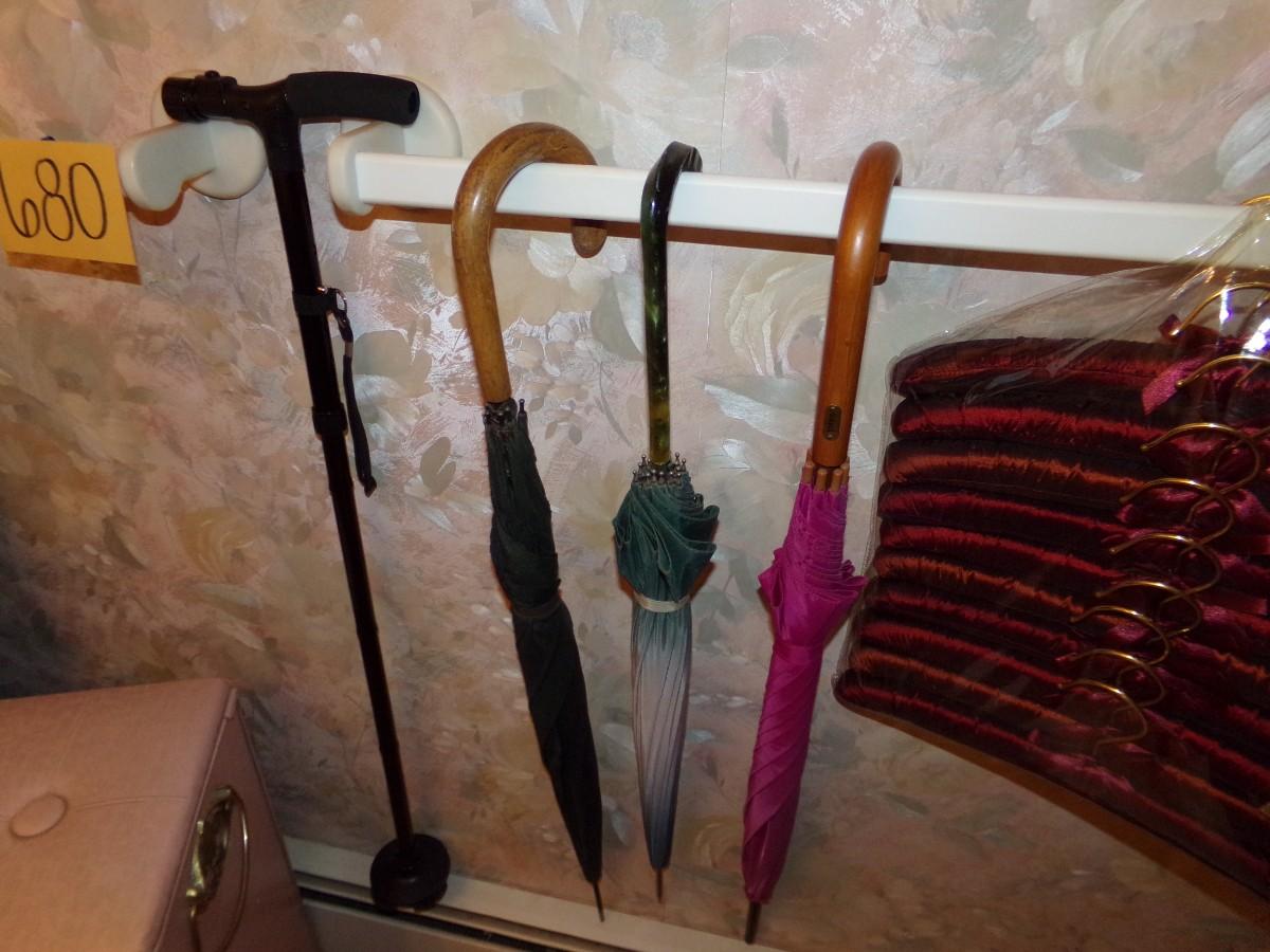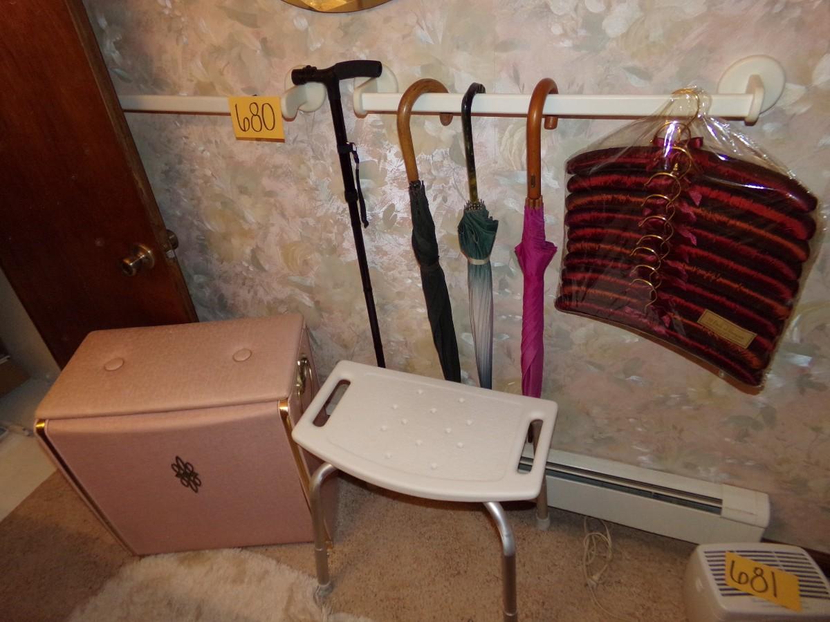 CANE, UMBRELLAS, SHOWER CHAIR, VINTAGE HAMPER, SILK CLOTHES HANGERS NEW IN BAG