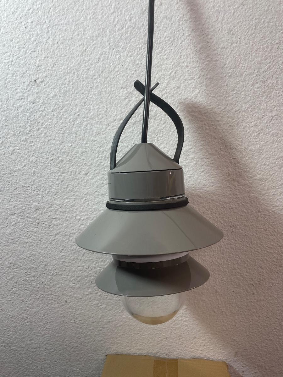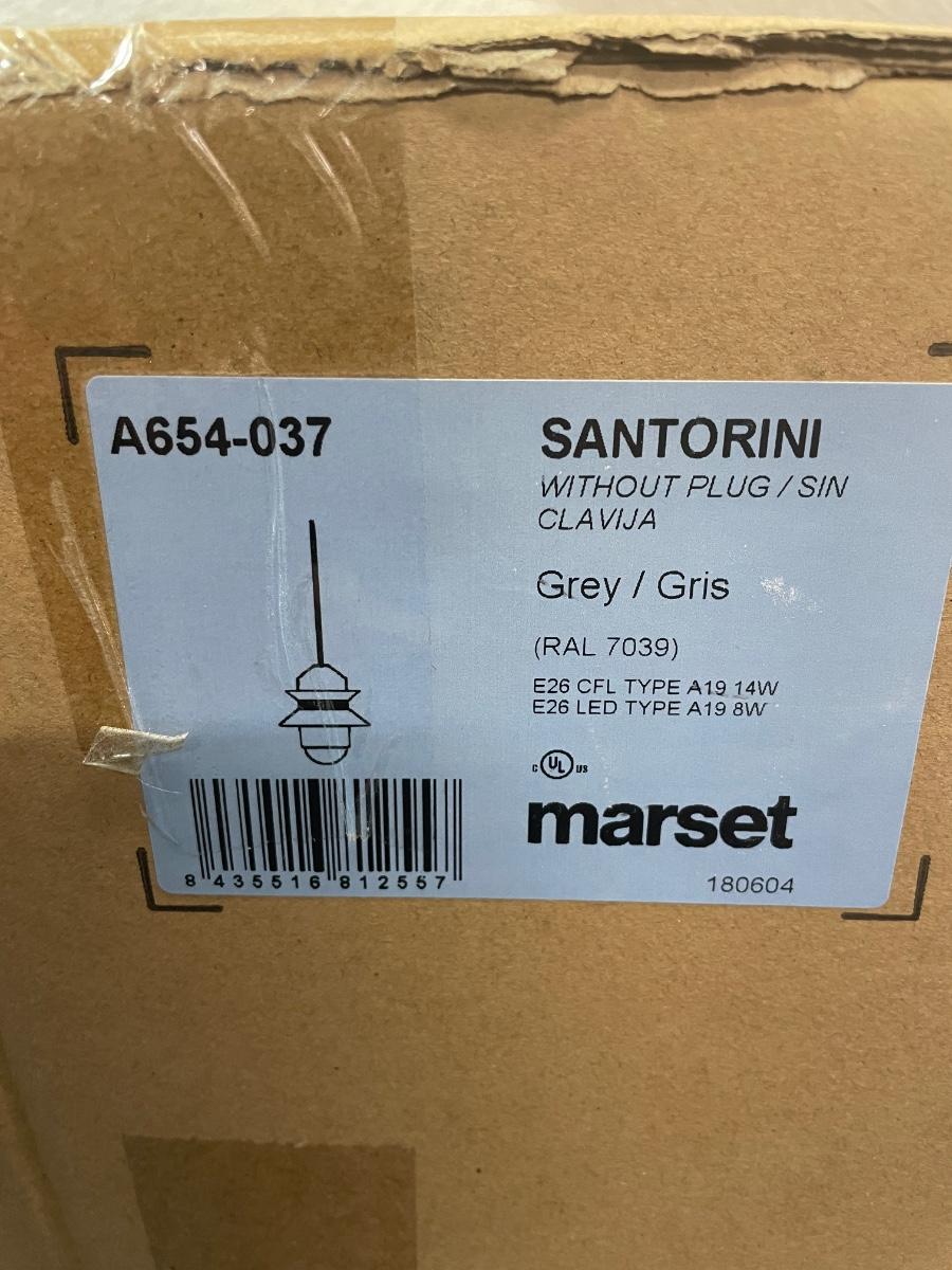 MARSET BRAND SANTORINI OUTDOOR LIGHT (GRAY COLOR). THE LIGHT OUT OF THE BOX IS SHOWN AS A SAMPLE OF THE LIGHT STYLE. THE ACTUAL COLOR OF THE LAMP IS ON A CLOSE PIC OF THE TAG ON BOX