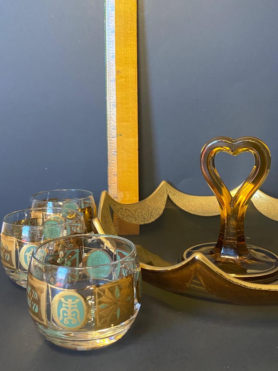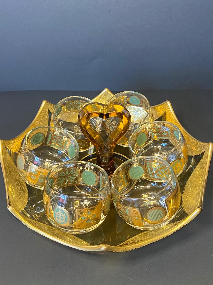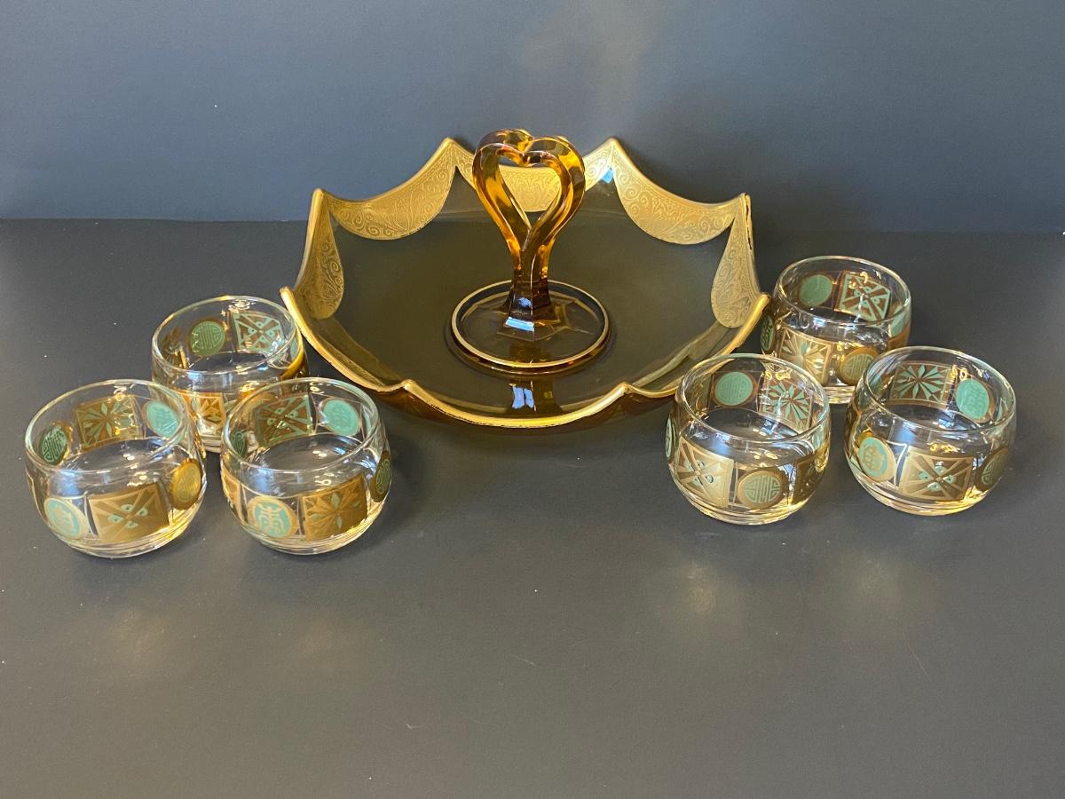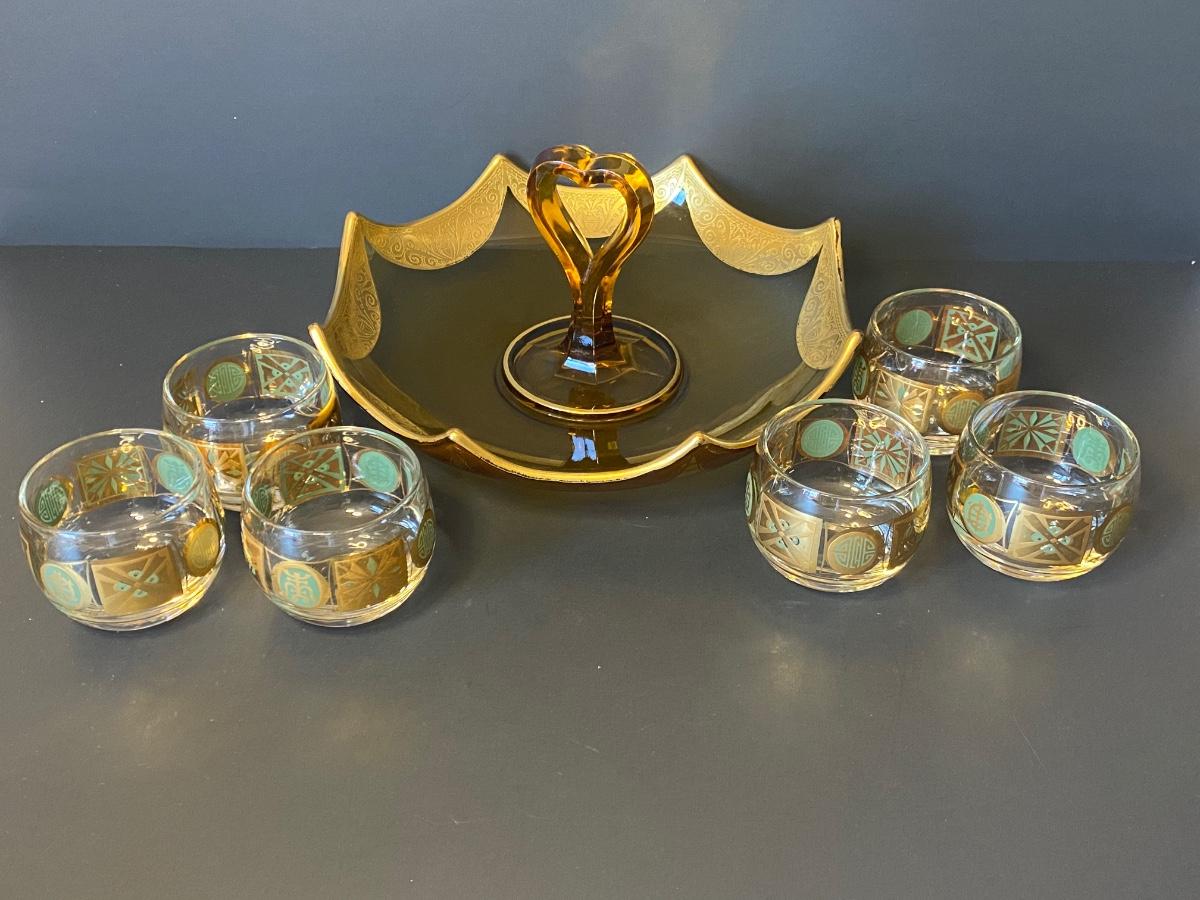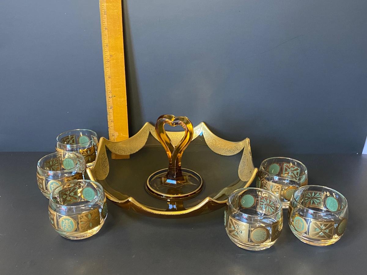 Incredible gold detail on this glass set. Six gold and green glasses and a gold trimmed carrying/serving dish. Please see all pictures as they are the best representation of the items. The pictures show condition, measurements if taken, and what is included in the lot. Due to the large amount that we photograph and the time frame, we are not always able to take measurements. All items unless noted, are pre-owned and have been used. If you purchased furniture, you must bring help. We do not allow one person to carry large furniture out on their own. Bring help, tools and a truck for the safety of our client’s homes, and your personal safety. Any damages that result to the property including walls, and floors due to moving of the furniture will be charged to the buyer. Company policy. Thank you.