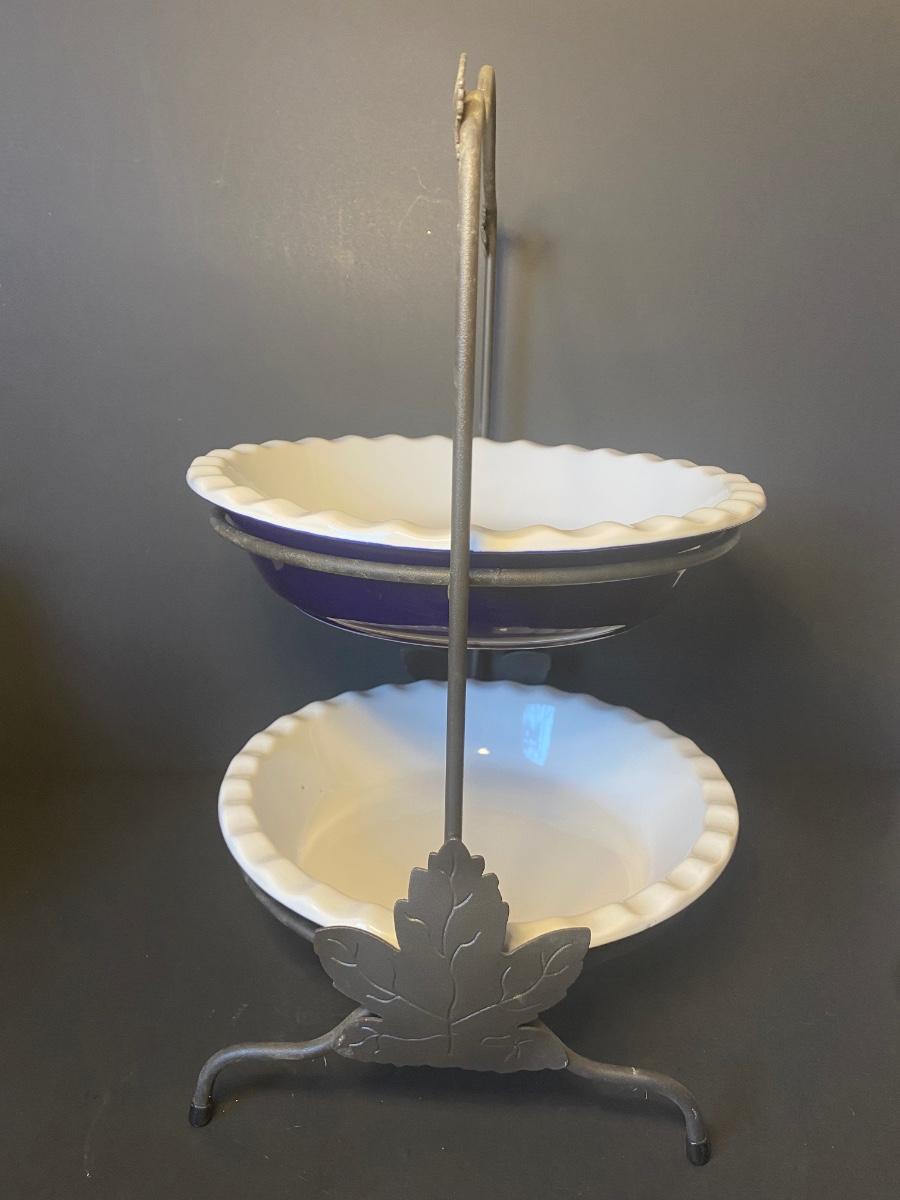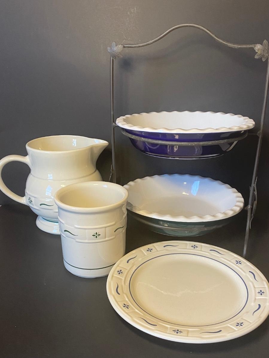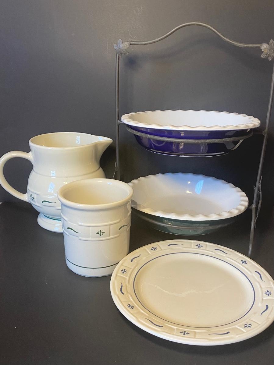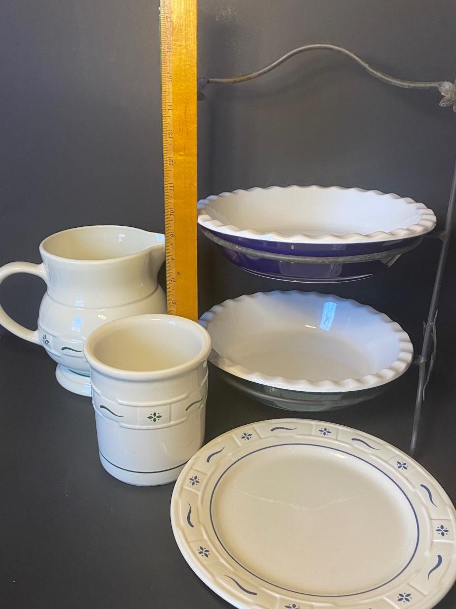 Three pieces of longaberger pottery. Longaberger metal pie stand. Two pie plates fit in pie stand. Unsure if pie plates are made by Longaberger as they are not marked. Please see all pictures as they are the best representation of the items. The pictures show condition, measurements if taken, and what is included in the lot. Due to the large amount that we photograph and the time frame, we are not always able to take measurements. All items unless noted, are pre-owned and have been used. If you purchased furniture, you must bring help. We do not allow one person to carry large furniture out on their own. Bring help, tools and a truck for the safety of our client’s homes, and your personal safety. Any damages that result to the property including walls, and floors due to moving of the furniture will be charged to the buyer. Company policy. Thank you.