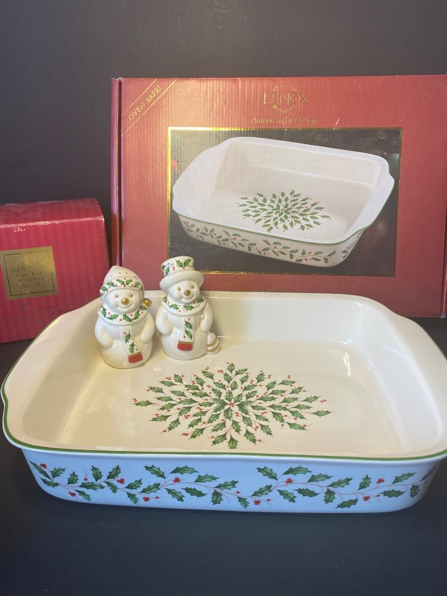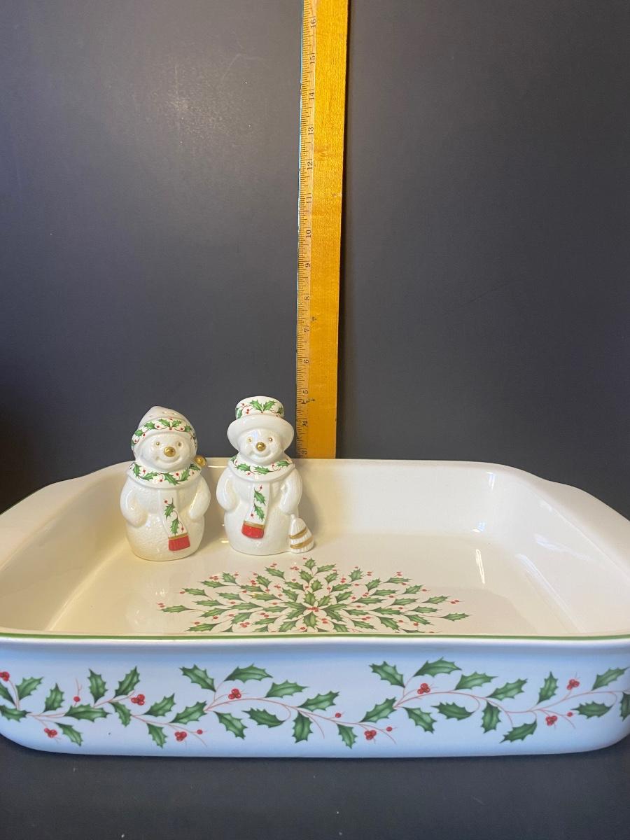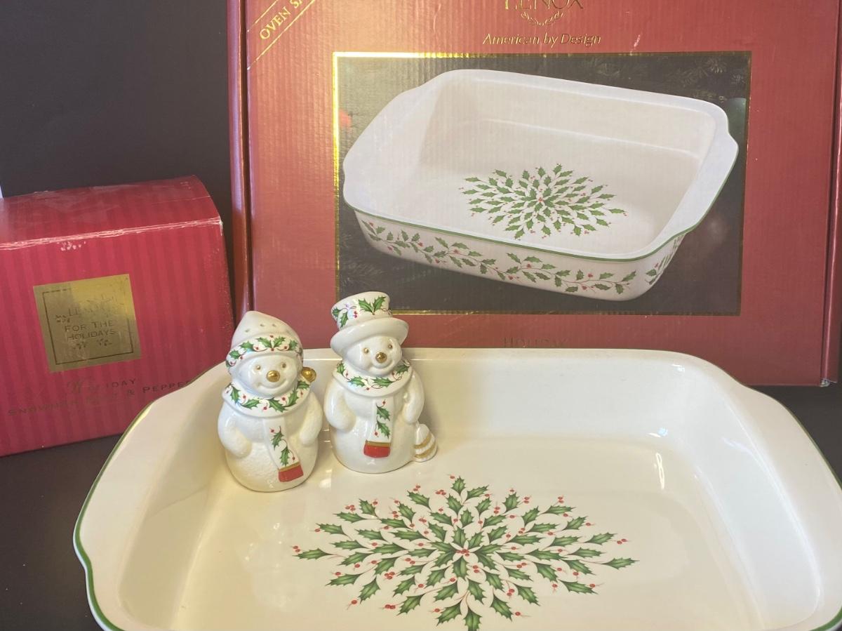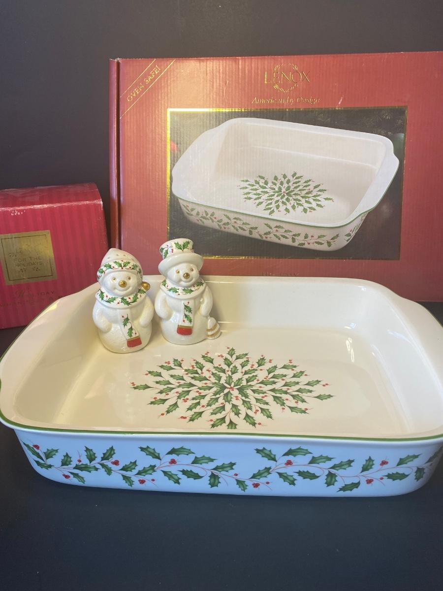 Both Lenox pieces come w original boxes. Rectangular Baker is oven and dishwasher safe. Snowman S&P shakers Are trimmed with holly. Please see all pictures as they are the best representation of the items. The pictures show condition, measurements if taken, and what is included in the lot. Due to the large amount that we photograph and the time frame, we are not always able to take measurements. All items unless noted, are pre-owned and have been used. If you purchased furniture, you must bring help. We do not allow one person to carry large furniture out on their own. Bring help, tools and a truck for the safety of our client’s homes, and your personal safety. Any damages that result to the property including walls, and floors due to moving of the furniture will be charged to the buyer. Company policy. Thank you.