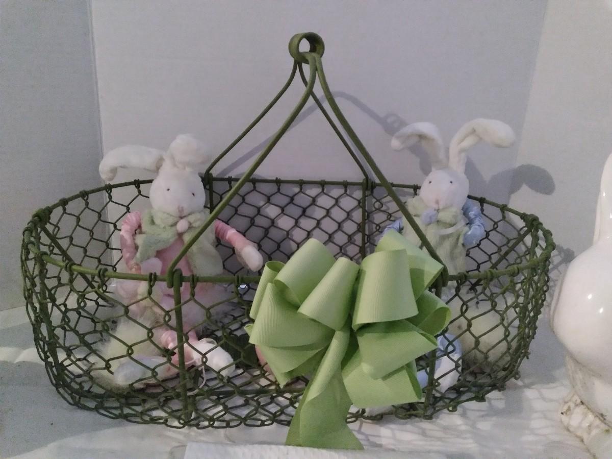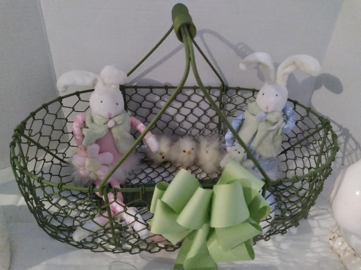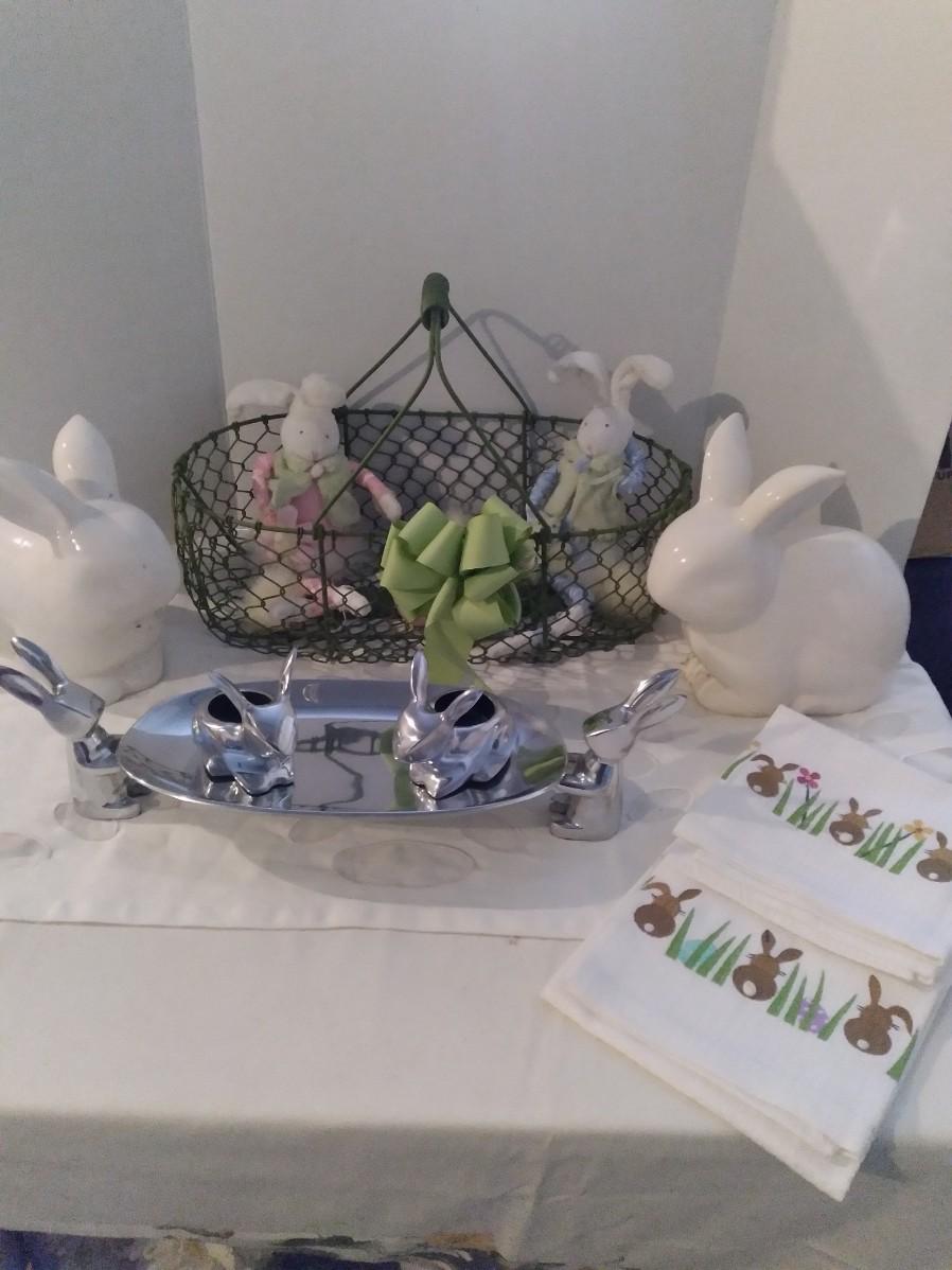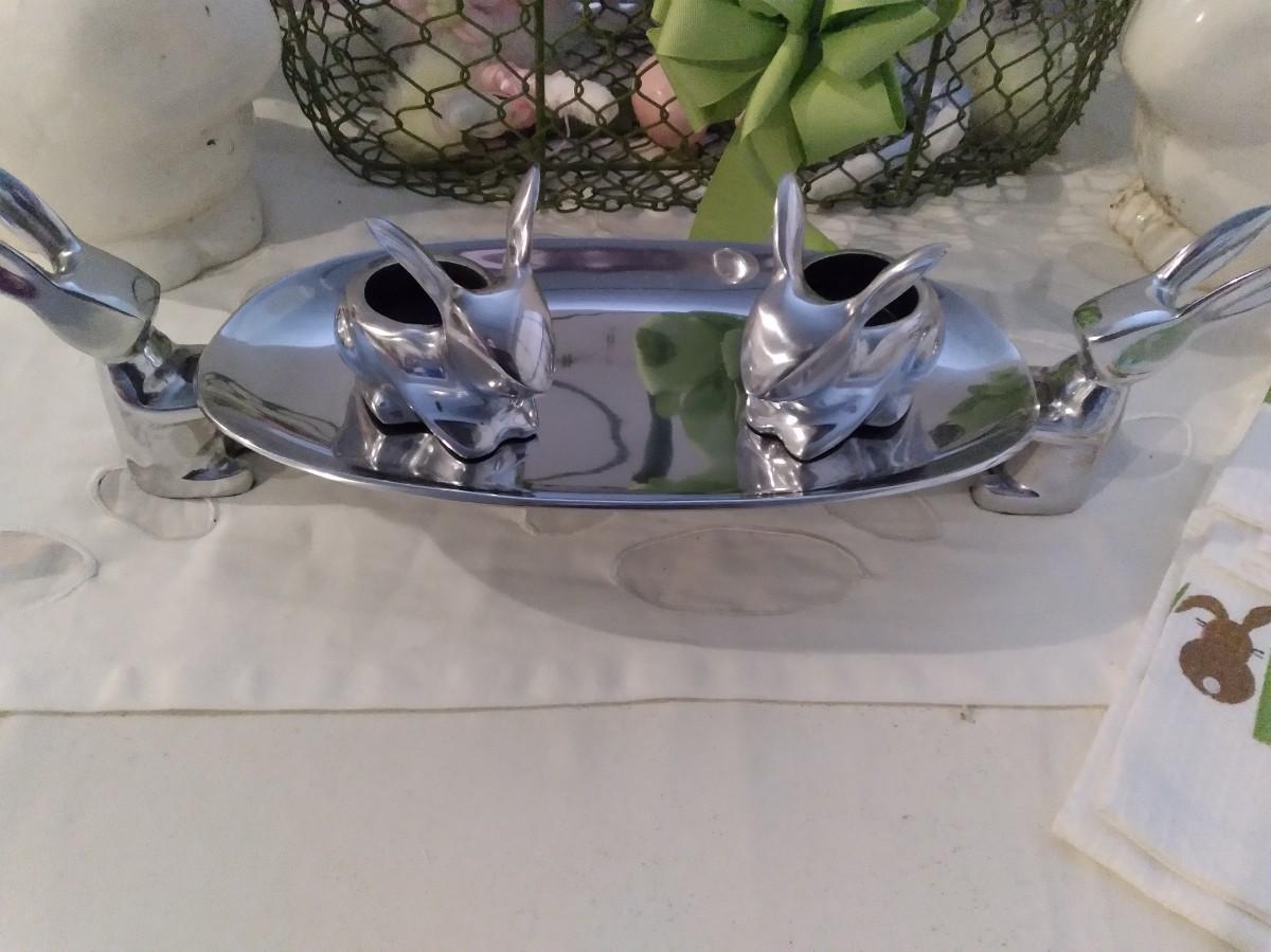 2 CERAMIC RABBITS, ALUMINUM BUNNY PLATTER WITH 2 BUNNY HOLDERS, METAL BASKET WITH MORE BUNNIES AND RABBIT NAPKINS