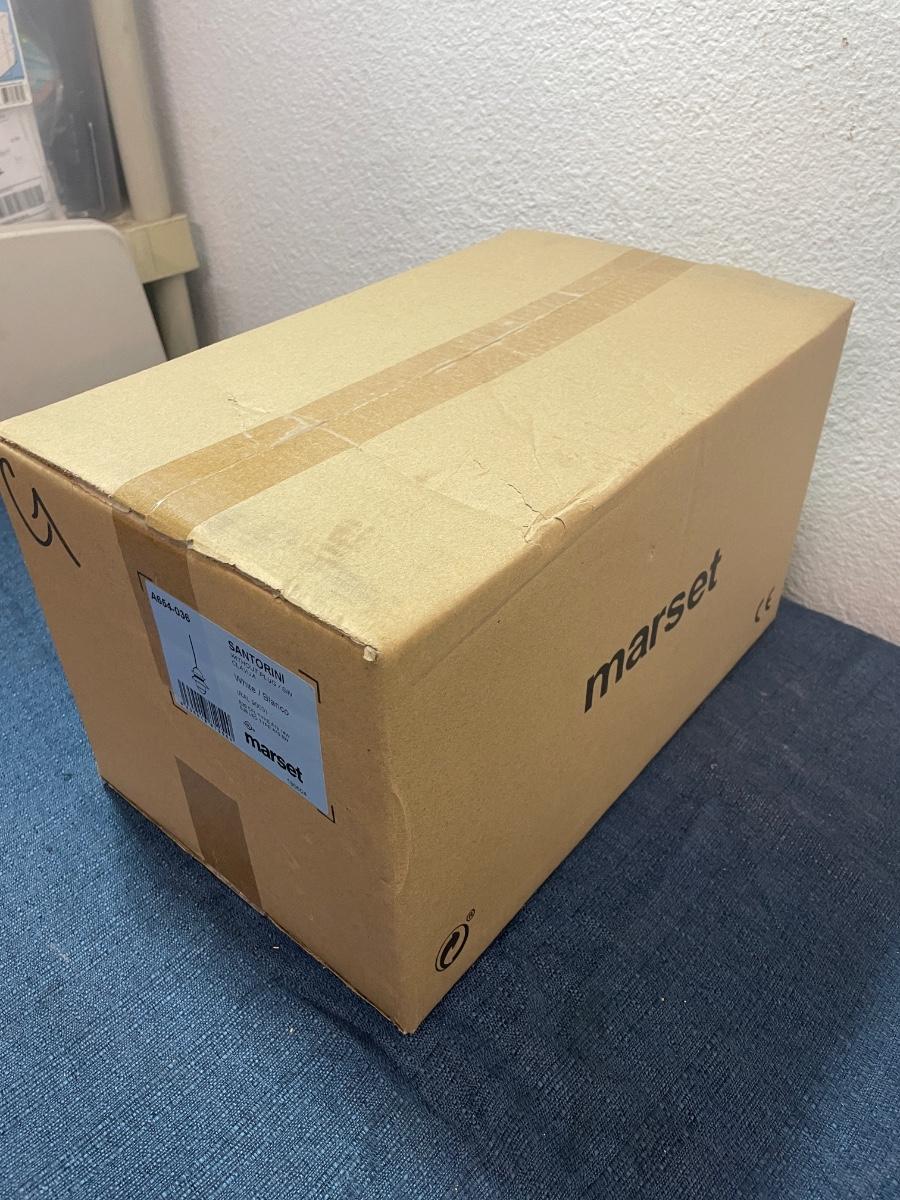 MARSET BRAND SANTORINI OUTDOOR LIGHT (WHITE COLOR). THE LIGHT OUT OF THE BOX IS SHOWN AS A SAMPLE OF THE LIGHT STYLE. THE ACTUAL COLOR OF THE LAMP IS ON A CLOSE PIC OF THE TAG ON BOX