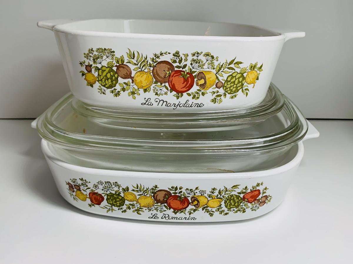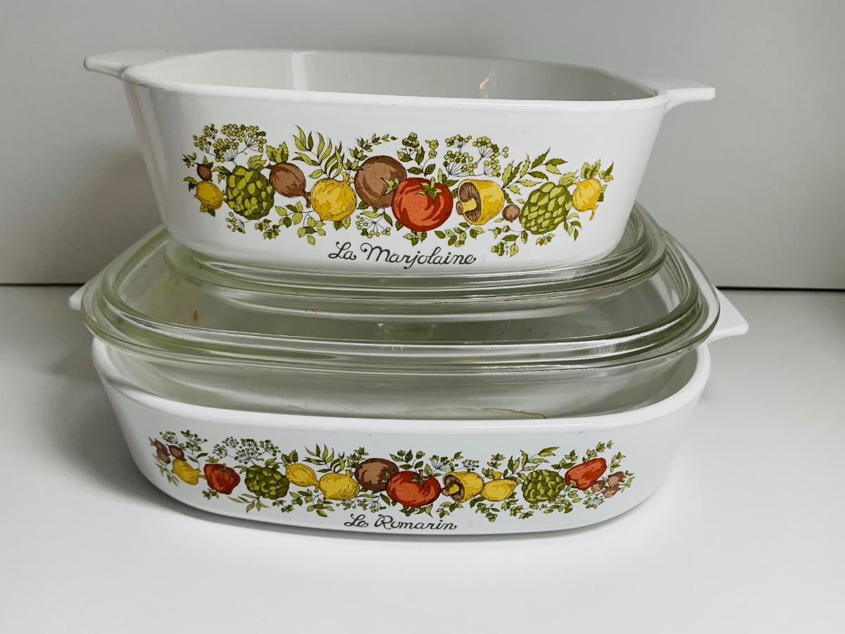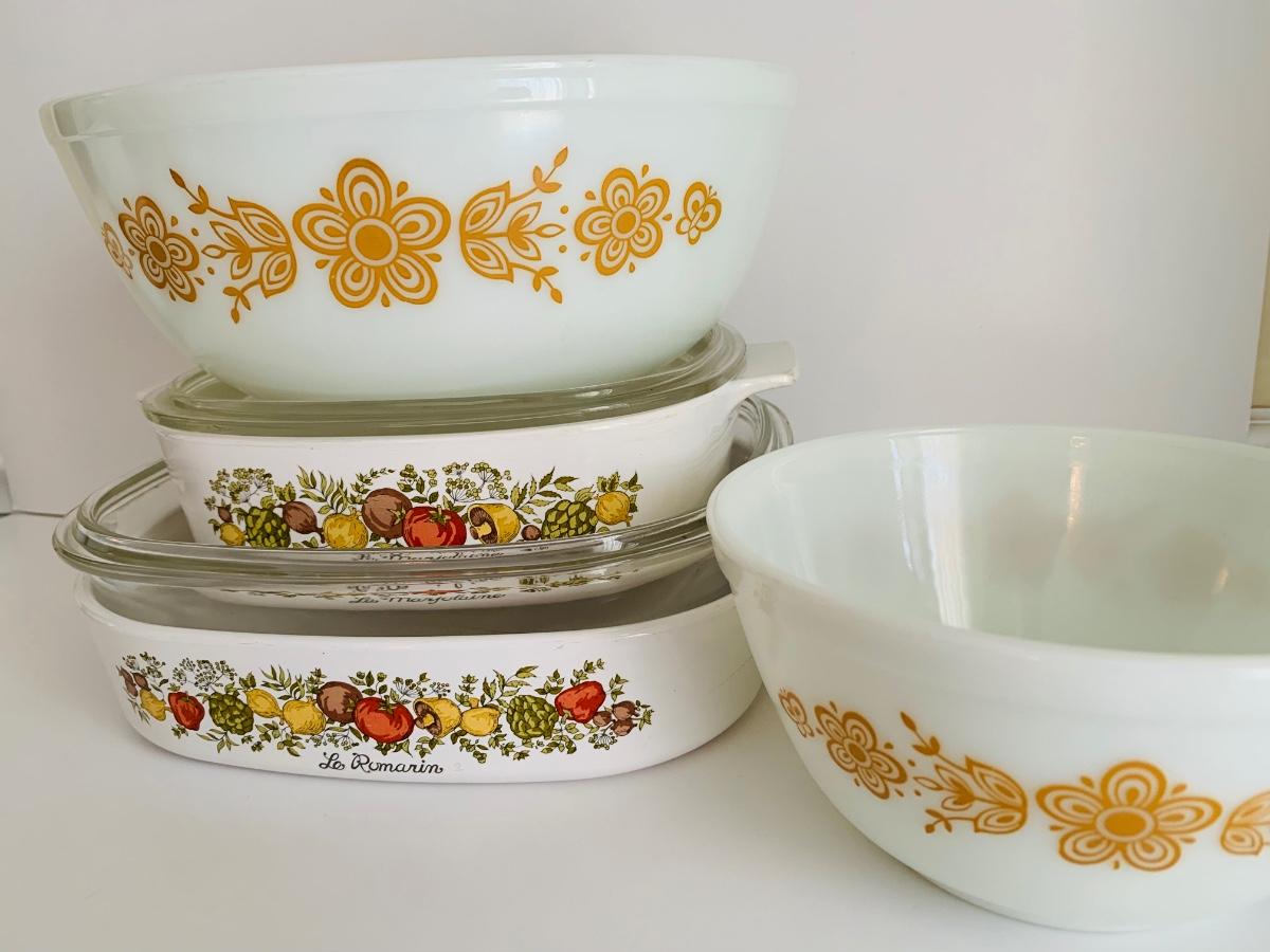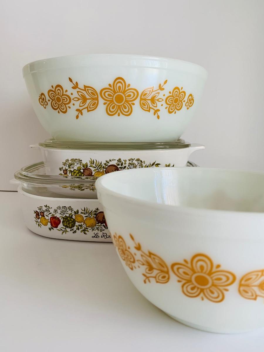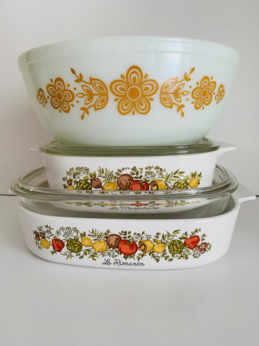 Vintage Corning Ware Spice Of Life La Romarin casserole dishes w/lids along with vintage Pyrex mixing bowls Butterfly Gold.
