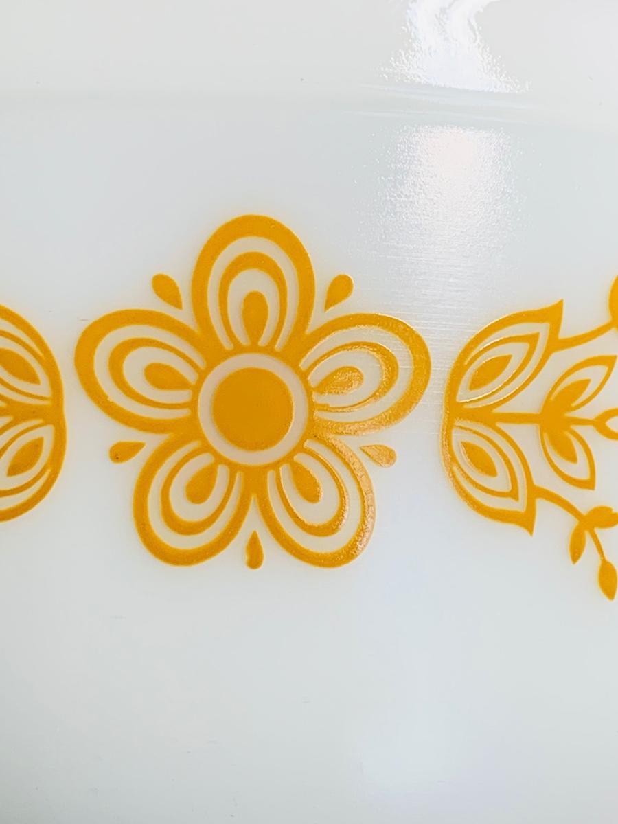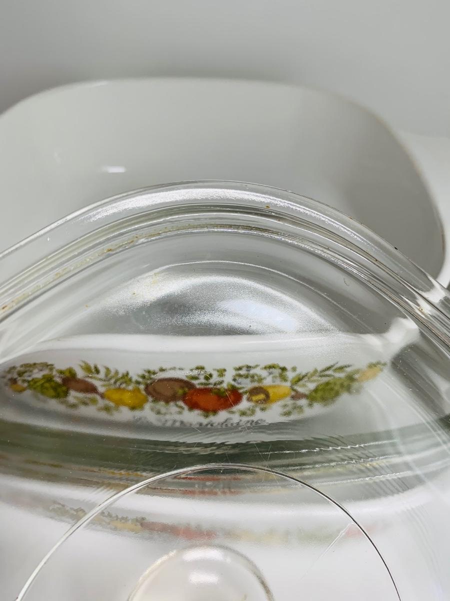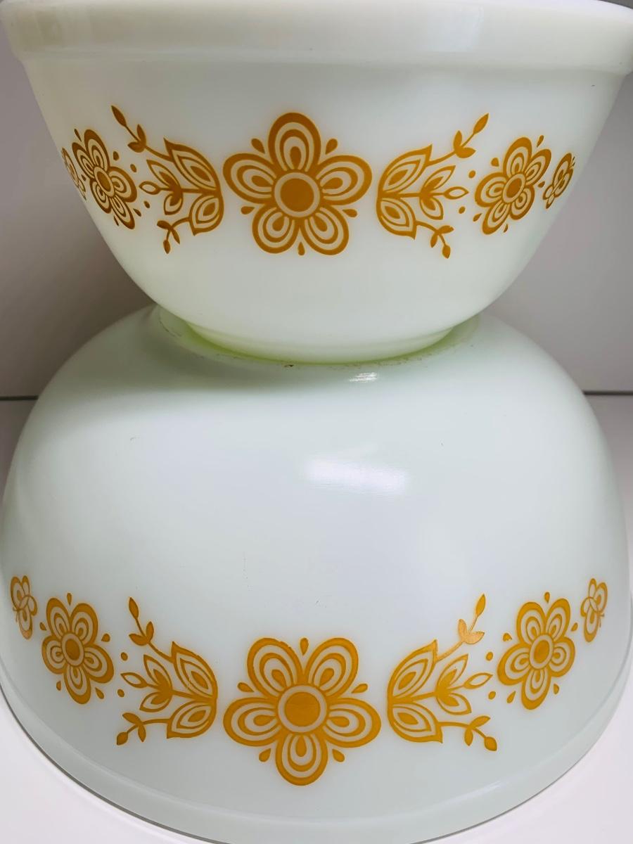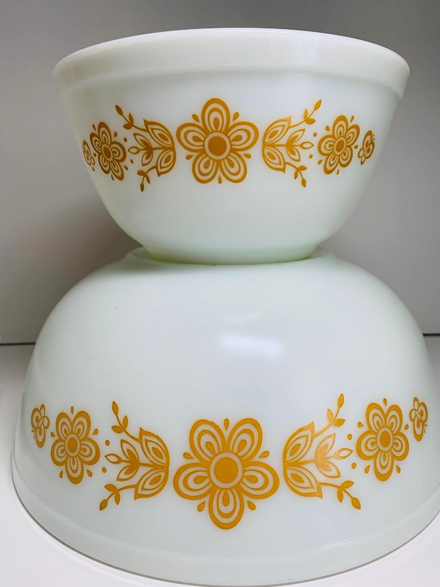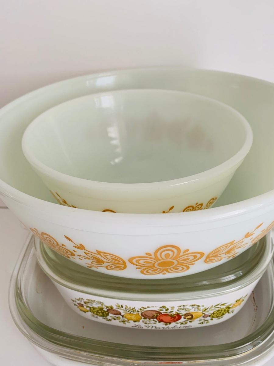 Vintage Corning Ware Spice Of Life La Romarin casserole dishes w/lids along with vintage Pyrex mixing bowls Butterfly Gold.
