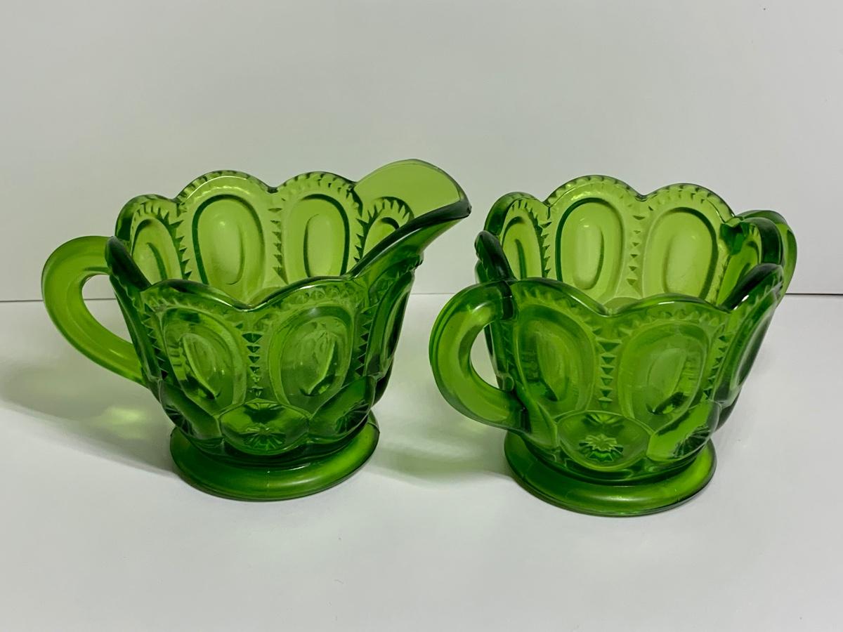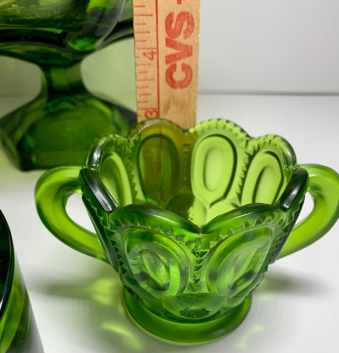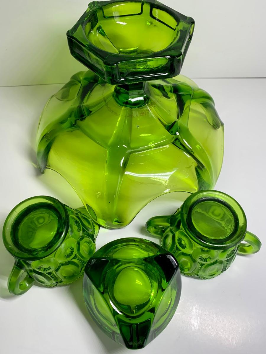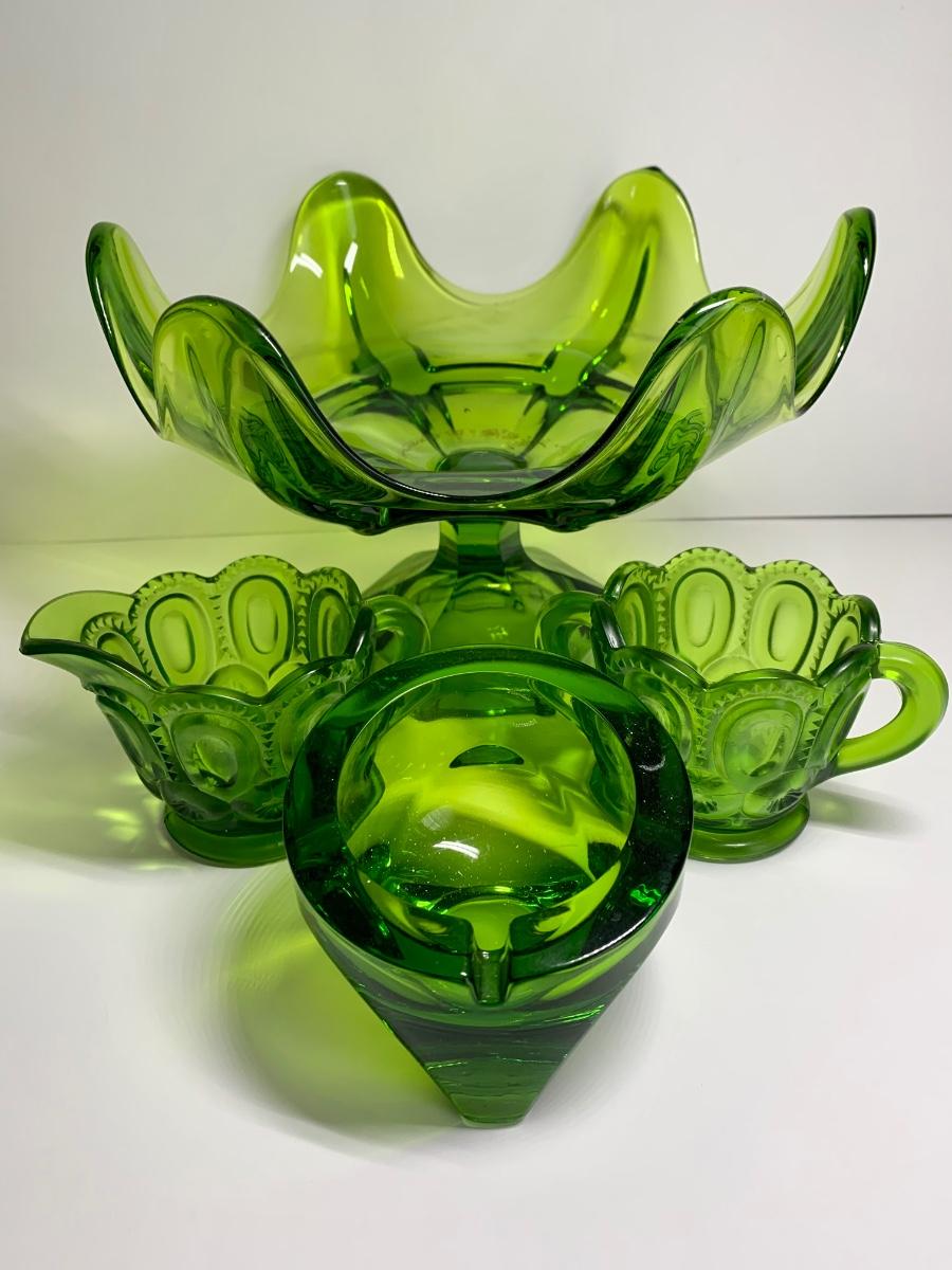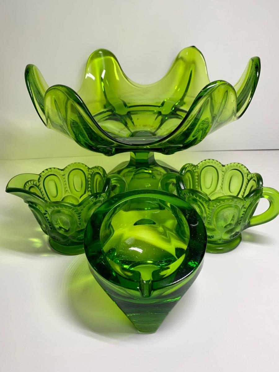 Vintage green glass collection with a footed candy/compote dish, matching creamer & sugar along with a heavy ashtray.