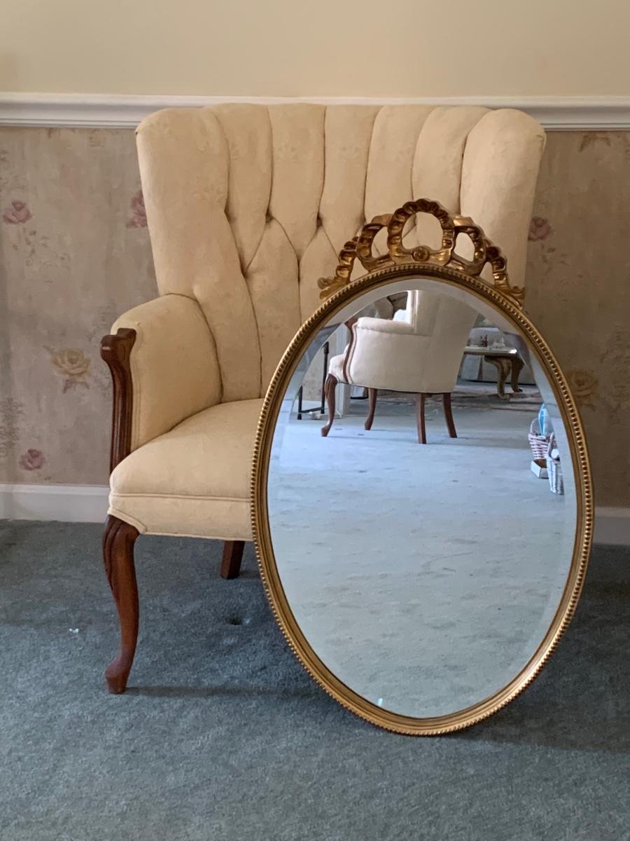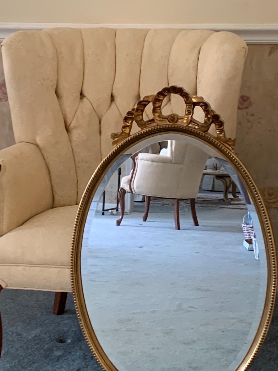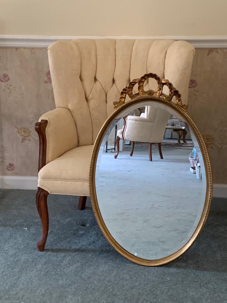 Vintage oval gold wood mirror. Measures 22 x 34. Chair NOT included.