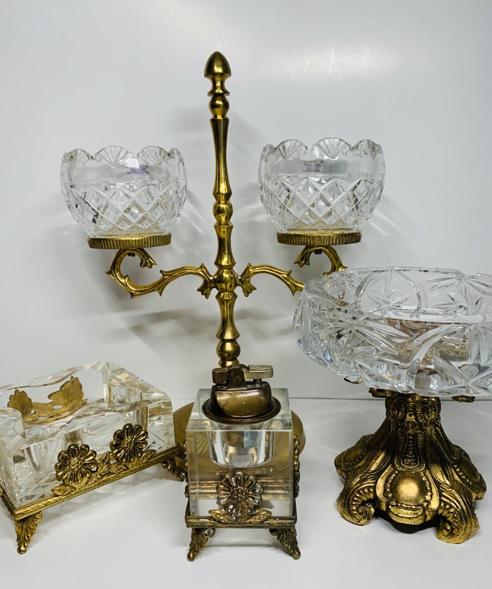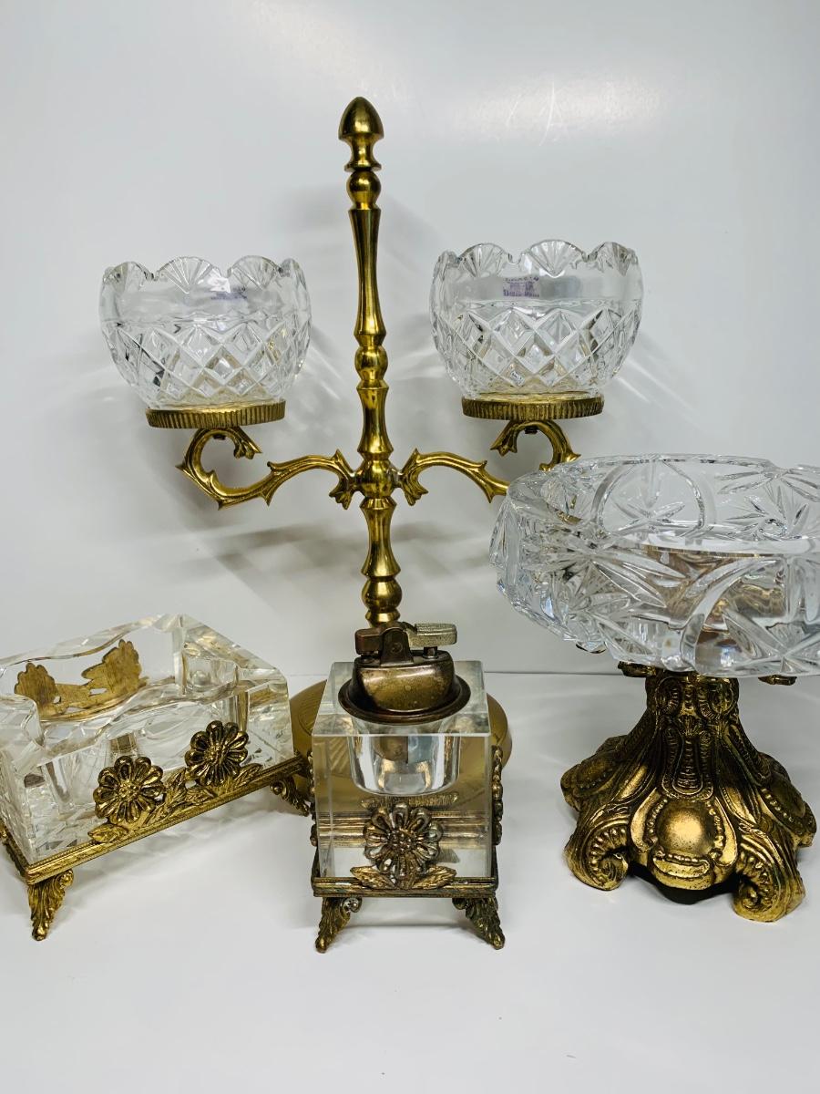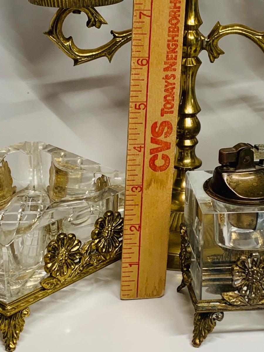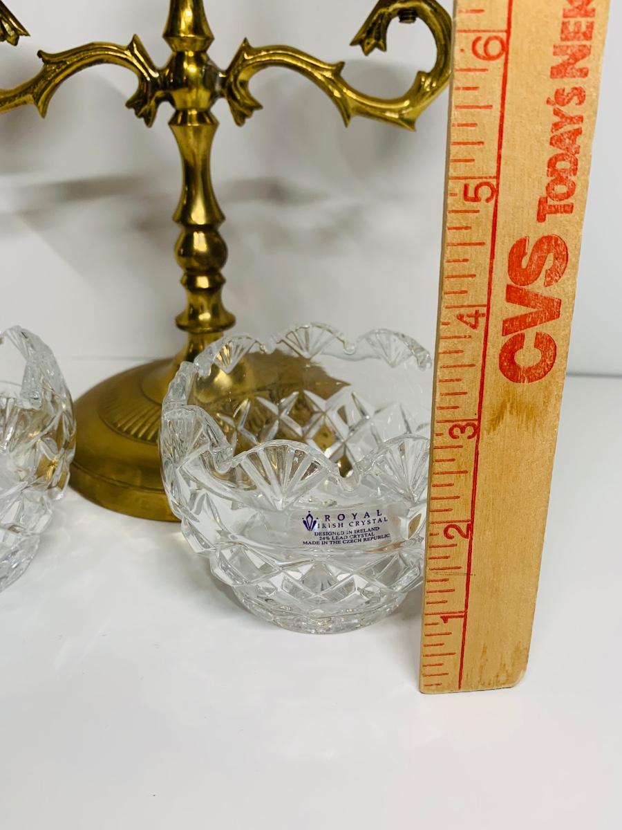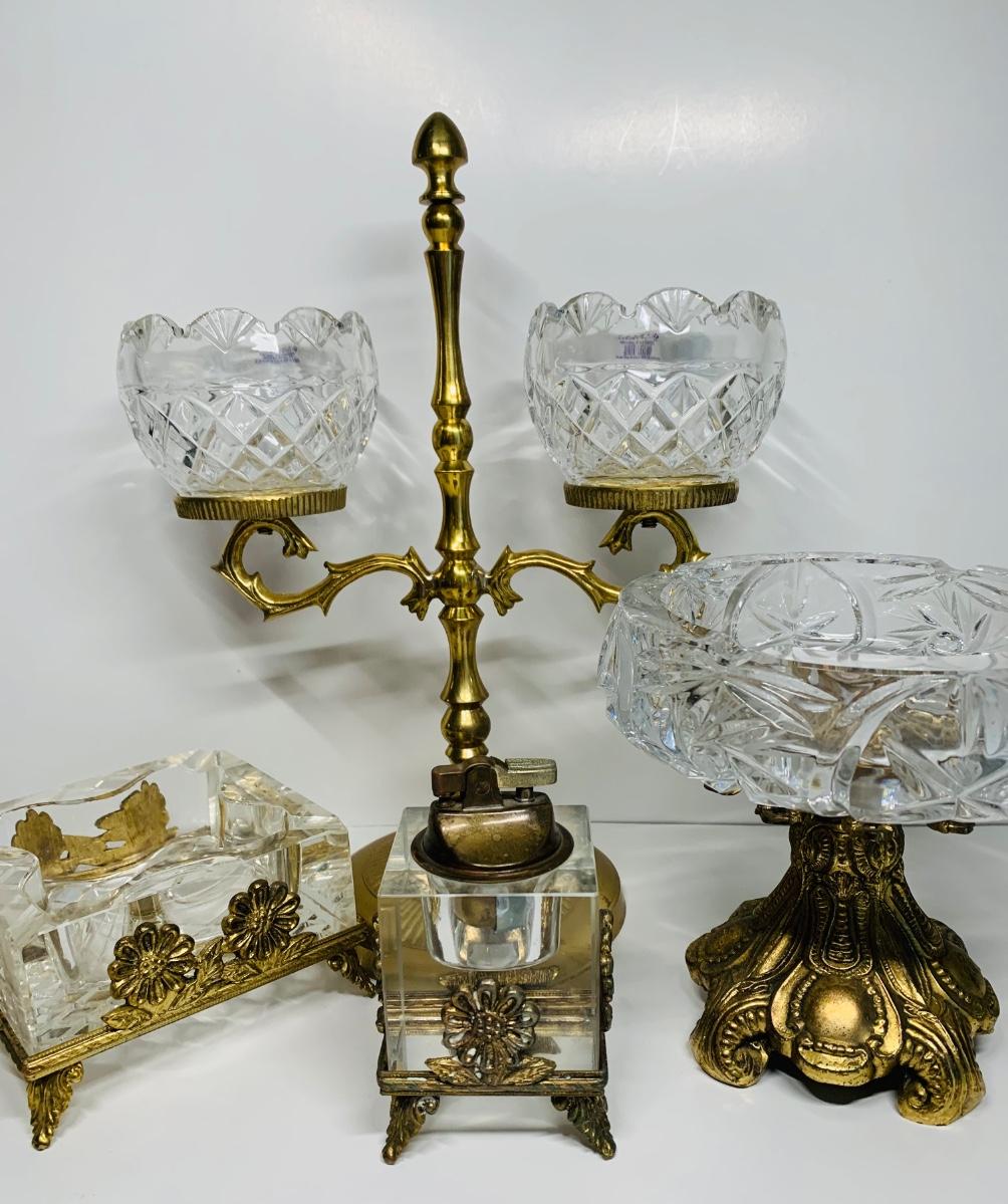 Great collection of glass & crystal including an ashtray, lighter, footed candy dish along with Royal Irish candle holders & stand. There are small flea bites on lighter bottom which are not noticeable when the lighter is in the stand.