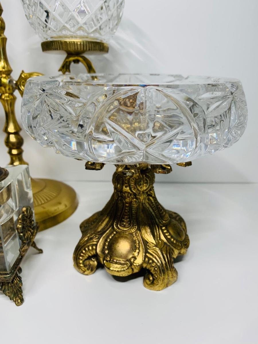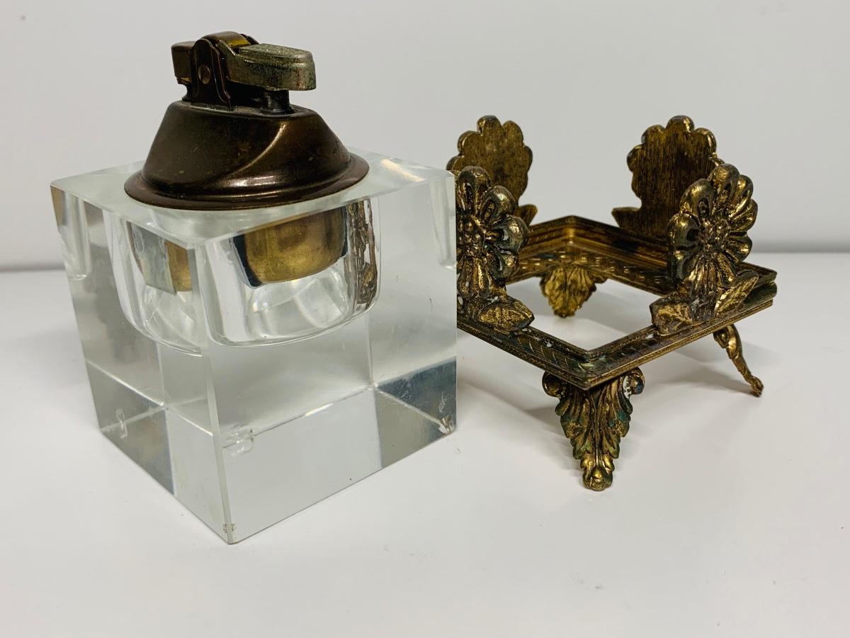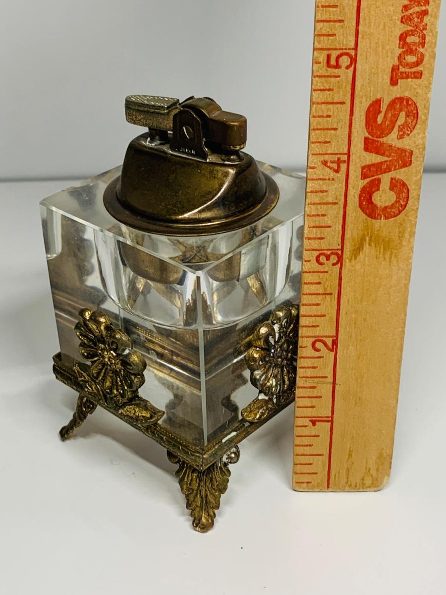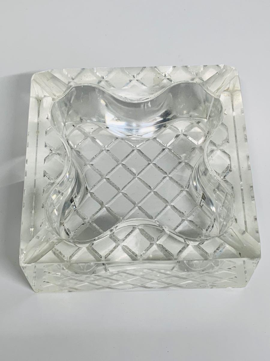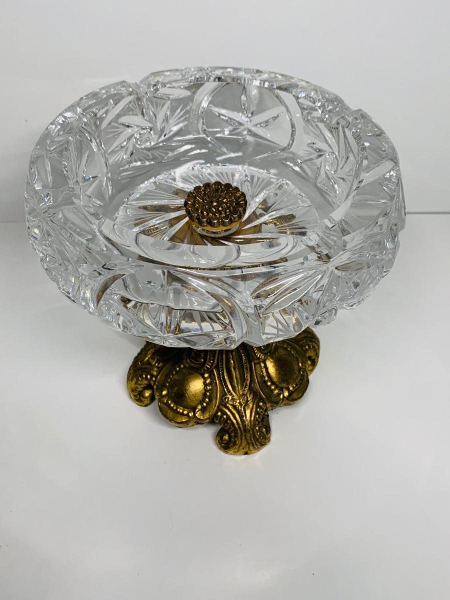 Great collection of glass & crystal including an ashtray, lighter, footed candy dish along with Royal Irish candle holders & stand. There are small flea bites on lighter bottom which are not noticeable when the lighter is in the stand.