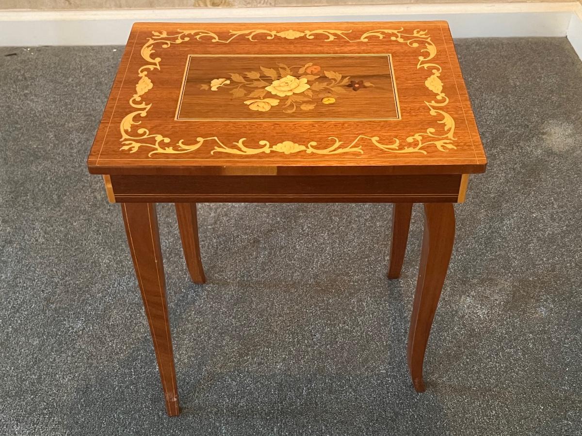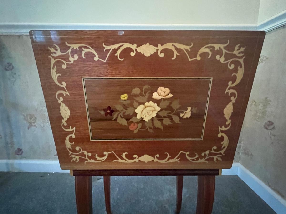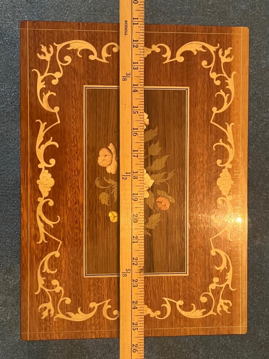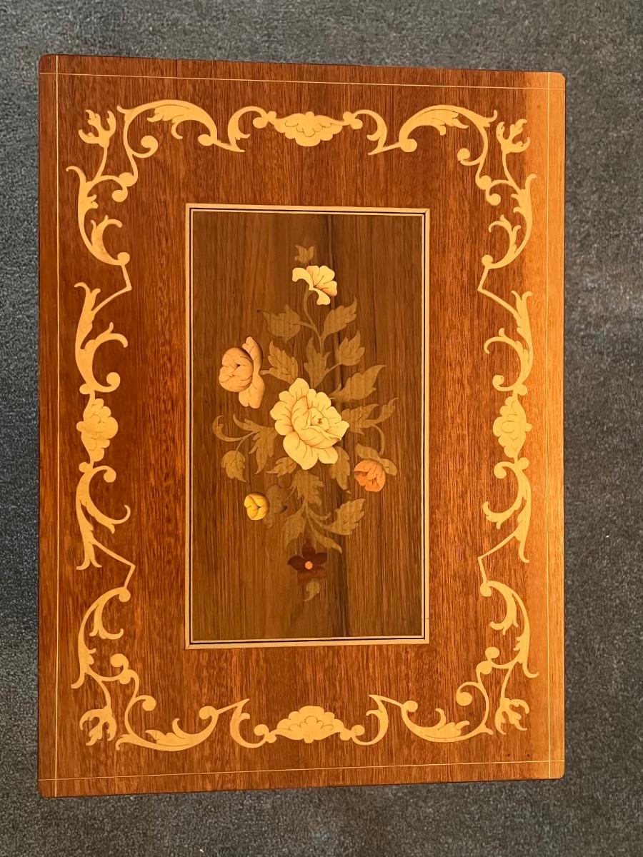 Musical jewelry box with floral inlay. This does have some minor wear to the wood as pics show. Please see all pictures as they are the best representation of the items. The pictures show condition, measurements if taken, and what is included in the lot. Due to the large amount that we photograph and the time frame, we are not always able to take measurements. All items unless noted, are pre-owned and have been used. If you purchased furniture, you must bring help. We do not allow one person to carry large furniture out on their own. Bring help, tools and a truck for the safety of our client’s homes, and your personal safety. Any damages that result to the property including walls, and floors due to moving of the furniture will be charged to the buyer. Company policy. Thank you.