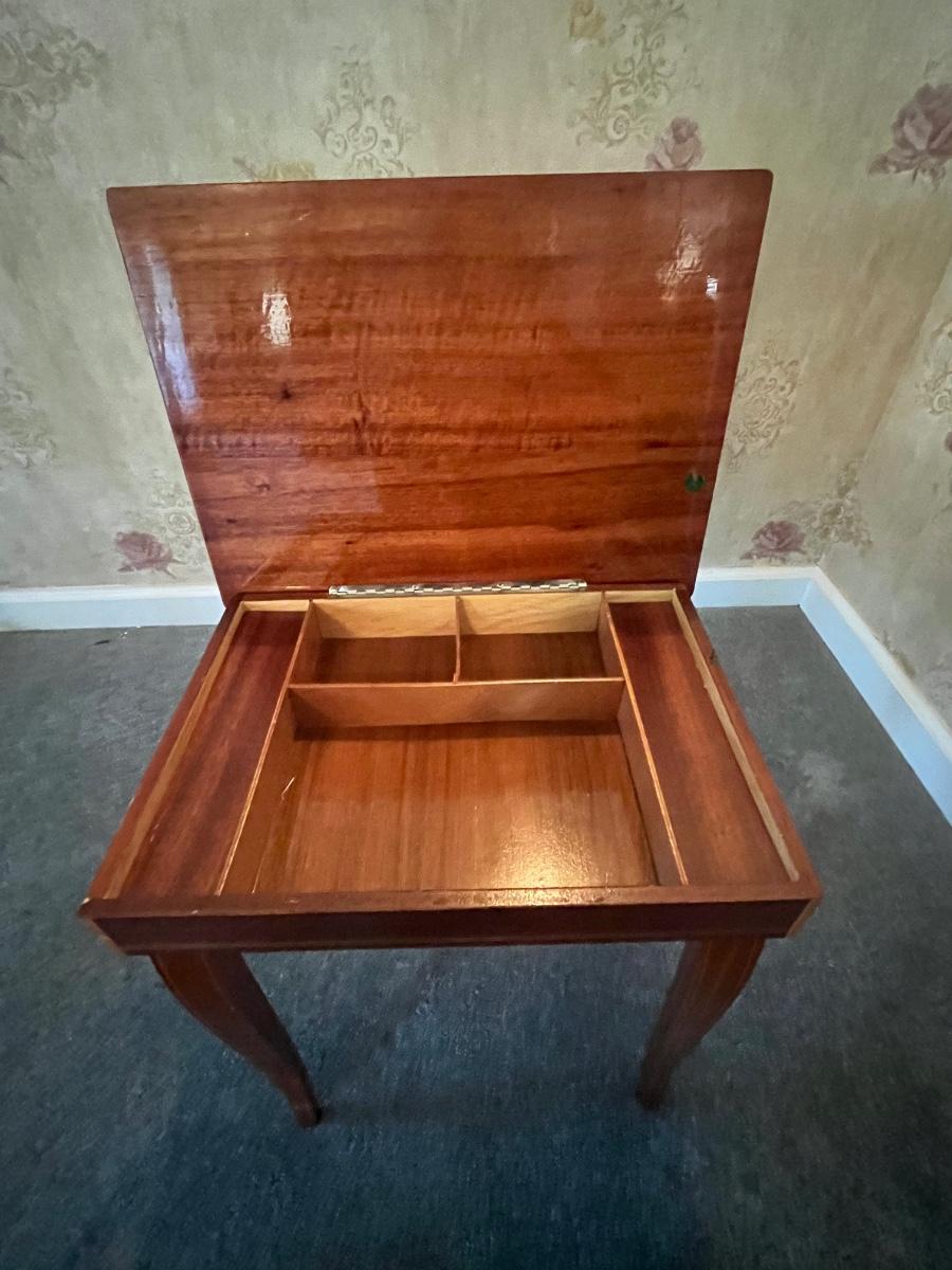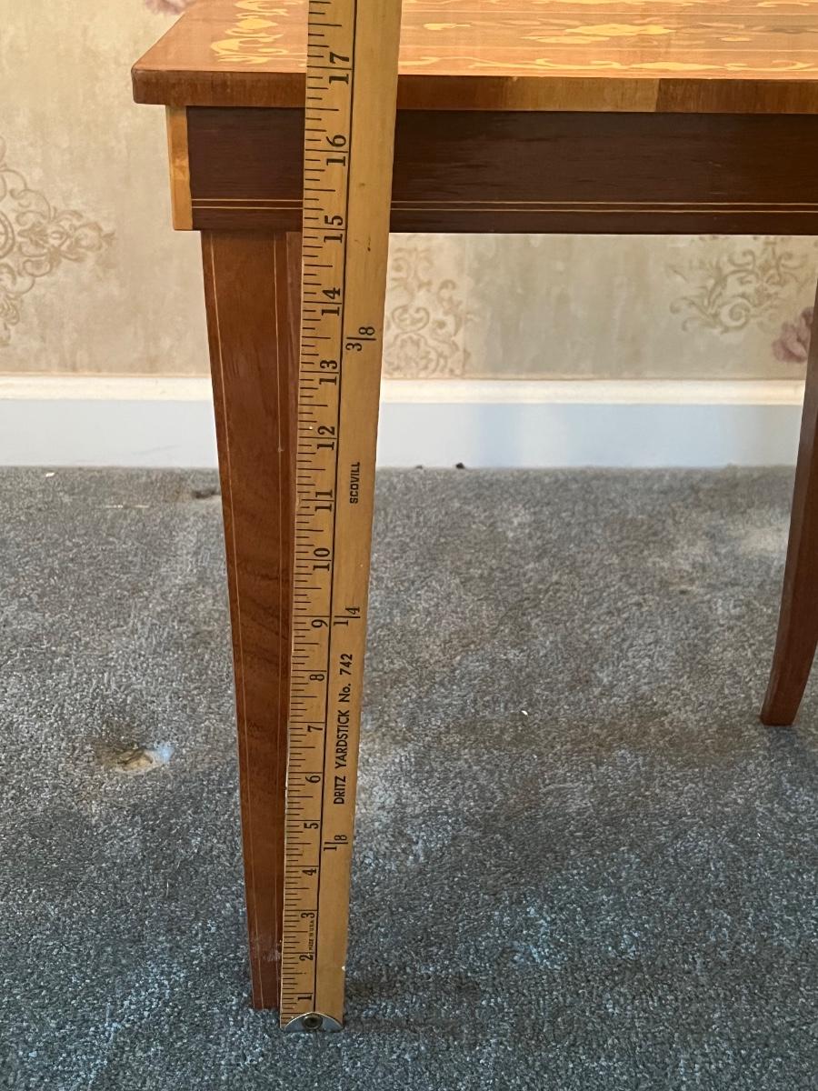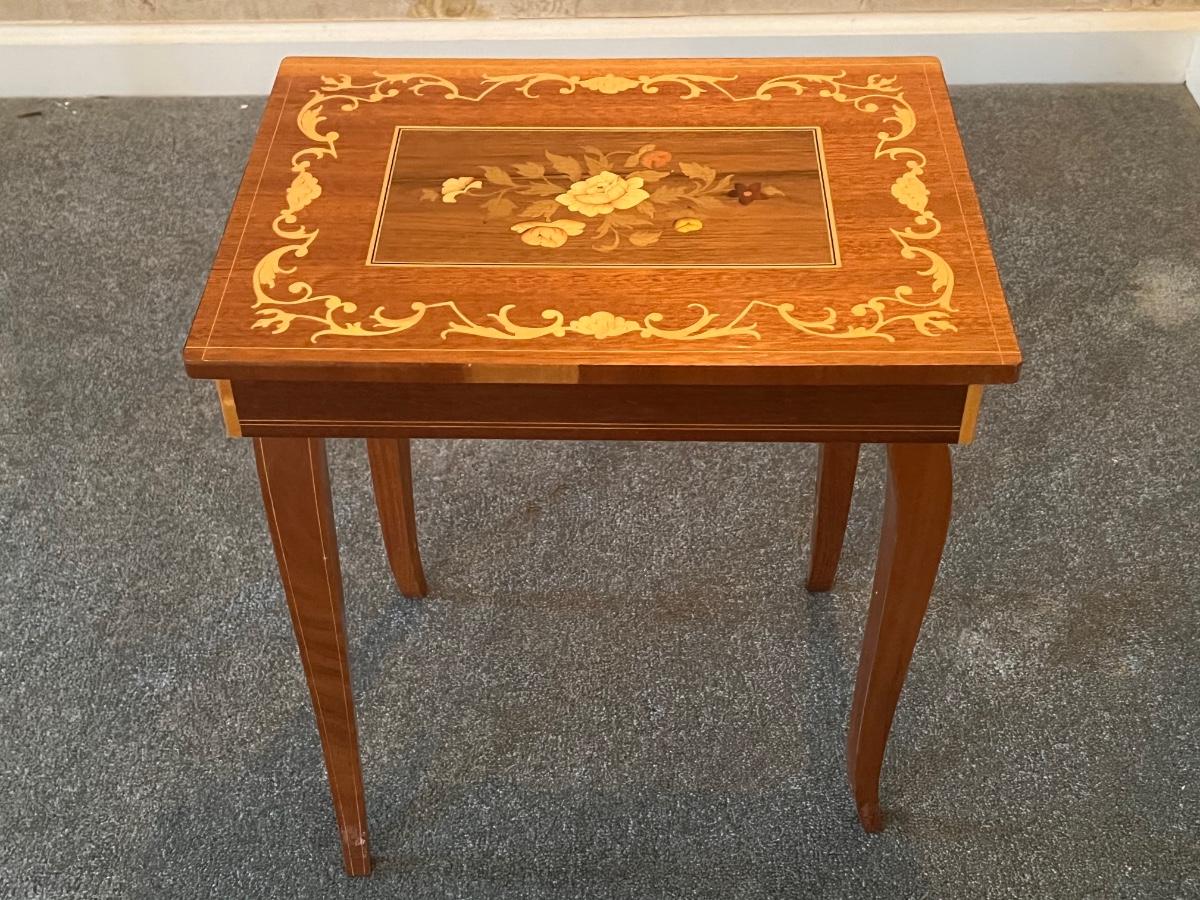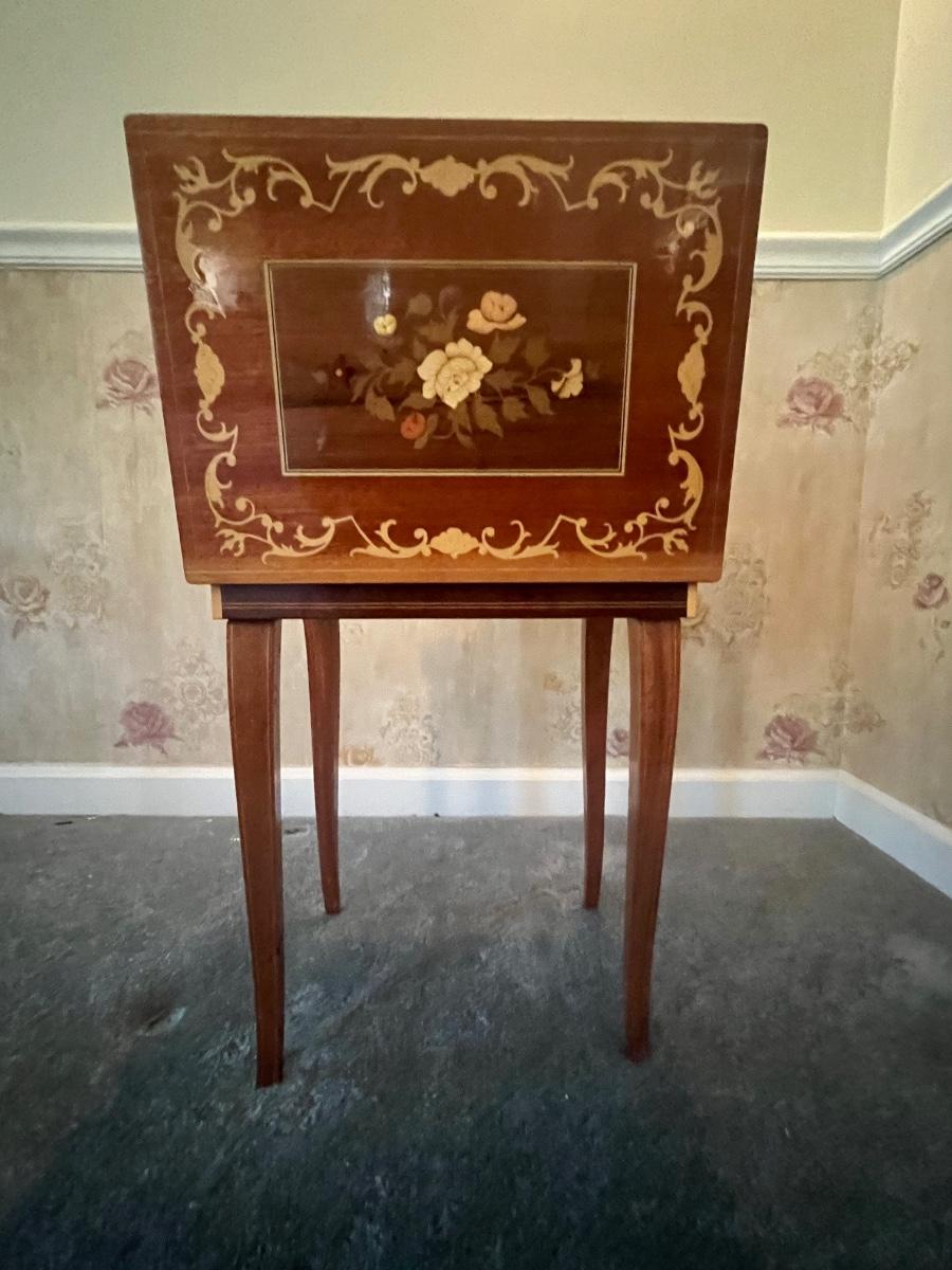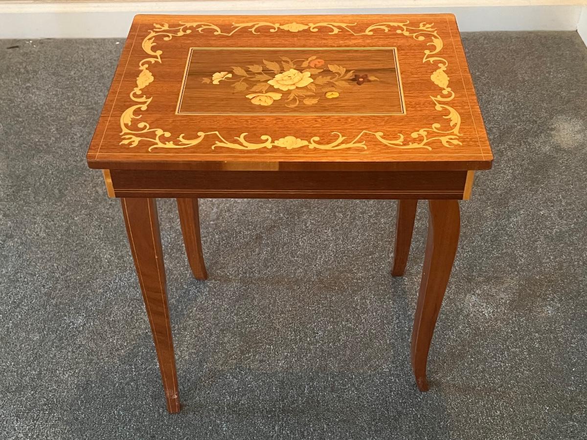 Musical jewelry box with floral inlay. This does have some minor wear to the wood as pics show. Please see all pictures as they are the best representation of the items. The pictures show condition, measurements if taken, and what is included in the lot. Due to the large amount that we photograph and the time frame, we are not always able to take measurements. All items unless noted, are pre-owned and have been used. If you purchased furniture, you must bring help. We do not allow one person to carry large furniture out on their own. Bring help, tools and a truck for the safety of our client’s homes, and your personal safety. Any damages that result to the property including walls, and floors due to moving of the furniture will be charged to the buyer. Company policy. Thank you.