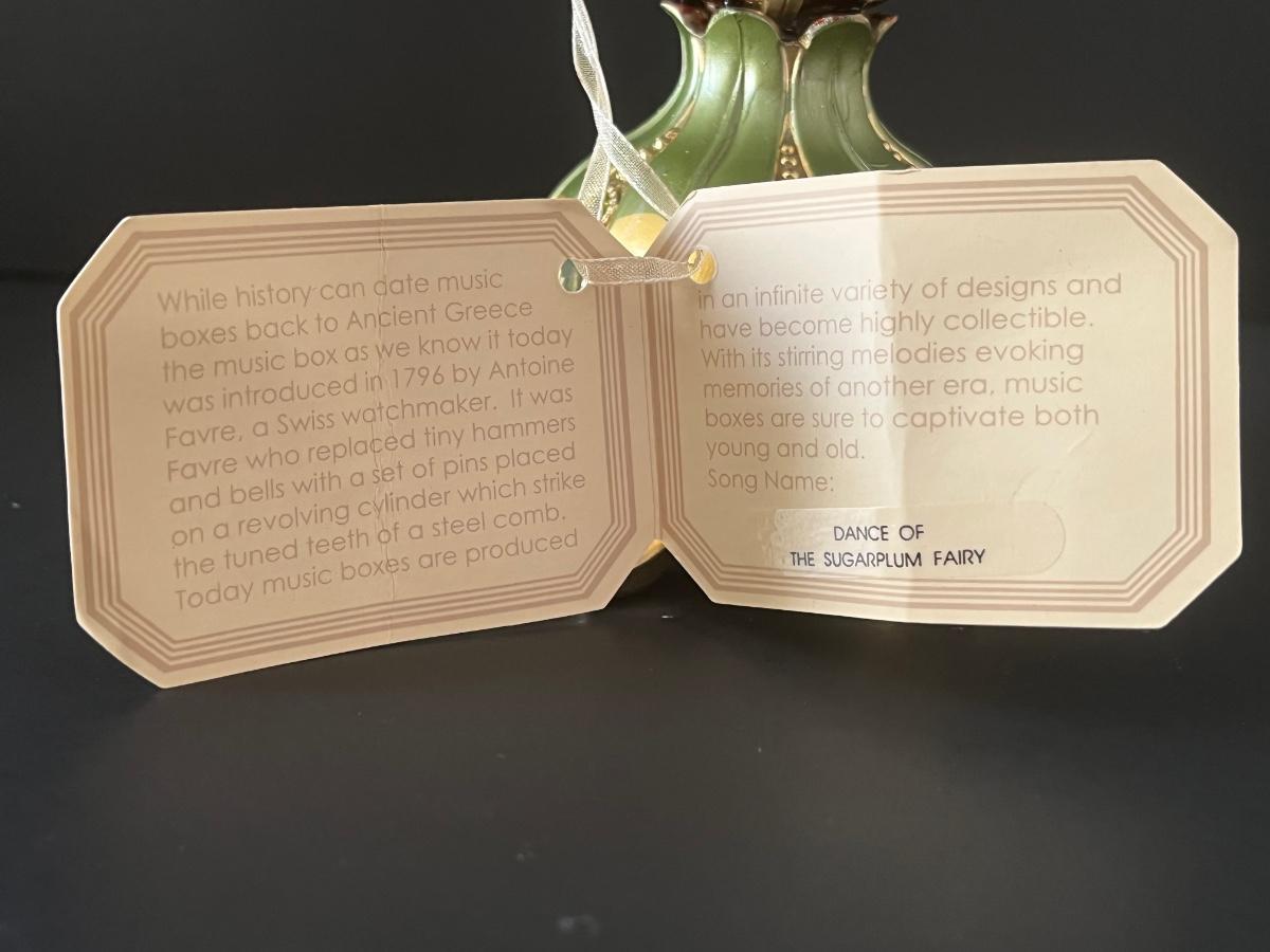 Beautiful music box with two sides that open and plays "dance of the sugarplum fairy". Please see all pictures as they are the best representation of the items. The pictures show condition, measurements if taken, and what is included in the lot. Due to the large amount that we photograph and the time frame, we are not always able to take measurements. All items unless noted, are pre-owned and have been used. If you purchased furniture, you must bring help. We do not allow one person to carry large furniture out on their own. Bring help, tools and a truck for the safety of our client’s homes, and your personal safety. Any damages that result to the property including walls, and floors due to moving of the furniture will be charged to the buyer. Company policy. Thank you.