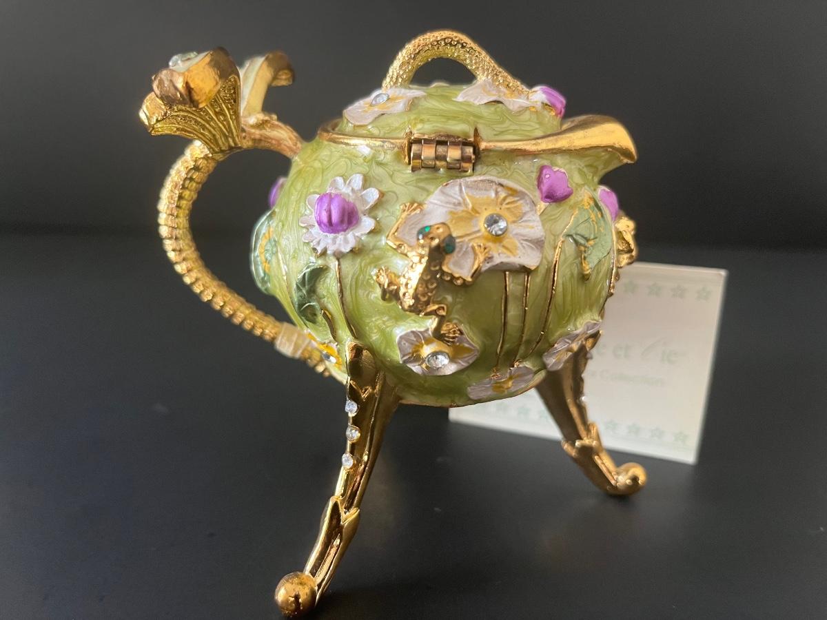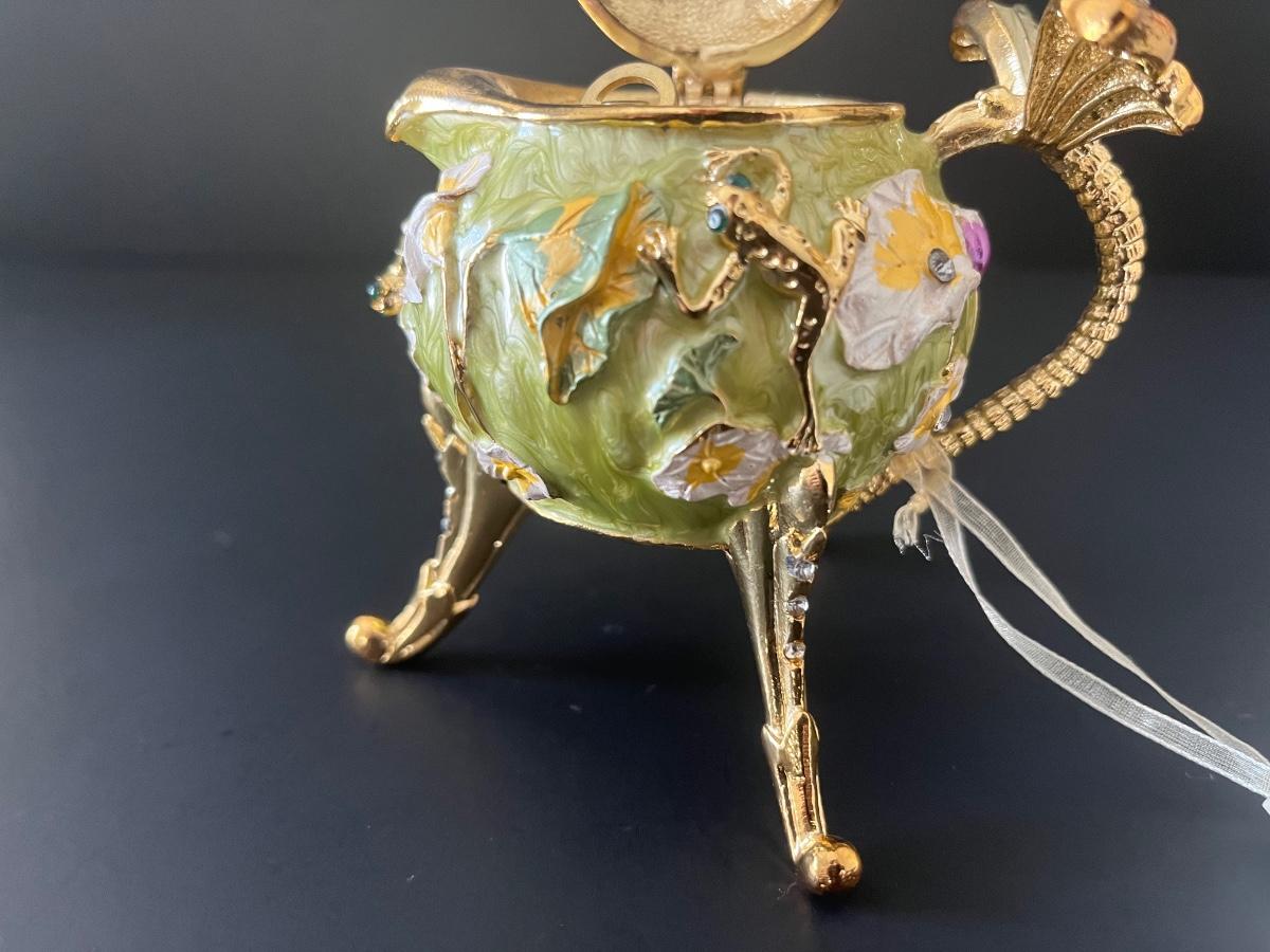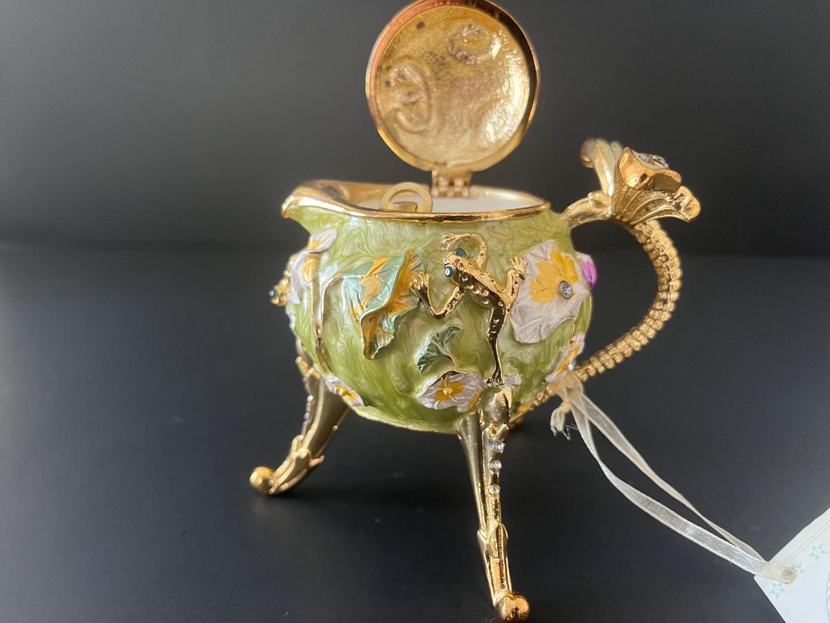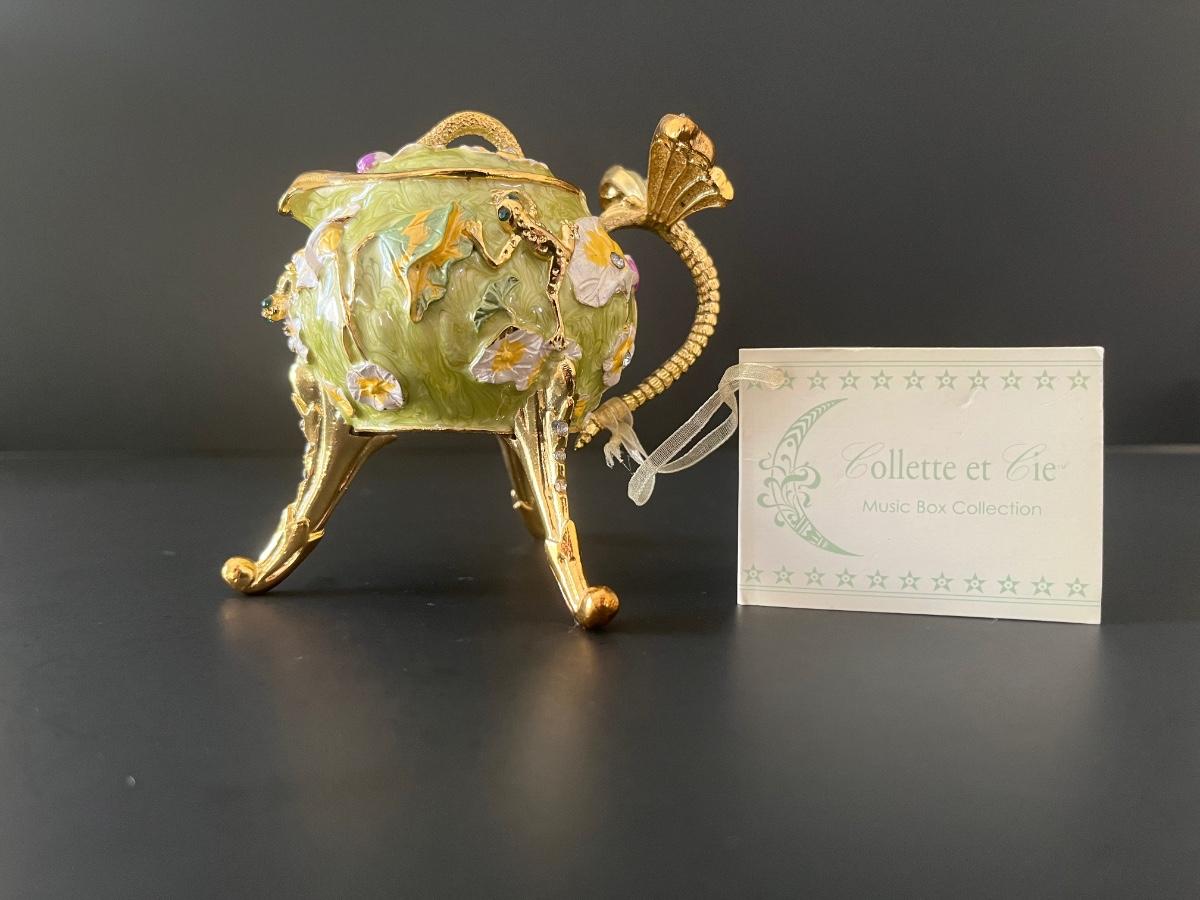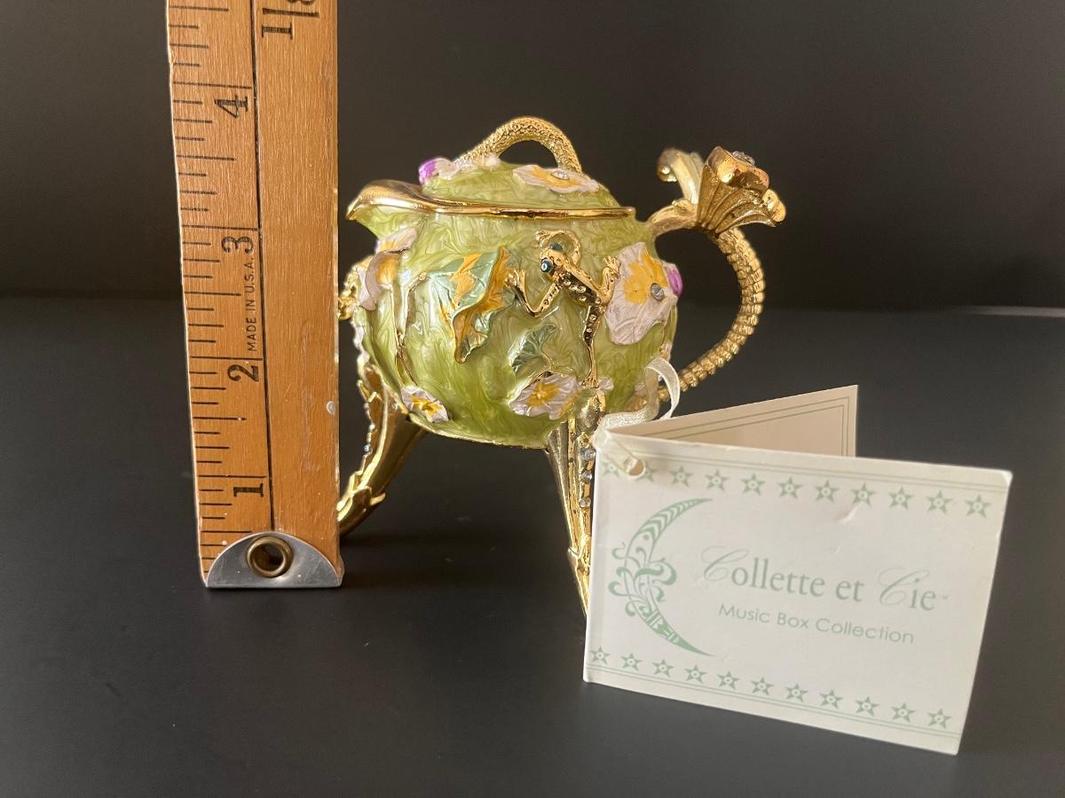 Vintage teapot music box, plays "the spring". Please see all pictures as they are the best representation of the items. The pictures show condition, measurements if taken, and what is included in the lot. Due to the large amount that we photograph and the time frame, we are not always able to take measurements. All items unless noted, are pre-owned and have been used. If you purchased furniture, you must bring help. We do not allow one person to carry large furniture out on their own. Bring help, tools and a truck for the safety of our client’s homes, and your personal safety. Any damages that result to the property including walls, and floors due to moving of the furniture will be charged to the buyer. Company policy. Thank you.