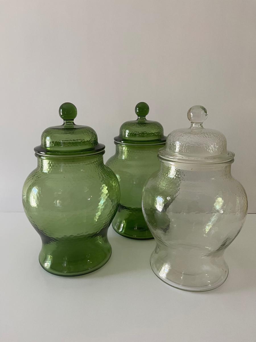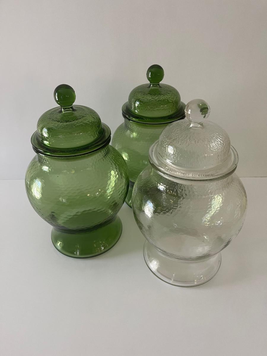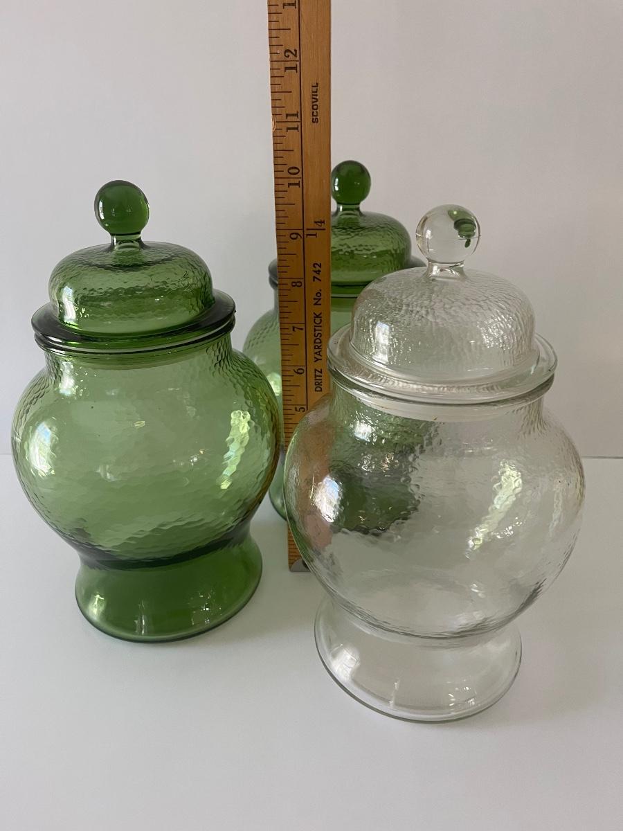 Two vintage green jars and one clear jar with lids. Great for storage in kitchen or accent decor jars.
