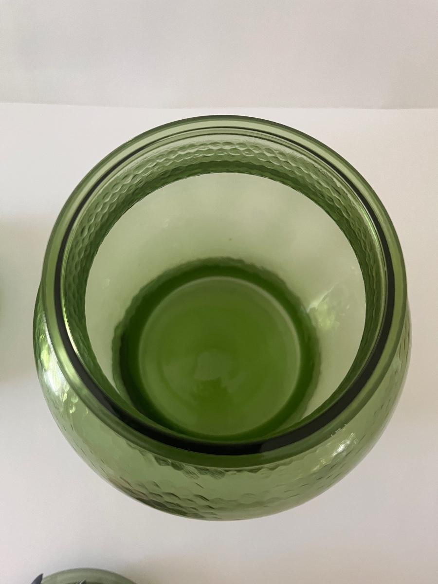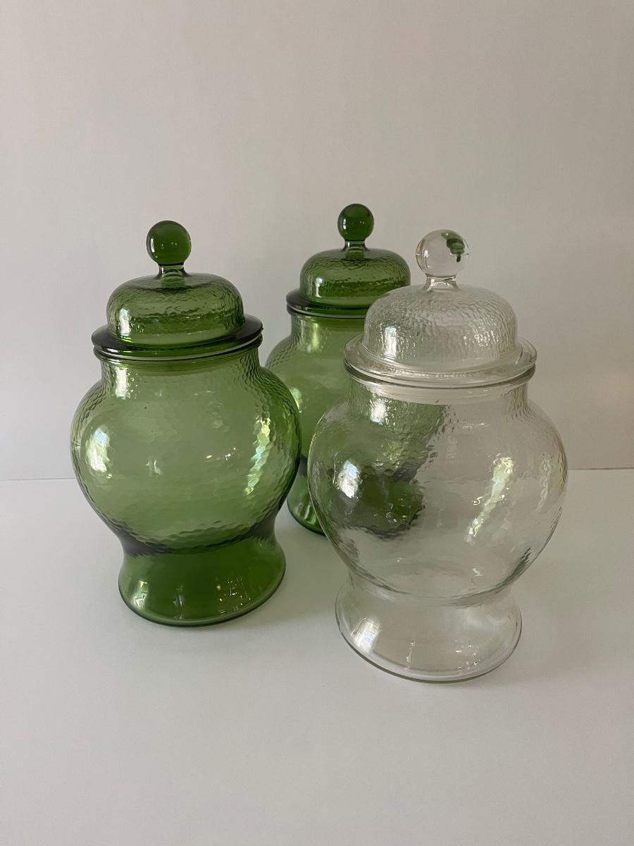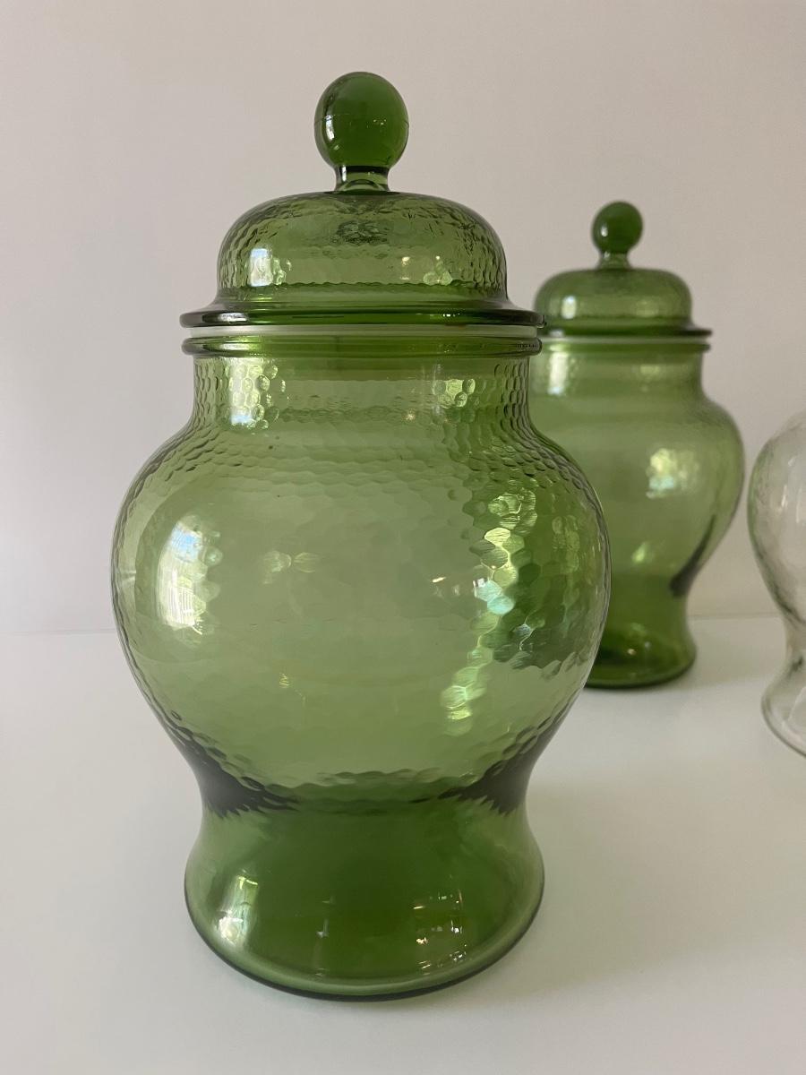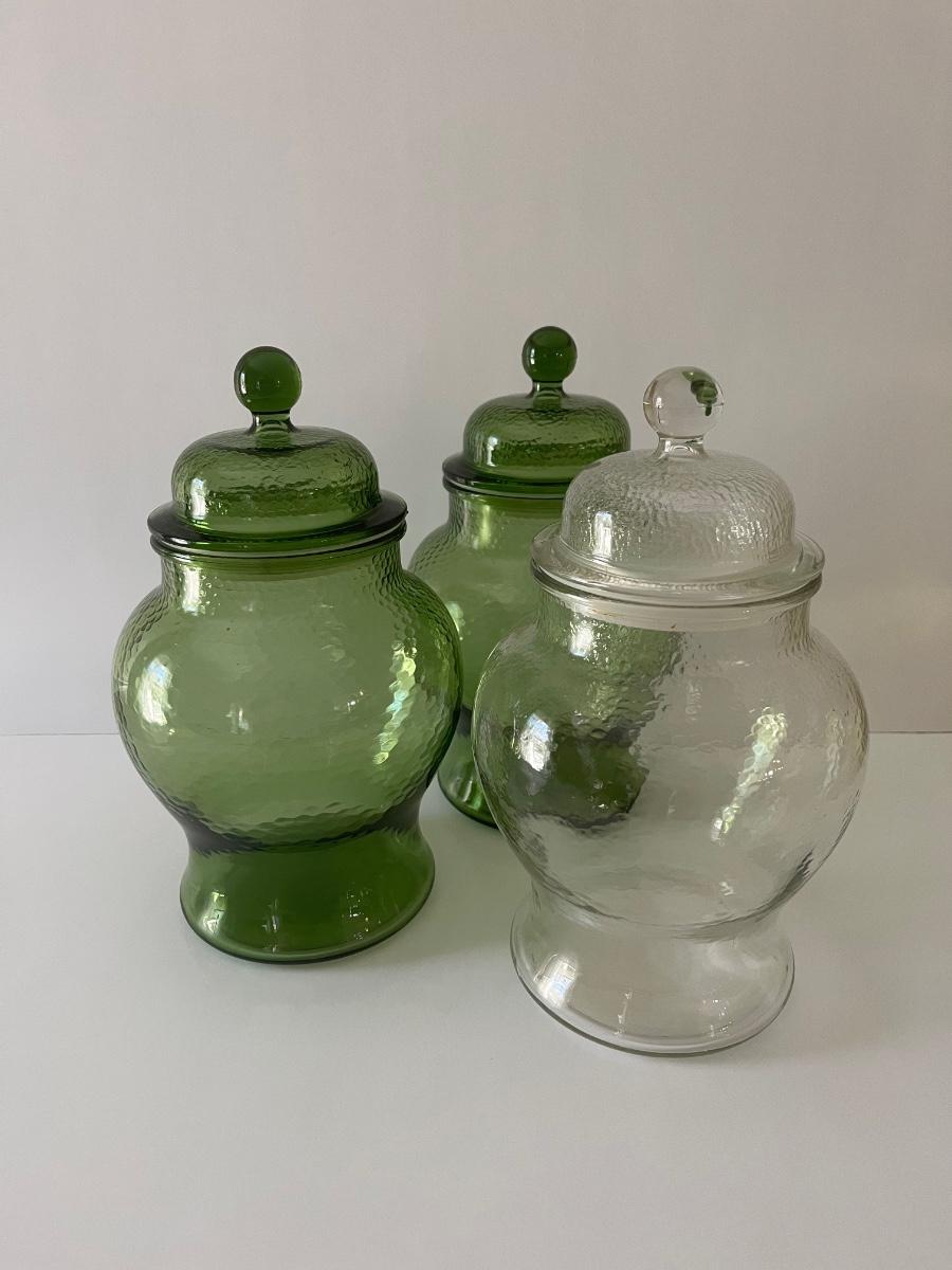 Two vintage green jars and one clear jar with lids. Great for storage in kitchen or accent decor jars.