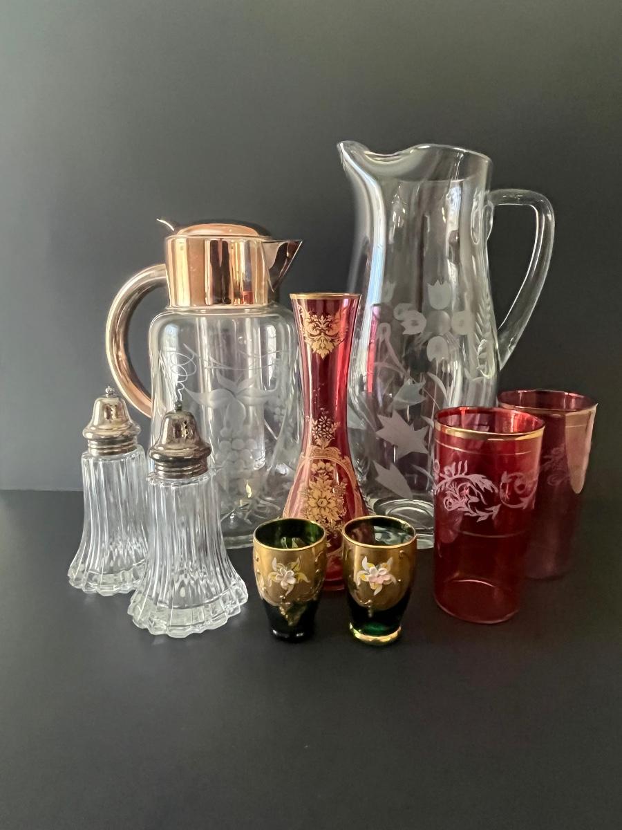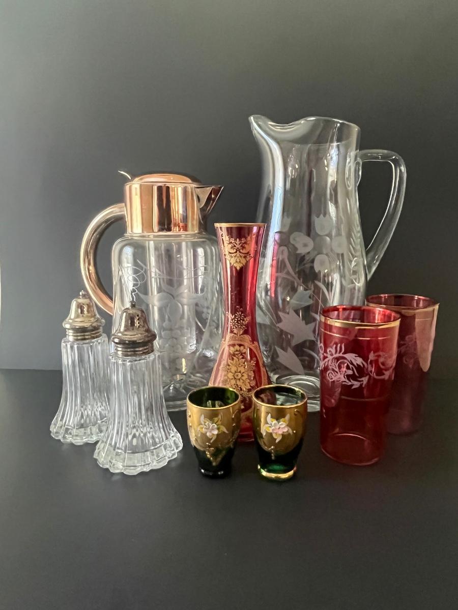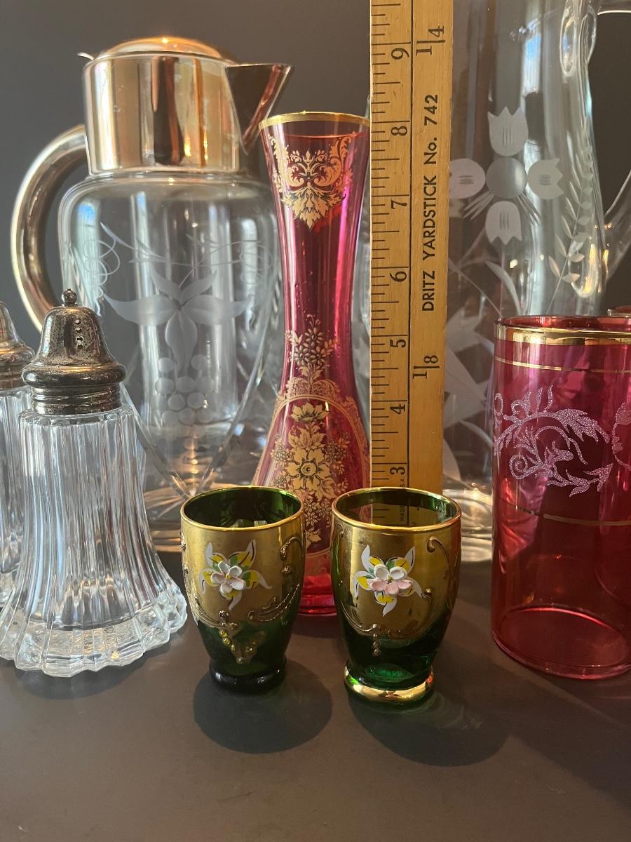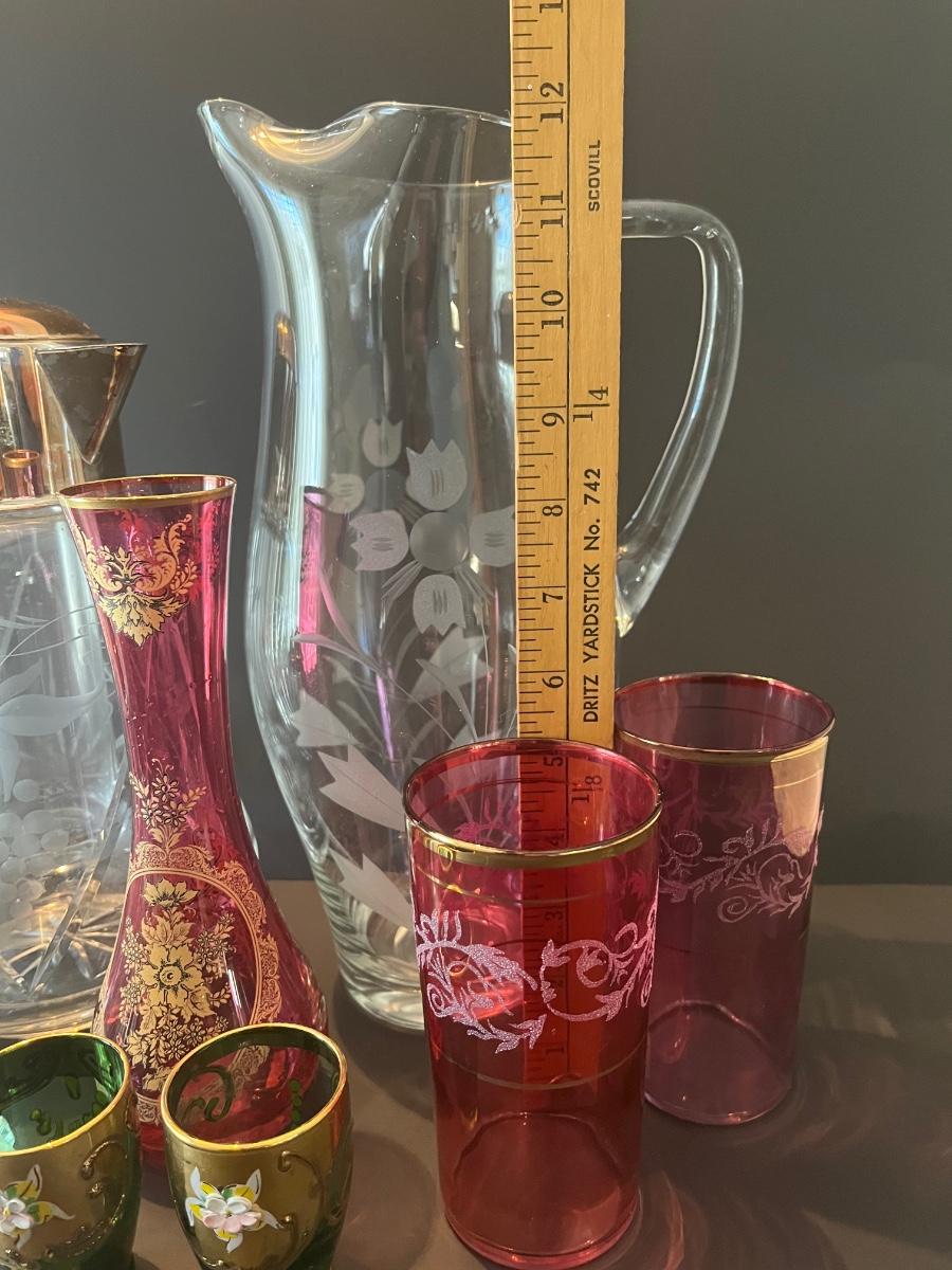 This collection includes two exquisite etched glass pitchers, one with a silver top and ice core, two colored beverage glasses, a red bud vase, green/gold shot glasses, and S&P shakers. Please see all pictures as they are the best representation of the items. The pictures show condition, measurements if taken, and what is included in the lot. Due to the large amount that we photograph and the time frame, we are not always able to take measurements. All items unless noted, are pre-owned and have been used. If you purchased furniture, you must bring help. We do not allow one person to carry large furniture out on their own. Bring help, tools and a truck for the safety of our client’s homes, and your personal safety. Any damages that result to the property including walls, and floors due to moving of the furniture will be charged to the buyer. Company policy. Thank you.