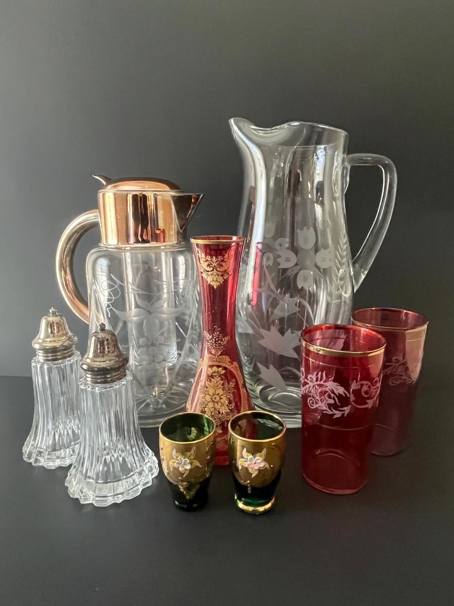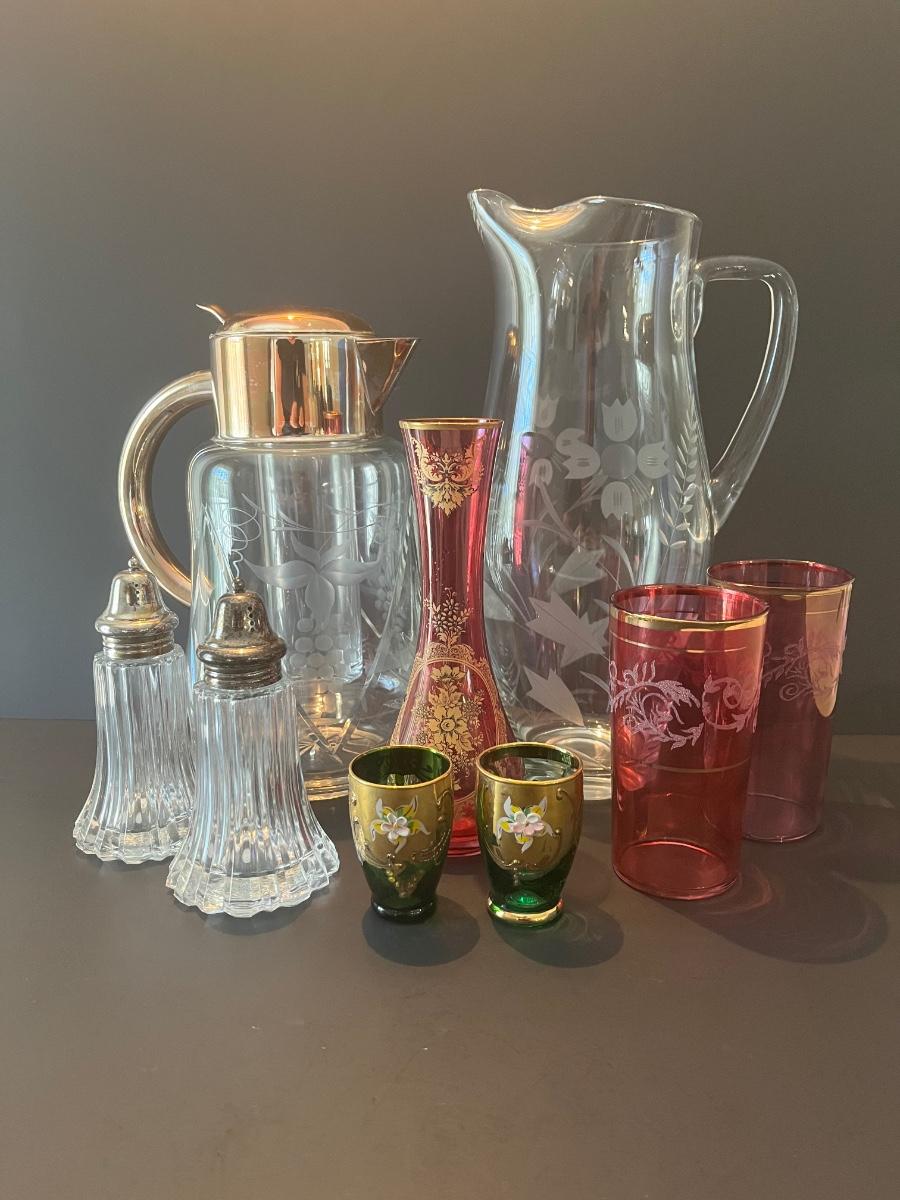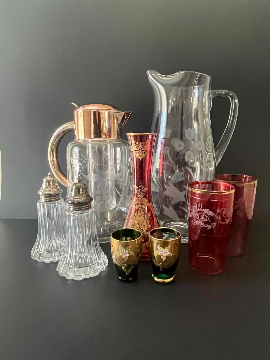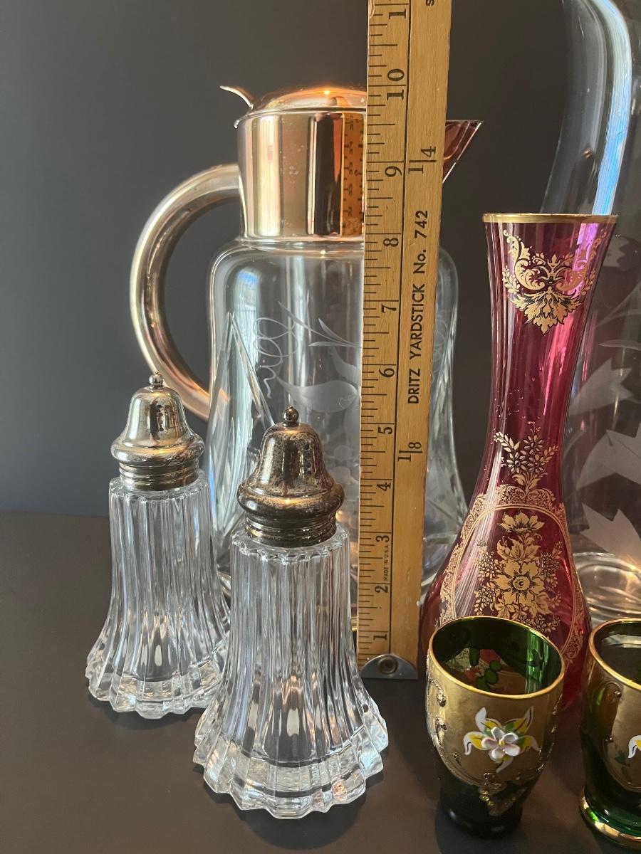 This collection includes two exquisite etched glass pitchers, one with a silver top and ice core, two colored beverage glasses, a red bud vase, green/gold shot glasses, and S&P shakers. Please see all pictures as they are the best representation of the items. The pictures show condition, measurements if taken, and what is included in the lot. Due to the large amount that we photograph and the time frame, we are not always able to take measurements. All items unless noted, are pre-owned and have been used. If you purchased furniture, you must bring help. We do not allow one person to carry large furniture out on their own. Bring help, tools and a truck for the safety of our client’s homes, and your personal safety. Any damages that result to the property including walls, and floors due to moving of the furniture will be charged to the buyer. Company policy. Thank you.